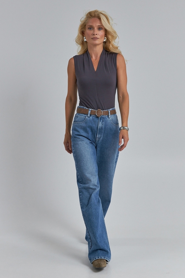 Елегантний боді, виготовлений із м’якої віскозної тканини з еластаном. V-подібний виріз і фігурний комірець позаду додають витонченості.