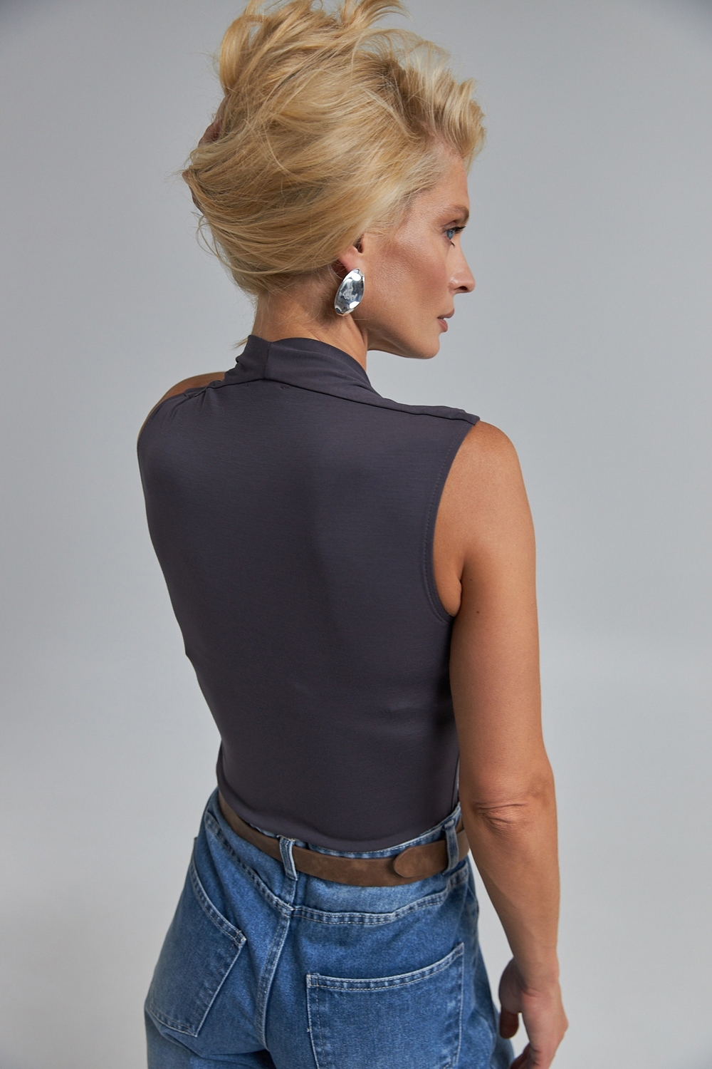 Елегантний боді, виготовлений із м’якої віскозної тканини з еластаном. V-подібний виріз і фігурний комірець позаду додають витонченості.