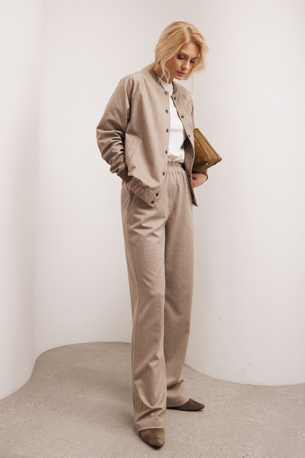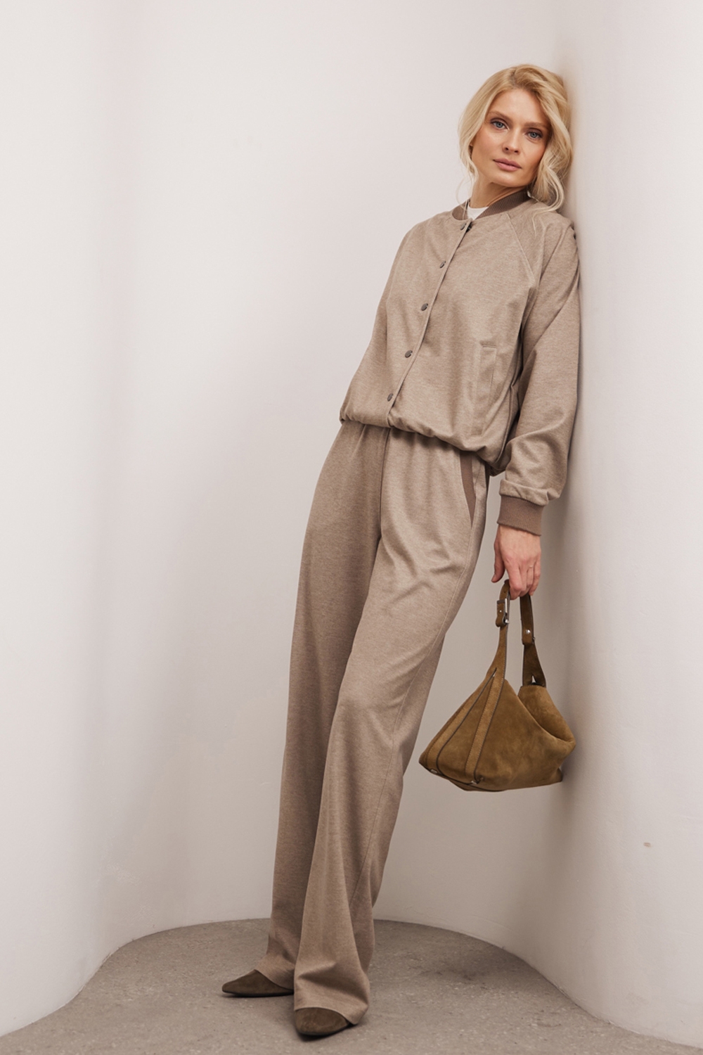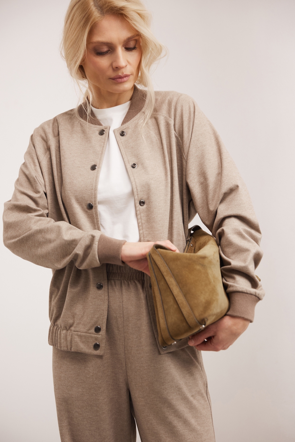Трендовий бомбер з віскозної тканини з додаванням бавовни. Модель у розслабленому стилі, оздоблений трикотажними манжетами на горловині та рукавах.