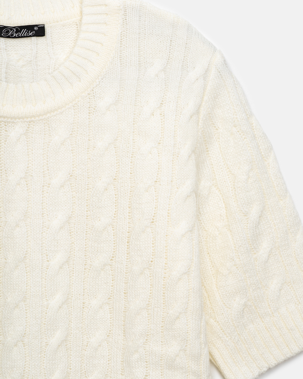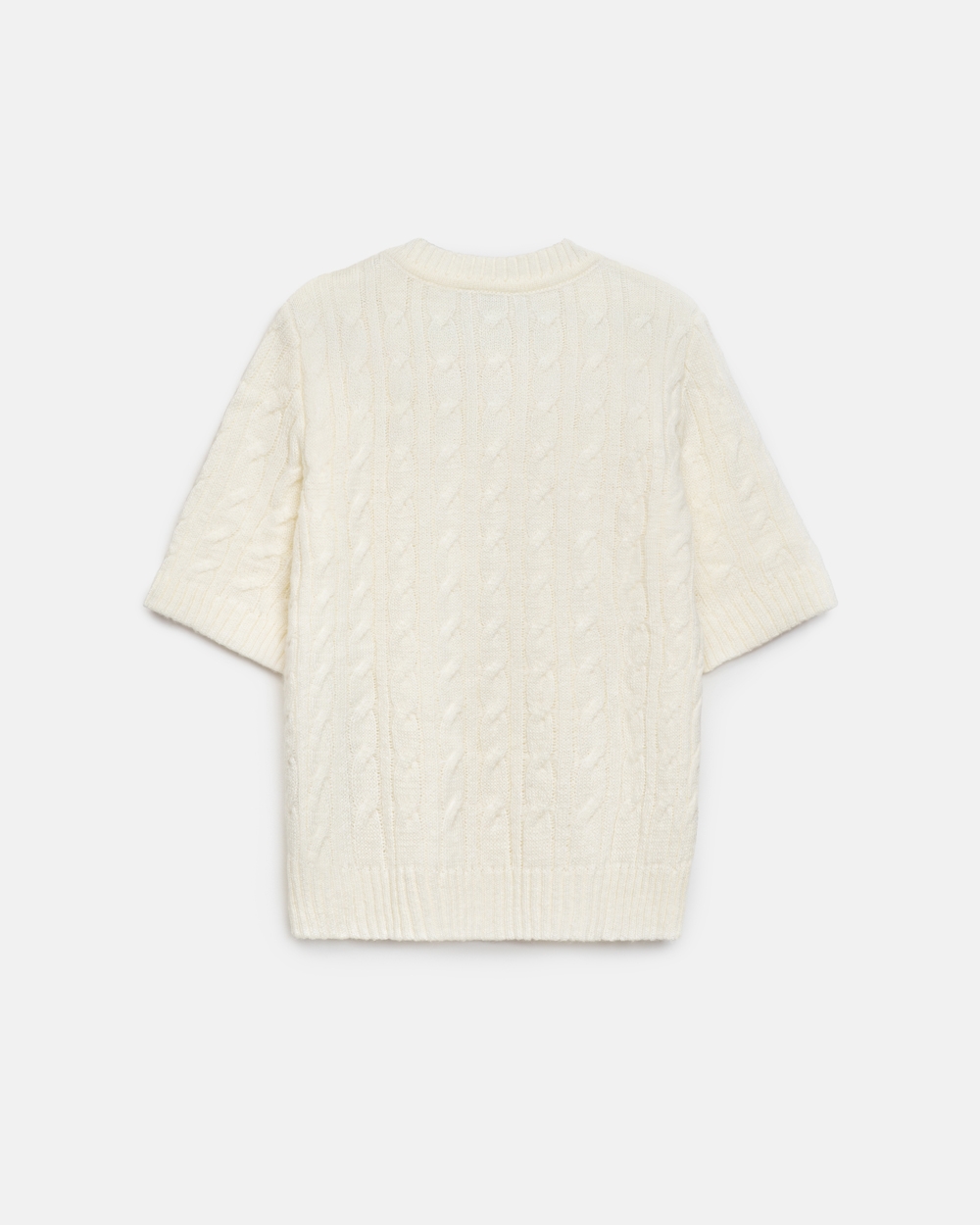 Джемпер з коротким рукавом з акцентним візерунком «коси». Модель м’яка на дотик і приємна до тіла, виготовлена з пряжі з додаванням вовни мериноса та альпаки.