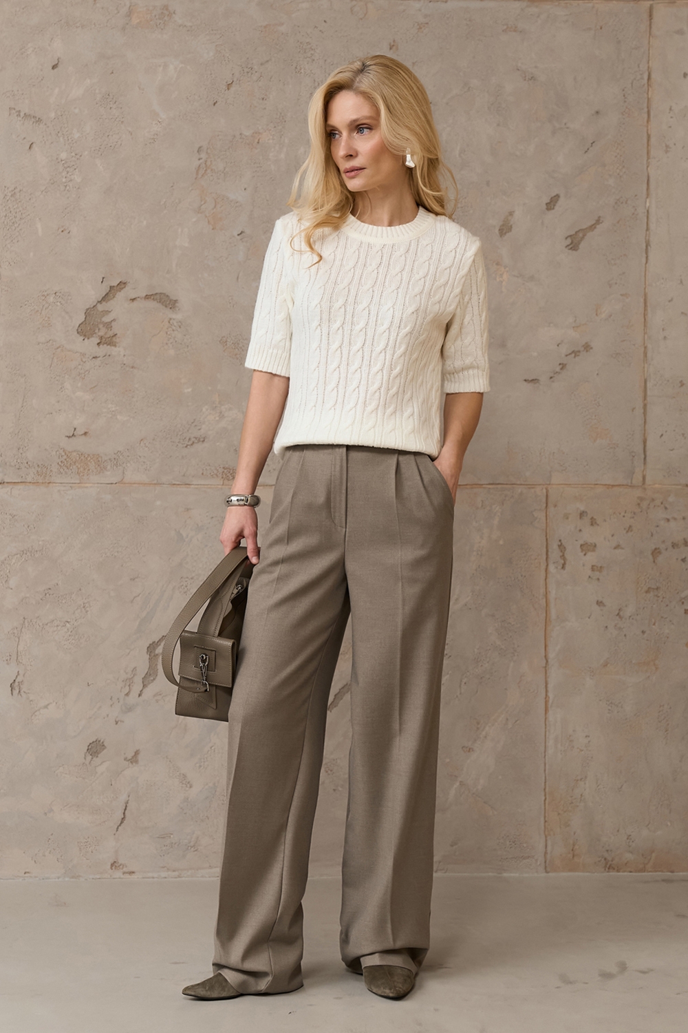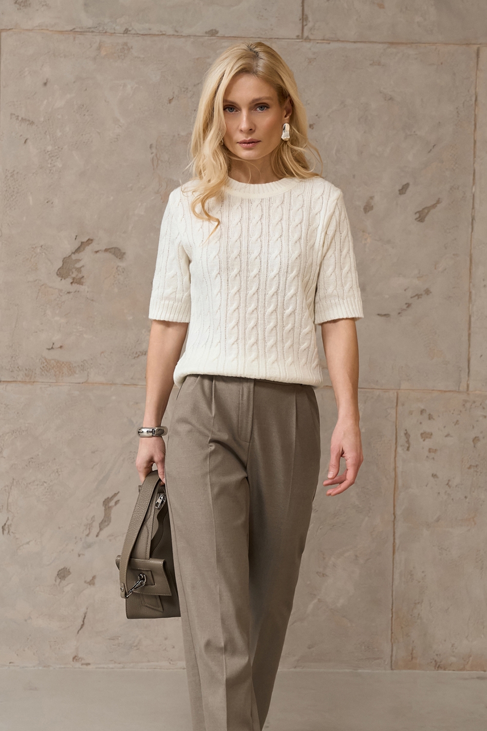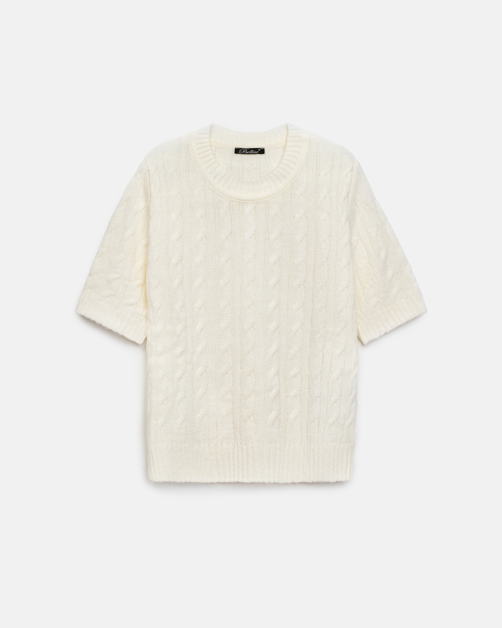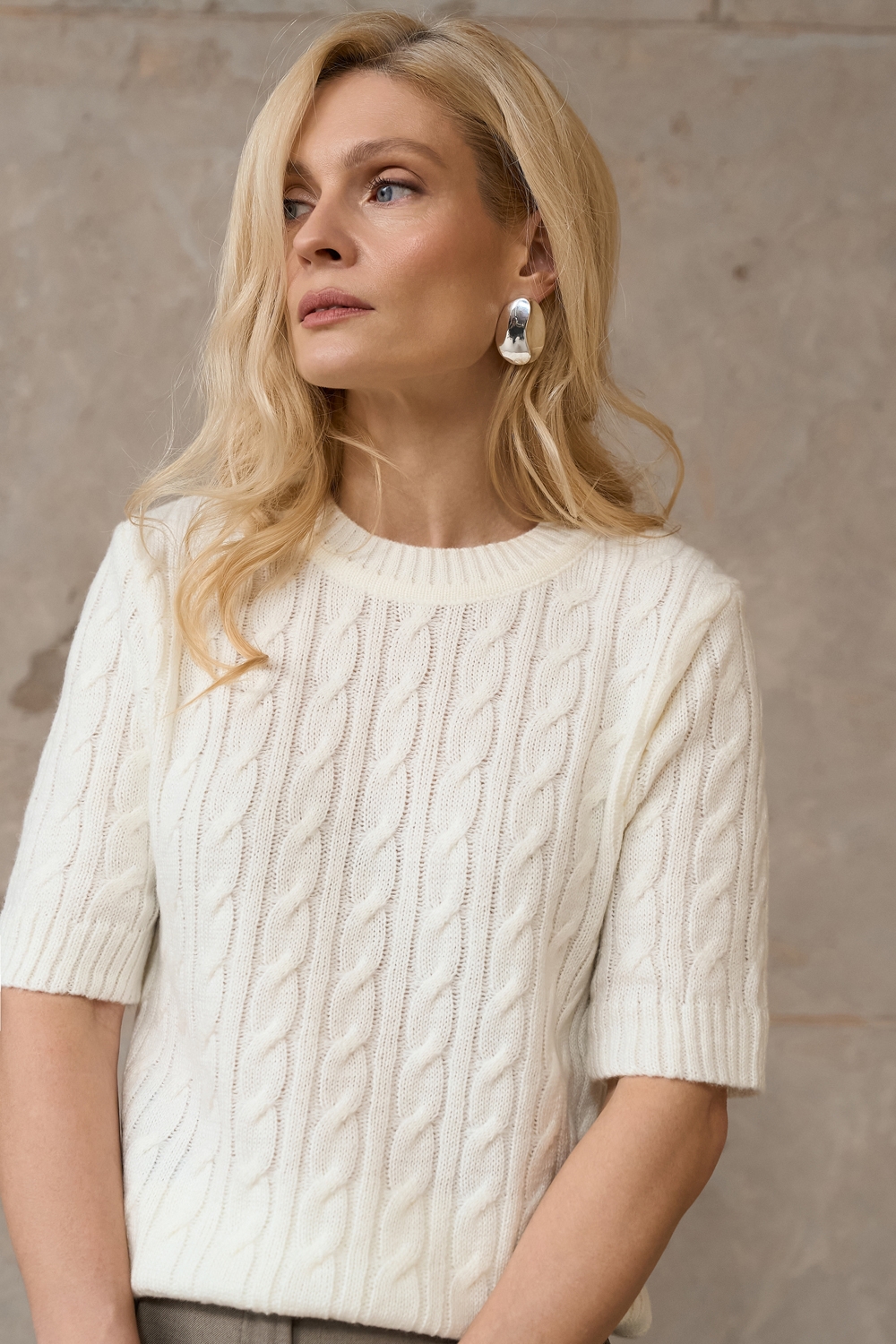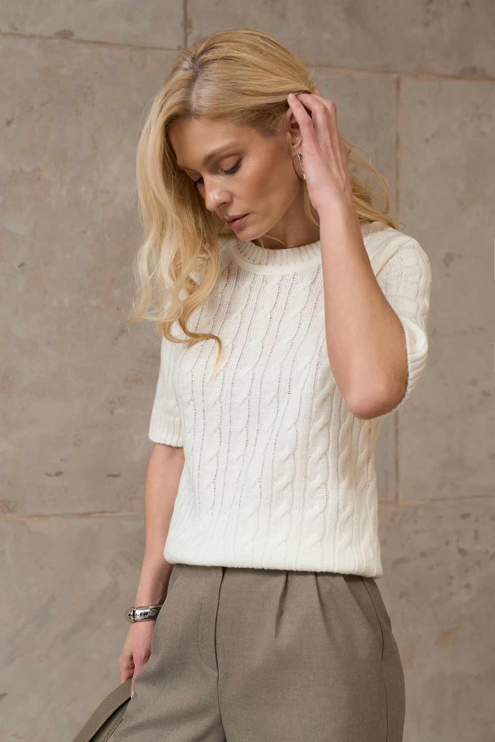 Джемпер з коротким рукавом з акцентним візерунком «коси». Модель м’яка на дотик і приємна до тіла, виготовлена з пряжі з додаванням вовни мериноса та альпаки.