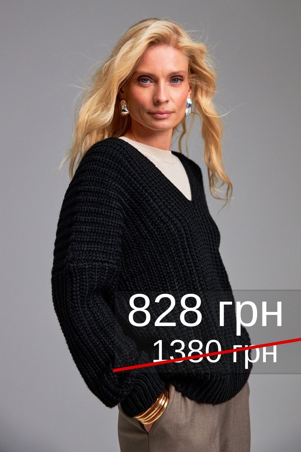 Актуальний джемпер оверсайз виконаний у теплій сумішевій пряжі. Модель лаконічного крою у фактурному, еластичному переплетенні має акцентний виріз V-подібної форми попереду та на спинці.
