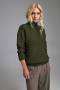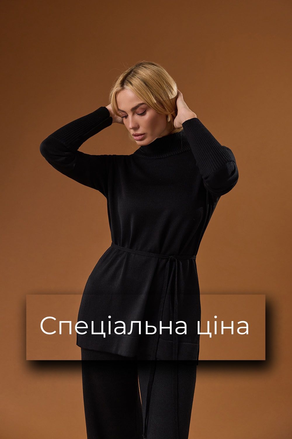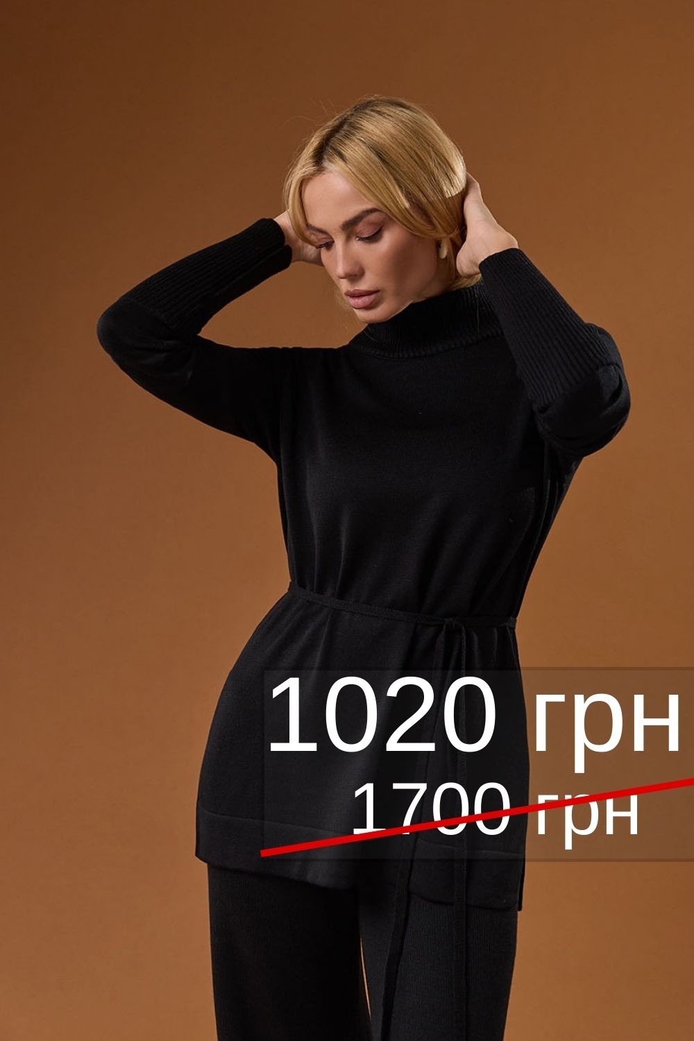 Подовжений вільний джемпер з тонкої шовковистої віскозної пряжі. Горловина оформлена невисокою еластичною стійкою, низи рукавів охайно обрамляють високі манжети.