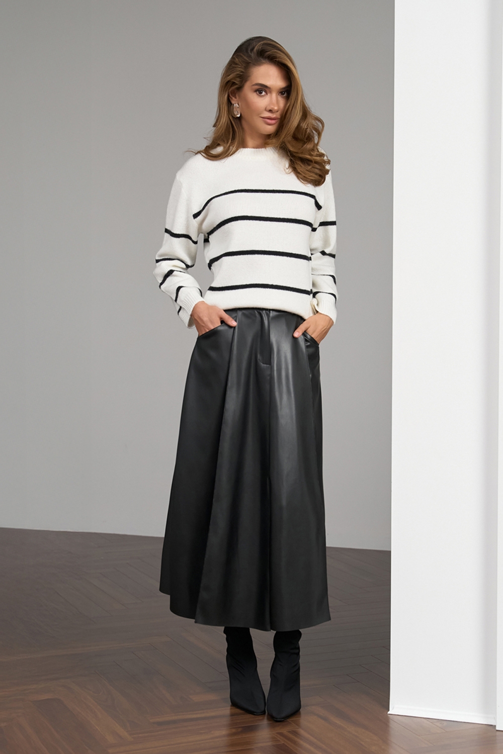 Джемпер у смужку з натуральної вовняної пряжі преміум якості. Гладке стабільне переплетіння, тонка в'язка.