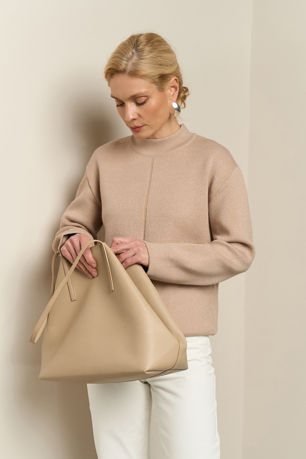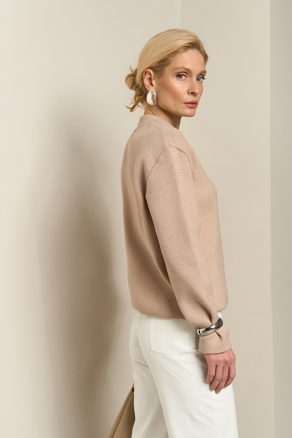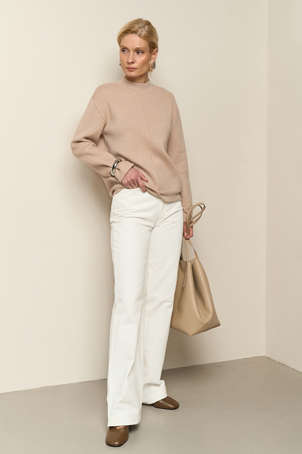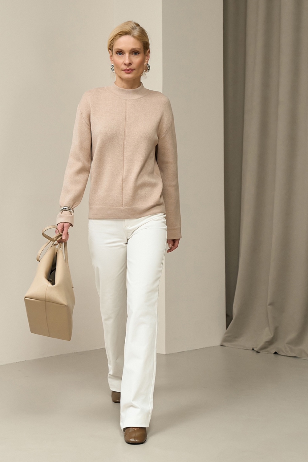 Джемпер вільного крою з м'якої та приємної до тіла пряжі із включенням еластану. Комфортна лінія плеча, охайний еластичний комір-стійка, розслаблені манжети по низу рукавів та виробу.