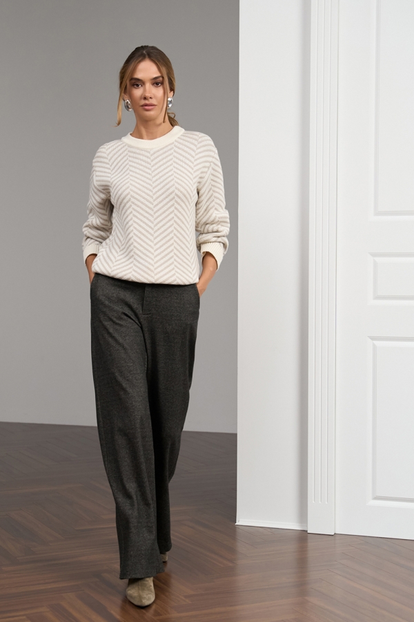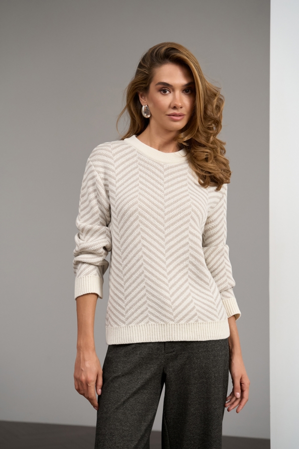 Подовжений джемпер з актуальним візерунком з преміальної вовняної пряжі. Фактурне плетіння, круглий виріз горловини, оздоблений планкою. Розслаблена декоративна охайна резинка на манжетах та по низу виробу.
