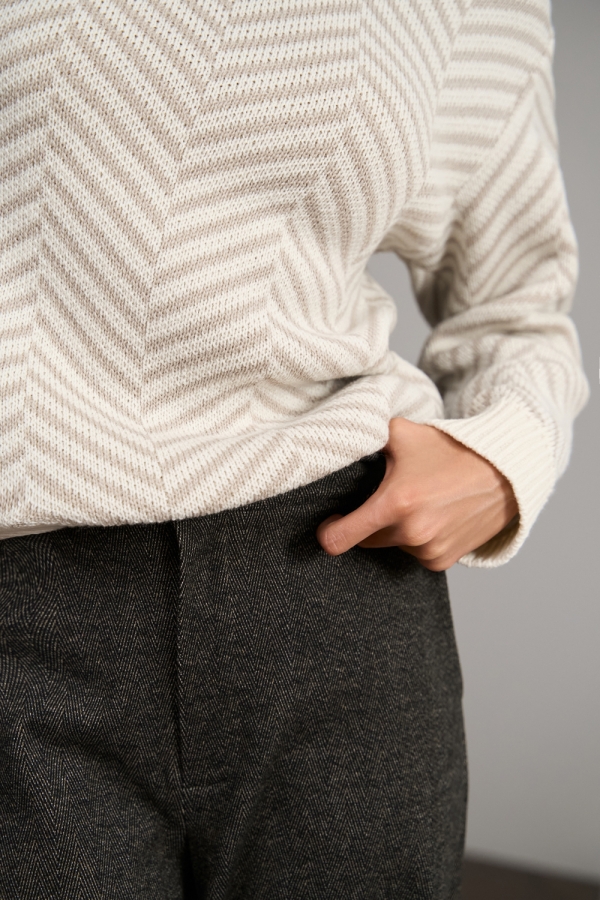 Подовжений джемпер з актуальним візерунком з преміальної вовняної пряжі. Фактурне плетіння, круглий виріз горловини, оздоблений планкою. Розслаблена декоративна охайна резинка на манжетах та по низу виробу.