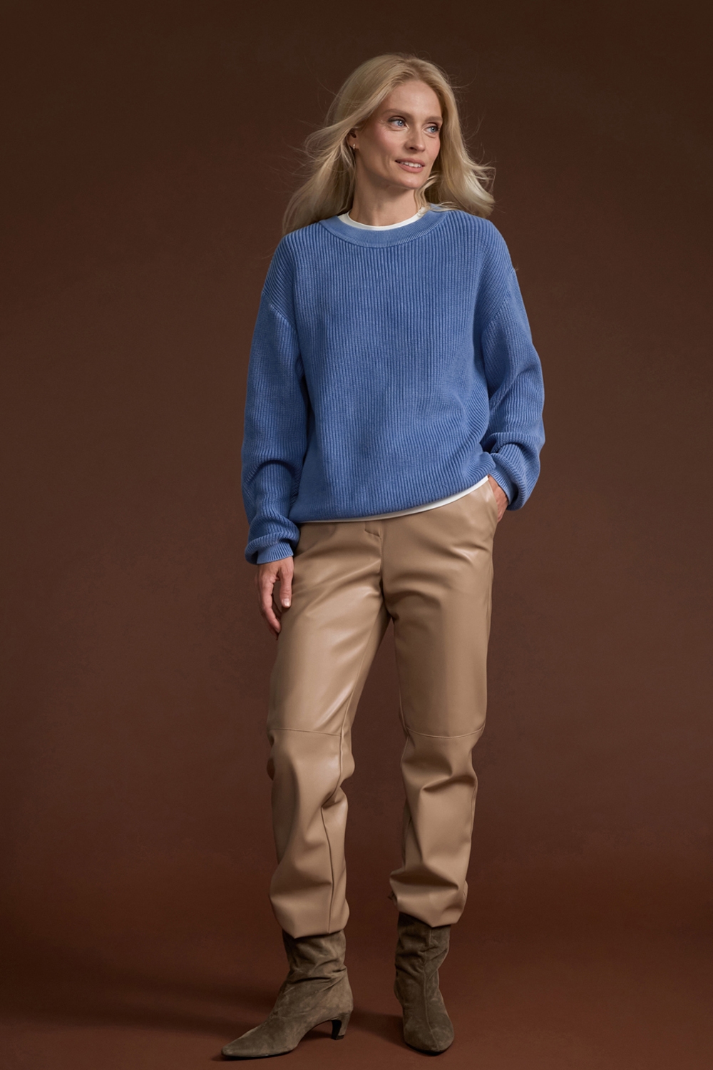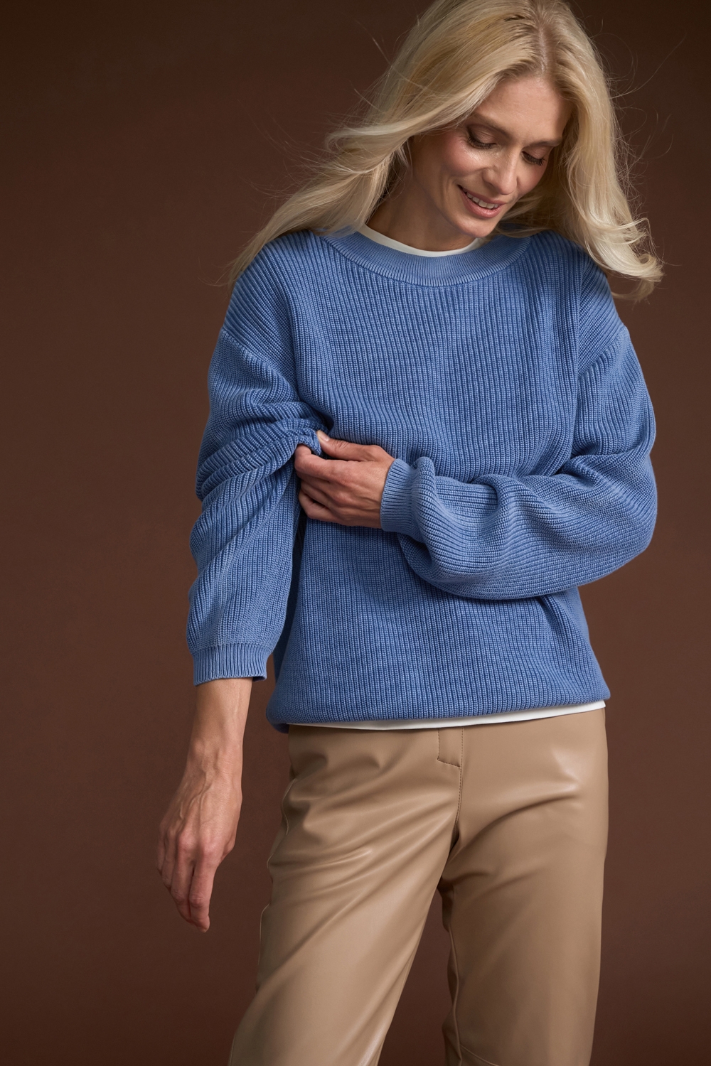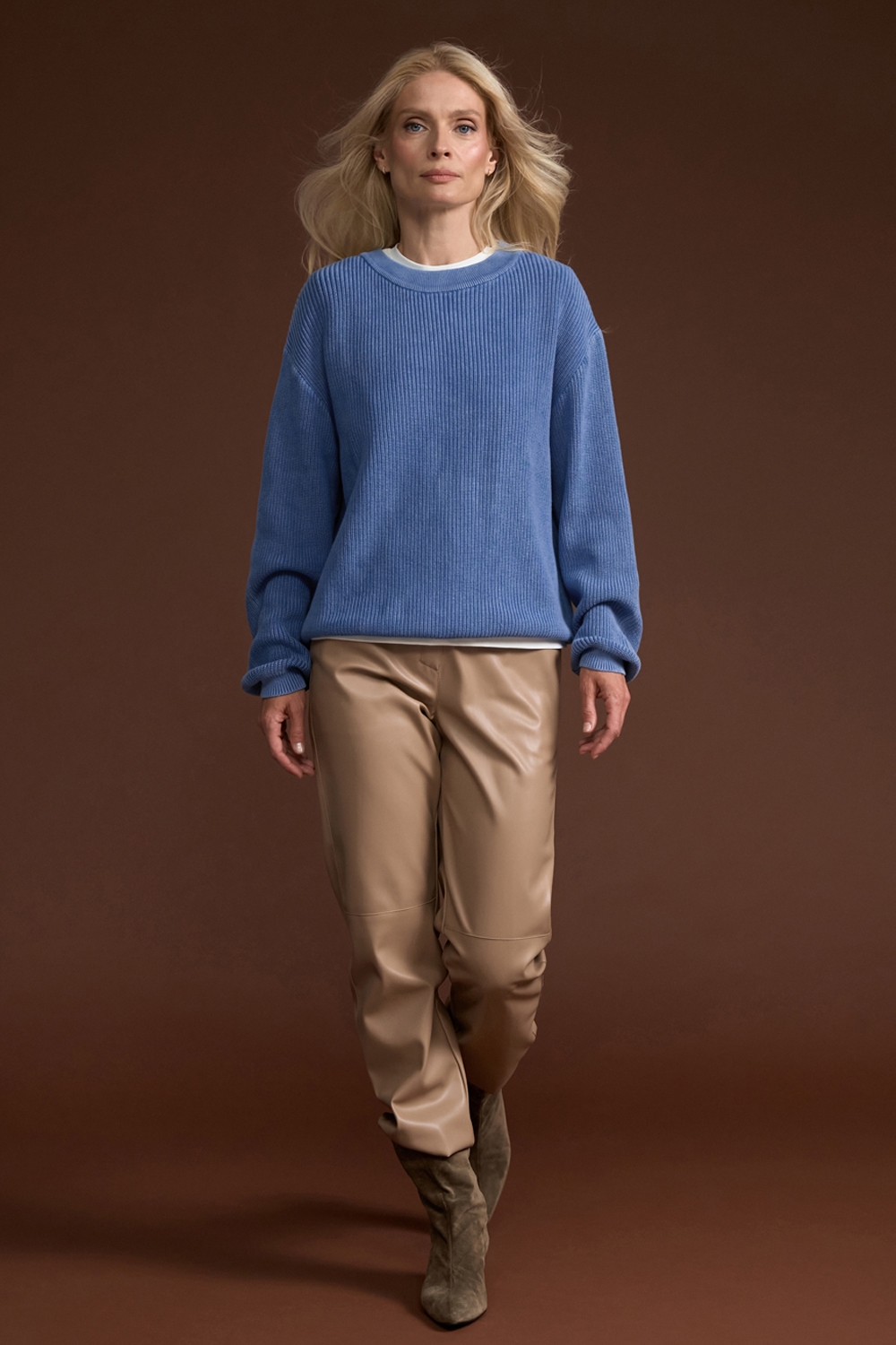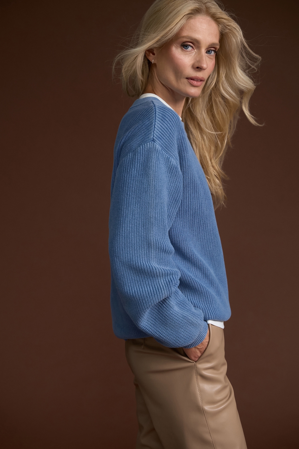 Базовий джемпер виготовлений із натуральної бавовняною пряжі в гладкому переплетенні. Виріб середньої щільності, м'який та приємний до тіла.