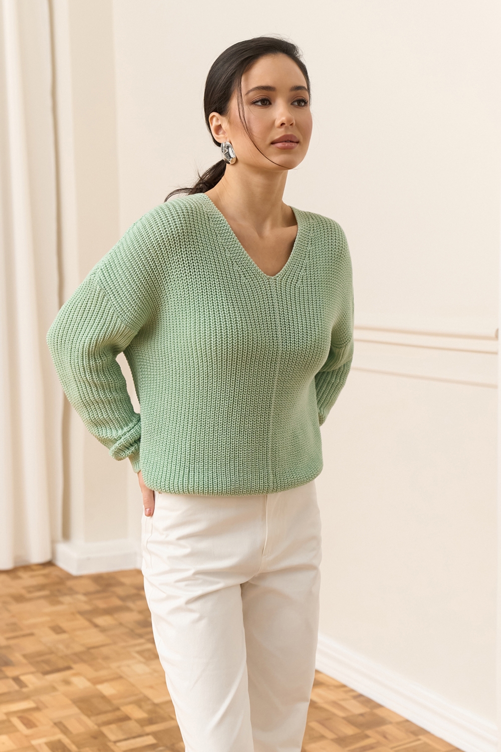 Елегантний вкорочений джемпер з натуральної бавовняної пряжі. Об'ємна в'язка середньої щільності.