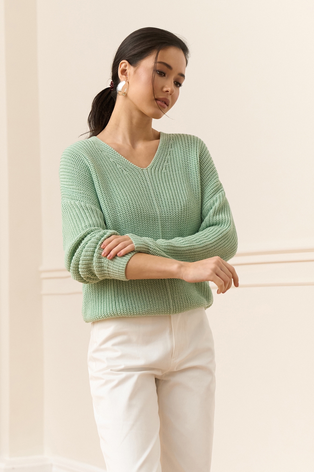 Елегантний вкорочений джемпер з натуральної бавовняної пряжі. Об'ємна в'язка середньої щільності.