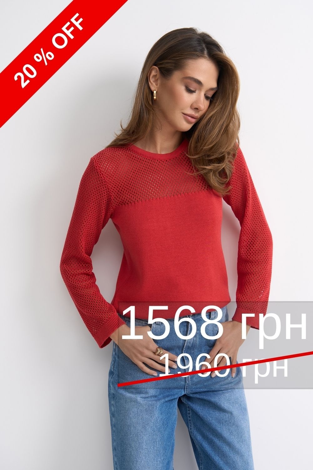 Витончений джемпер з натуральної бавовняної пряжі. Верхня частина та рукави оздоблені ніжною ажурною в'язкою у вигляді сітки.
