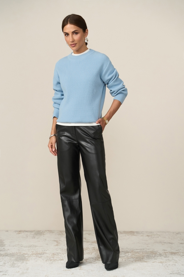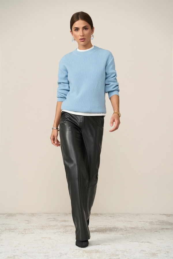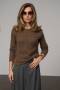 Елегантний джемпер виконанний у традиційному плетенні середньої щільності із пряжі, що містить бавовну та бамбук. Виріб м'який, еластичний, приємний до тіла, гарно тримає форму.