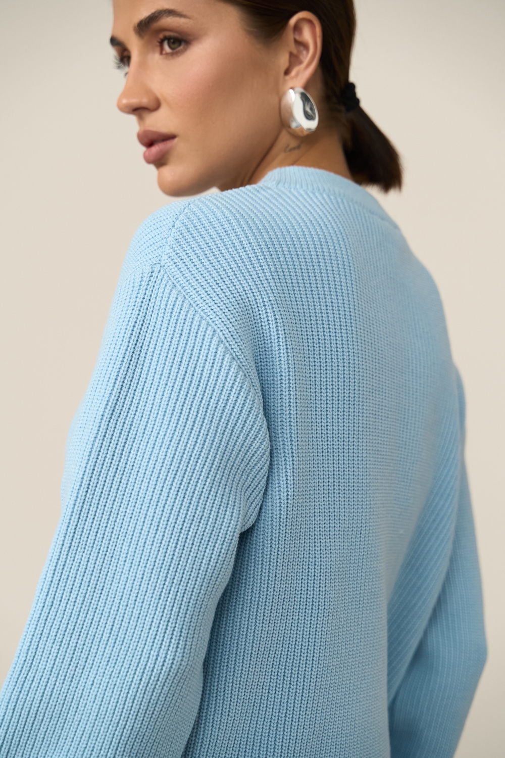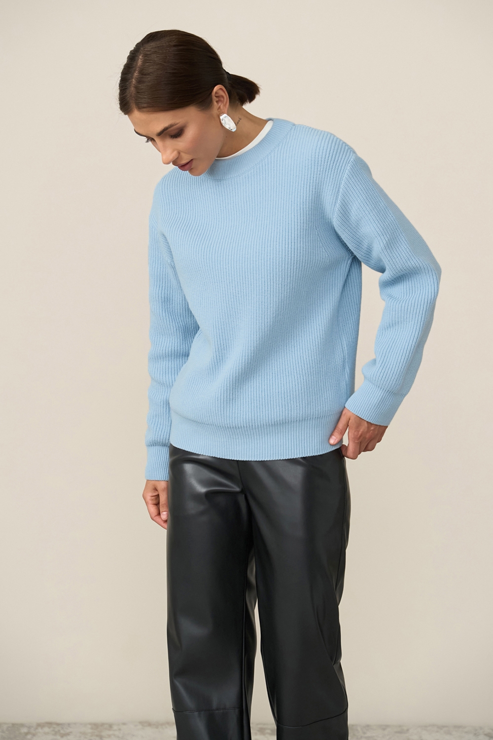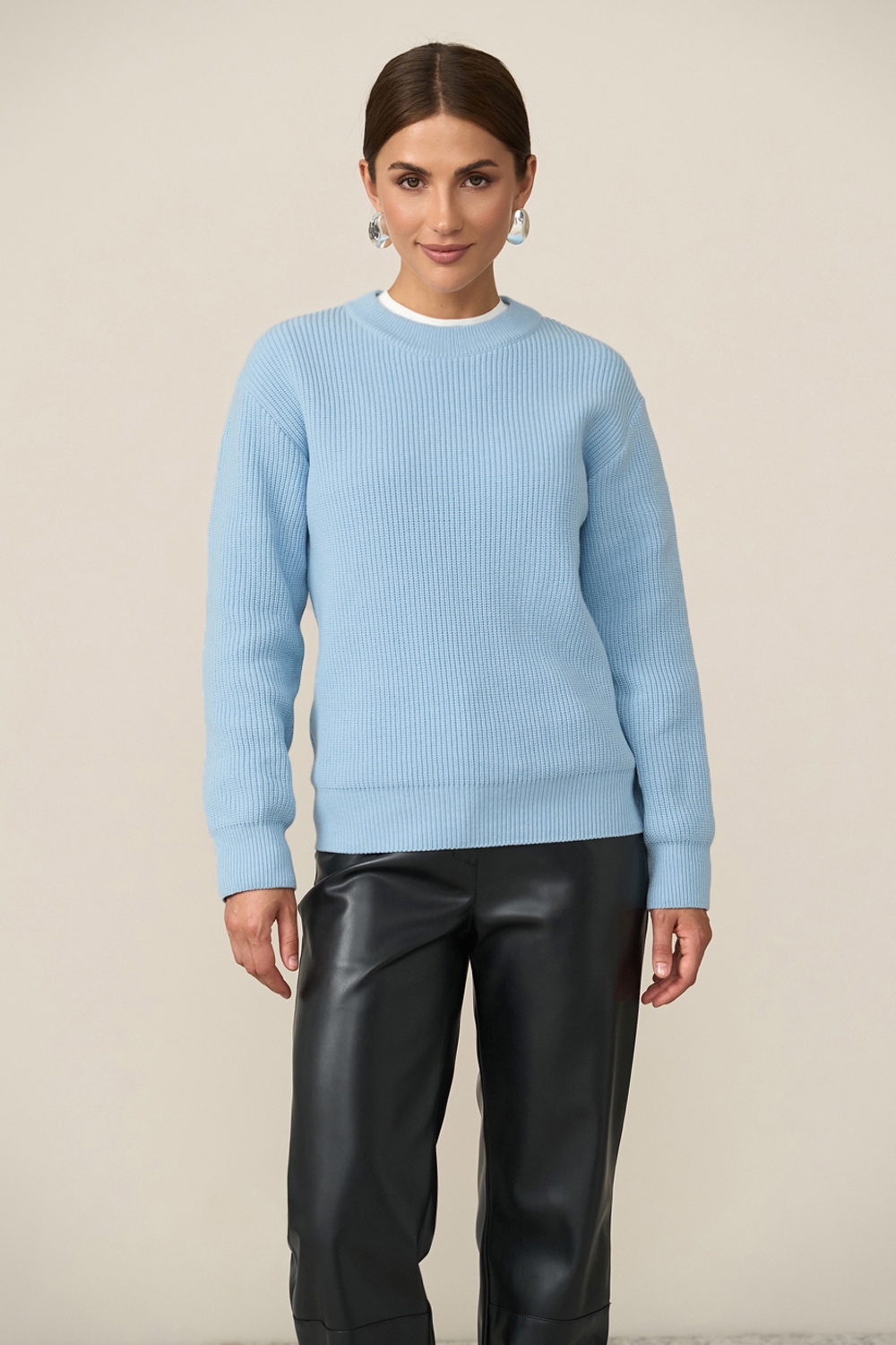 Елегантний джемпер виконанний у традиційному плетенні середньої щільності із пряжі, що містить бавовну та бамбук. Виріб м'який, еластичний, приємний до тіла, гарно тримає форму.