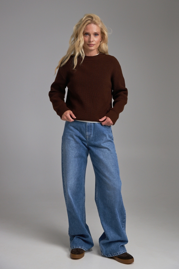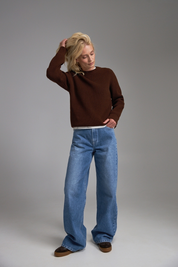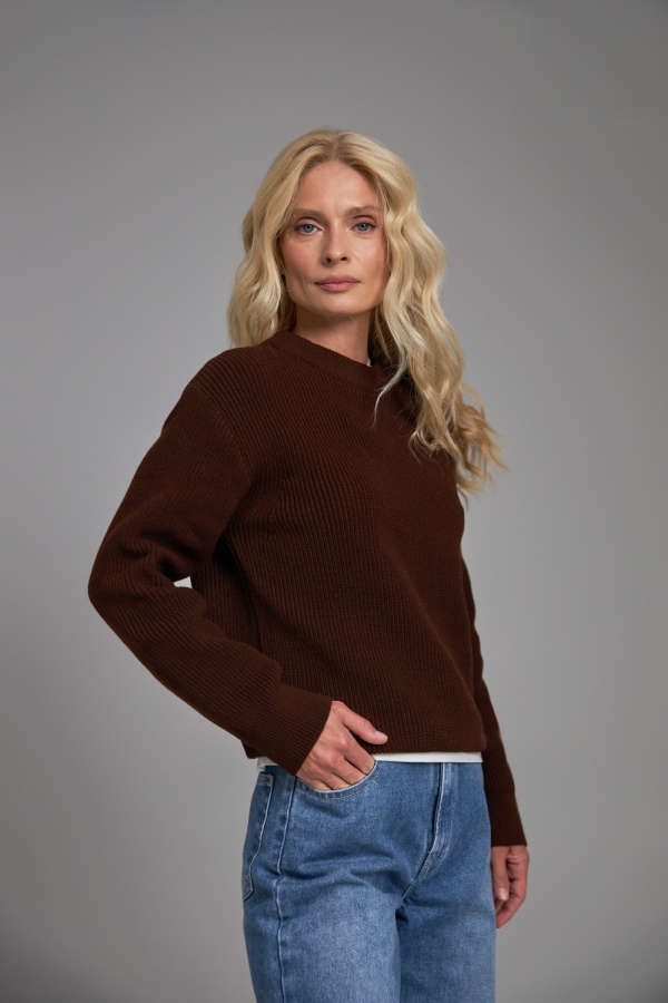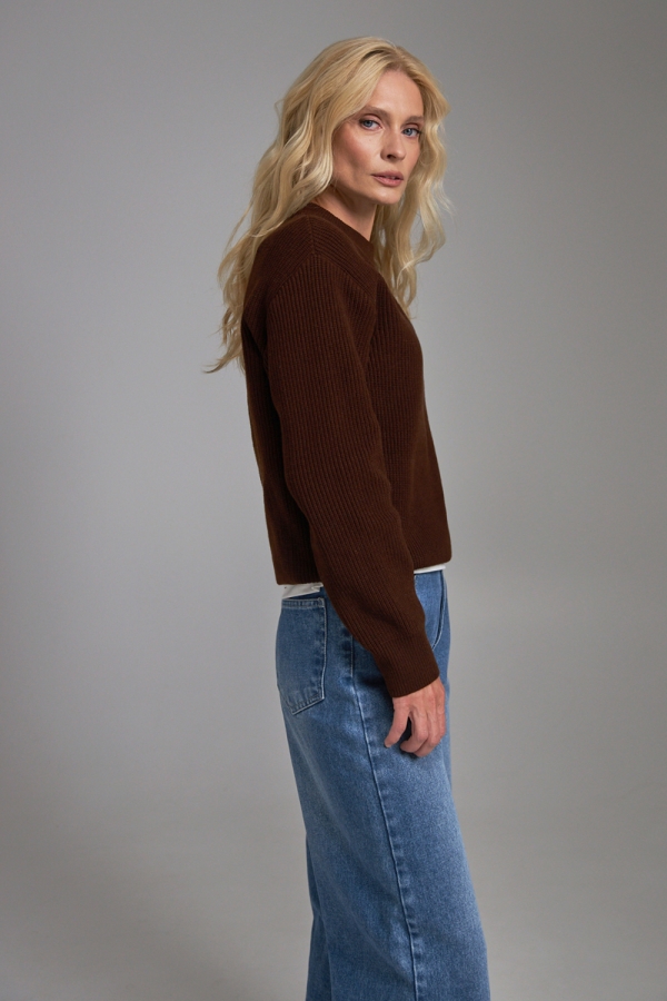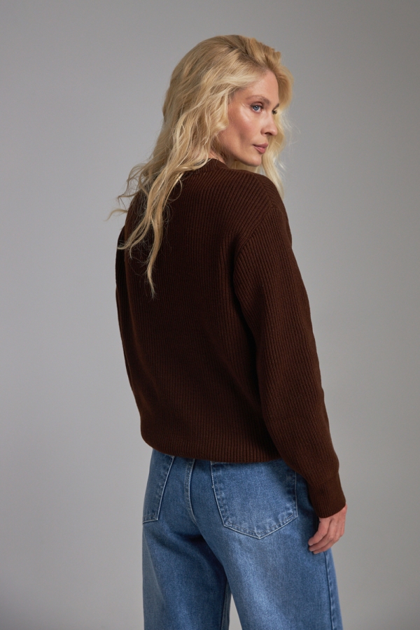 Елегантний джемпер виконанний у традиційному плетенні середньої щільності із пряжі, що містить бавовну та бамбук. Виріб м'який, еластичний, приємний до тіла, гарно тримає форму.