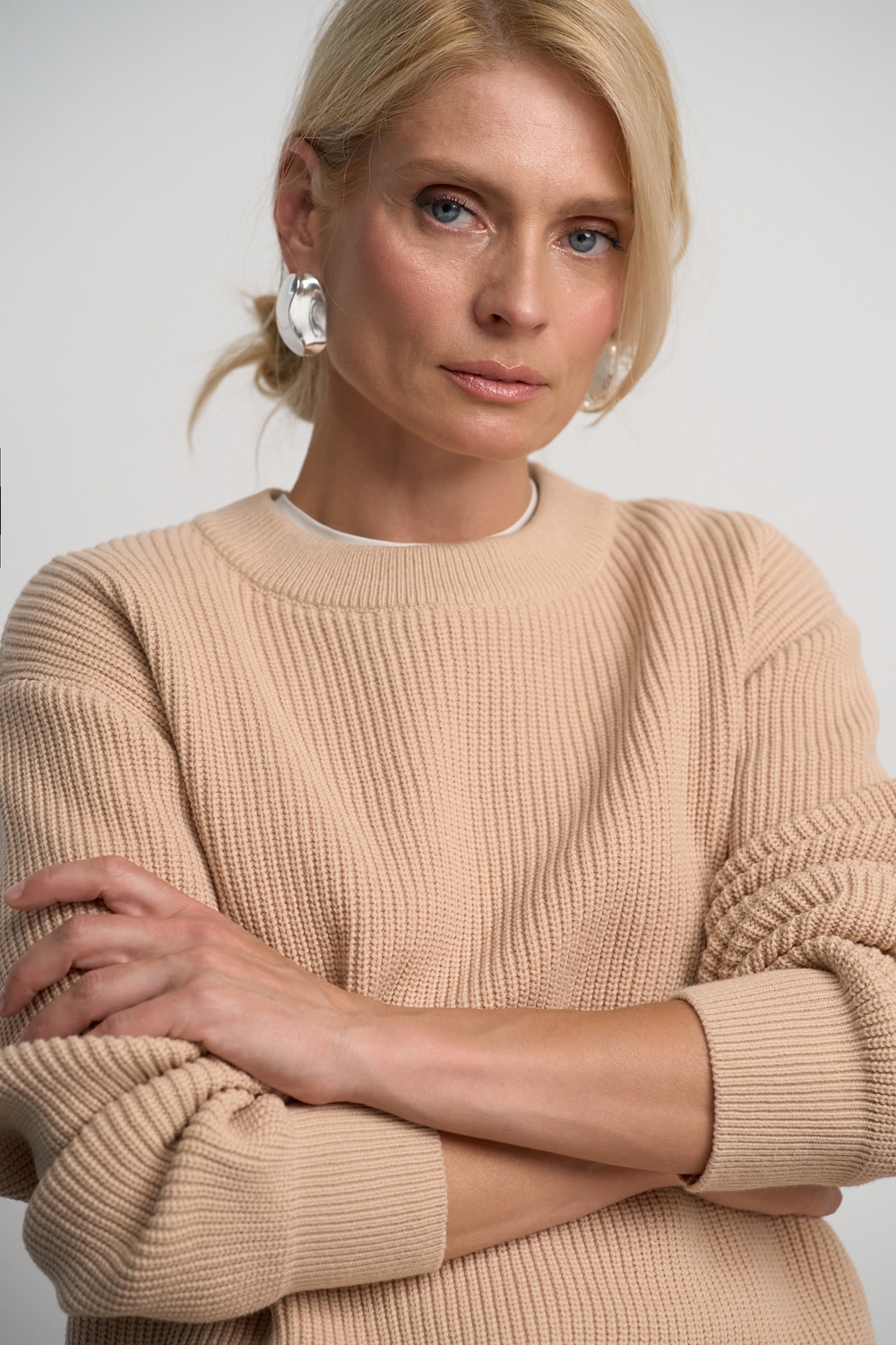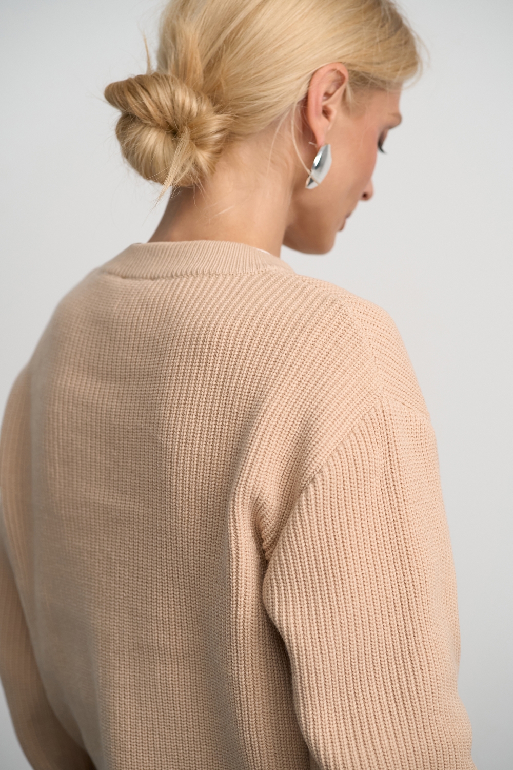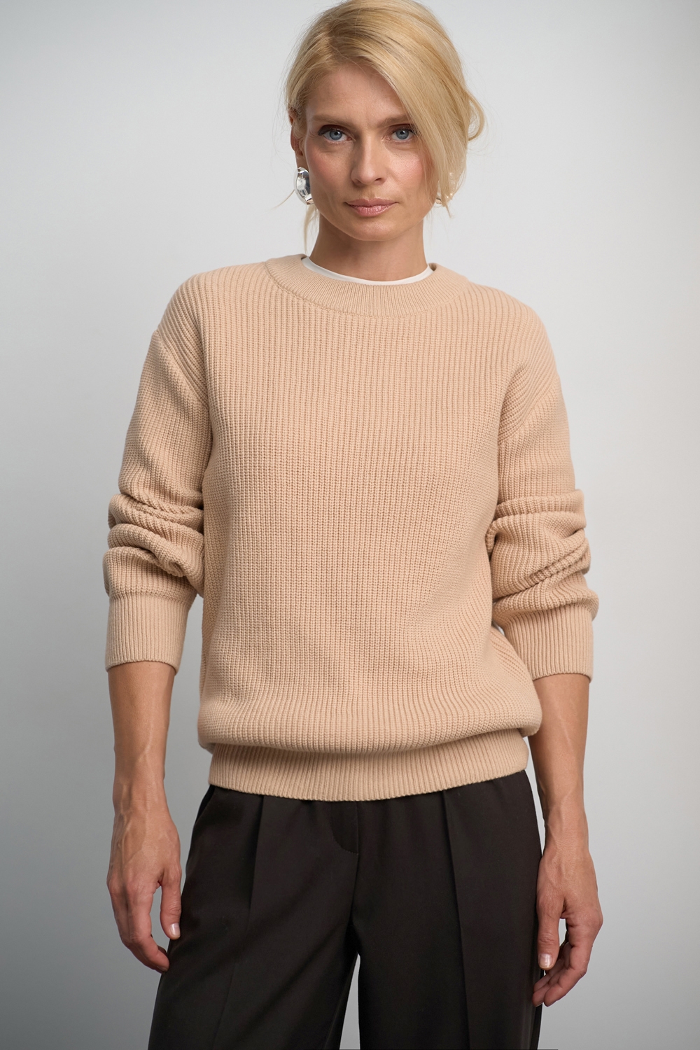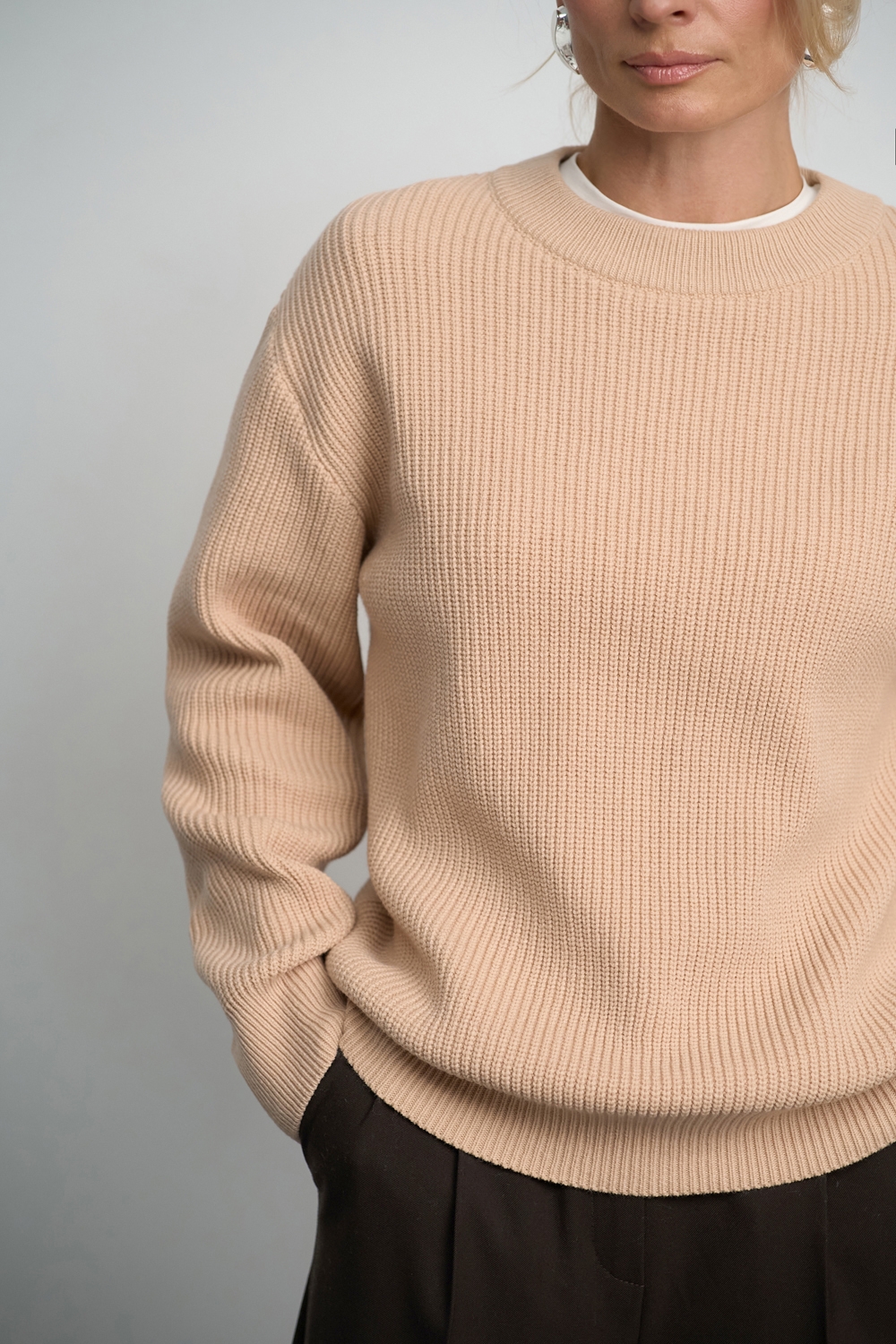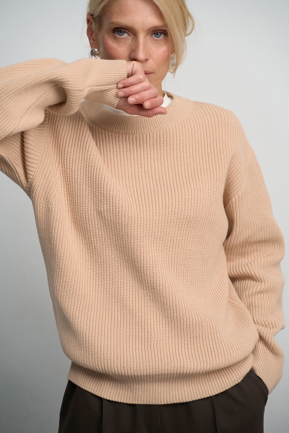 Елегантний джемпер виконанний у традиційному плетенні середньої щільності із пряжі, що містить бавовну та бамбук. Виріб м'який, еластичний, приємний до тіла, гарно тримає форму.
