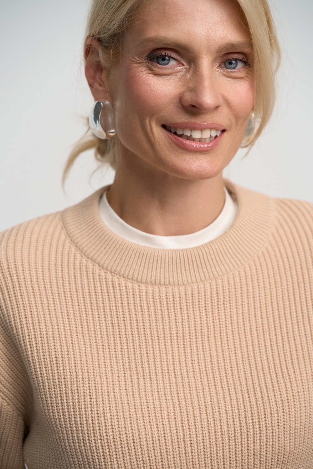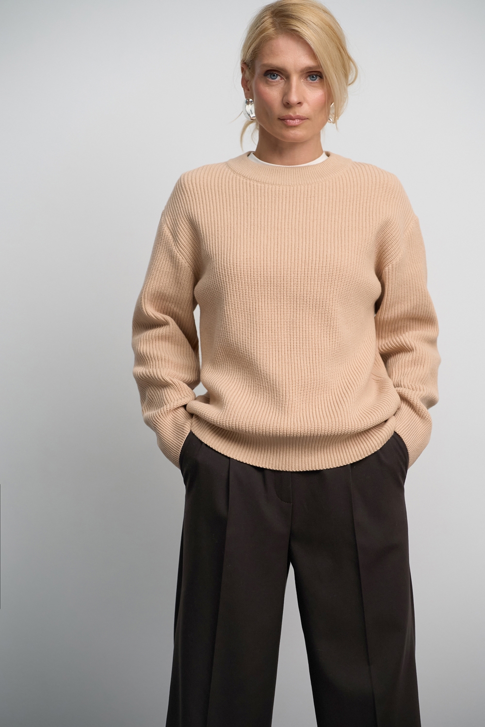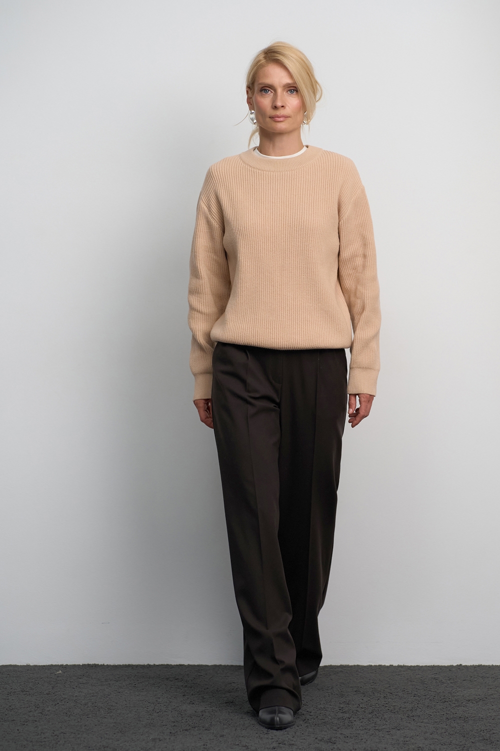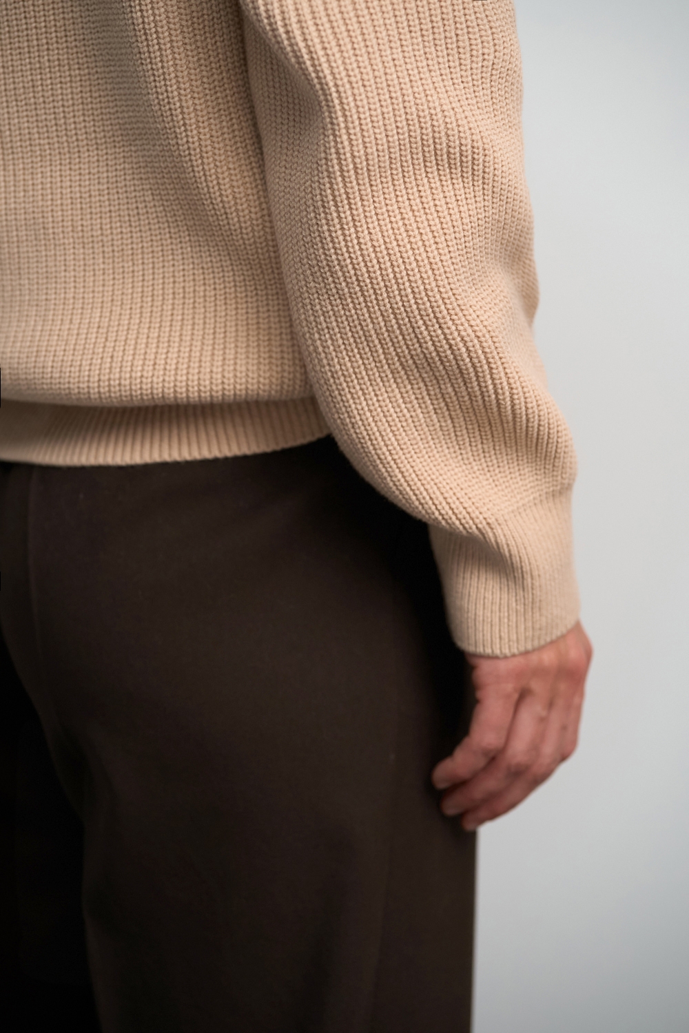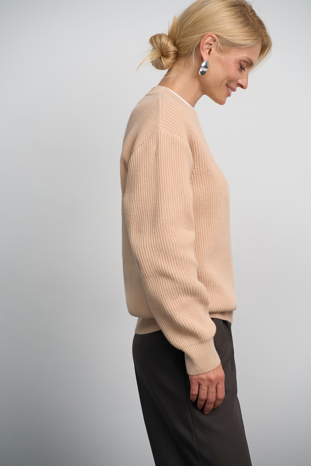 Елегантний джемпер виконанний у традиційному плетенні середньої щільності із пряжі, що містить бавовну та бамбук. Виріб м'який, еластичний, приємний до тіла, гарно тримає форму.