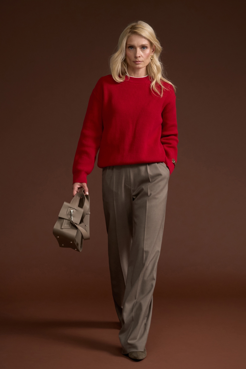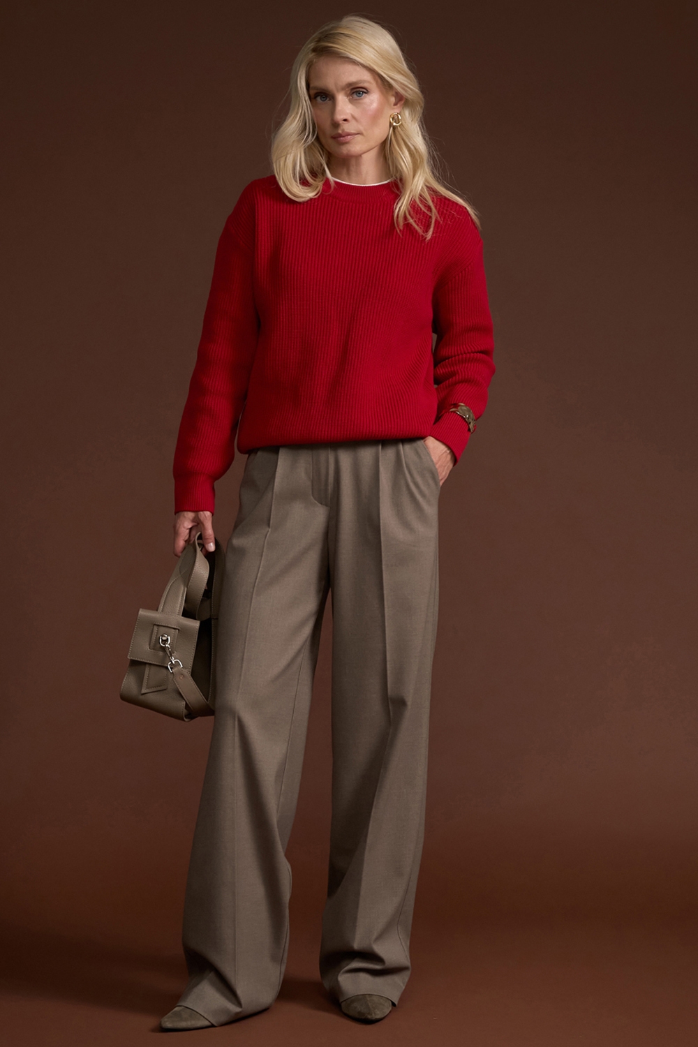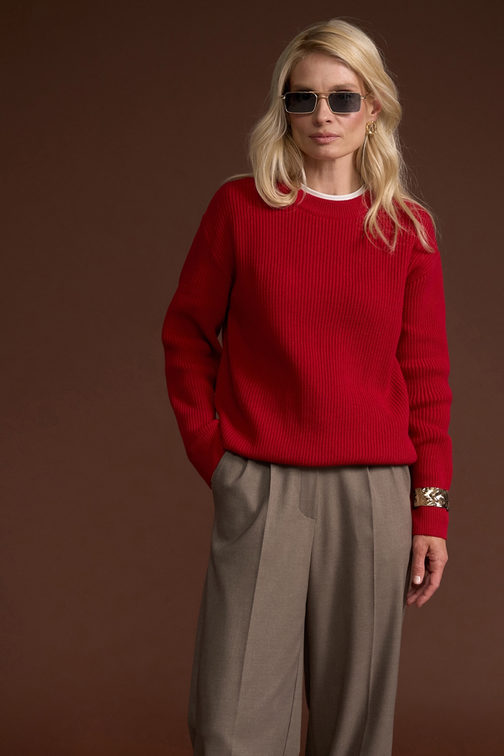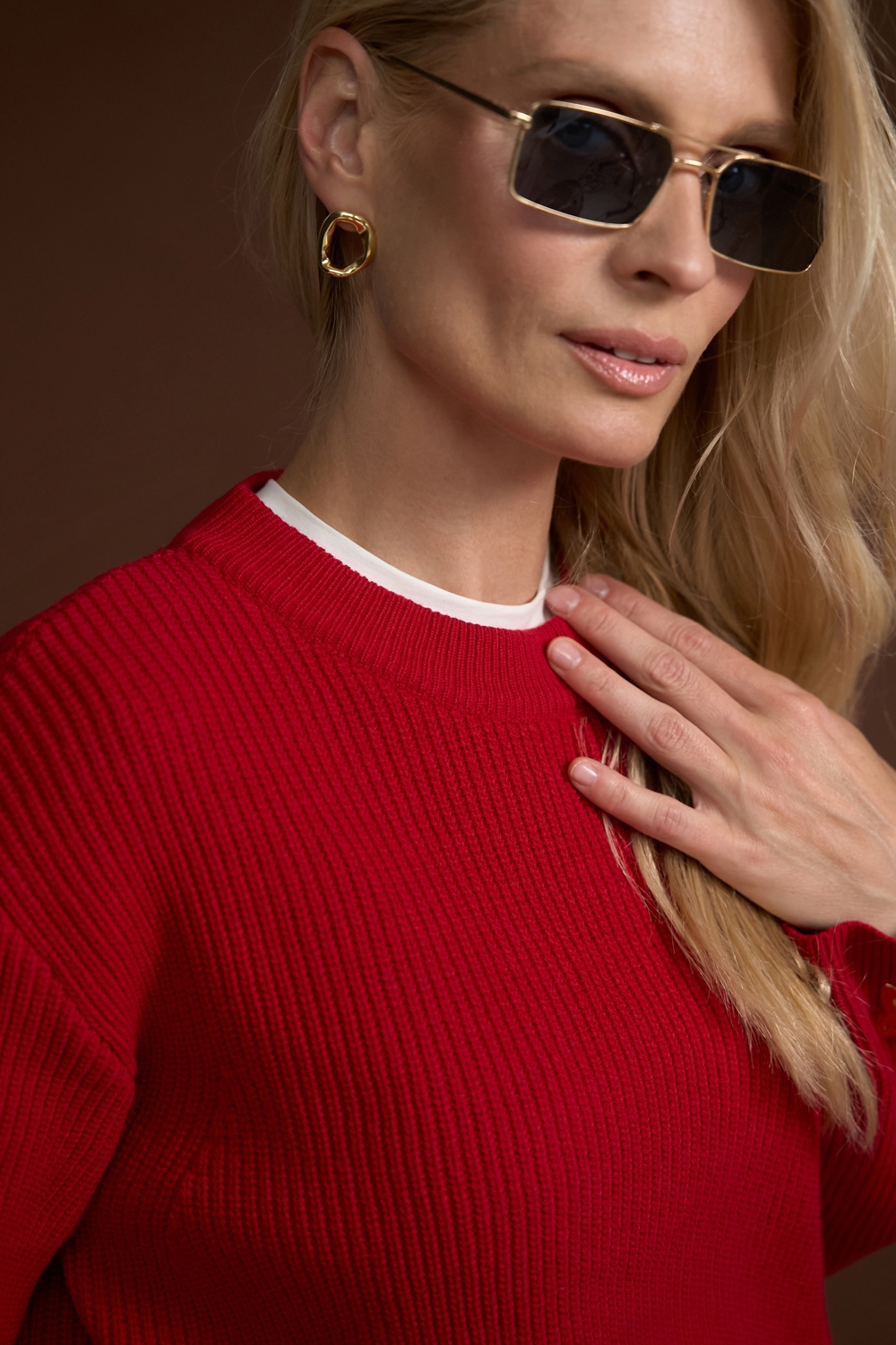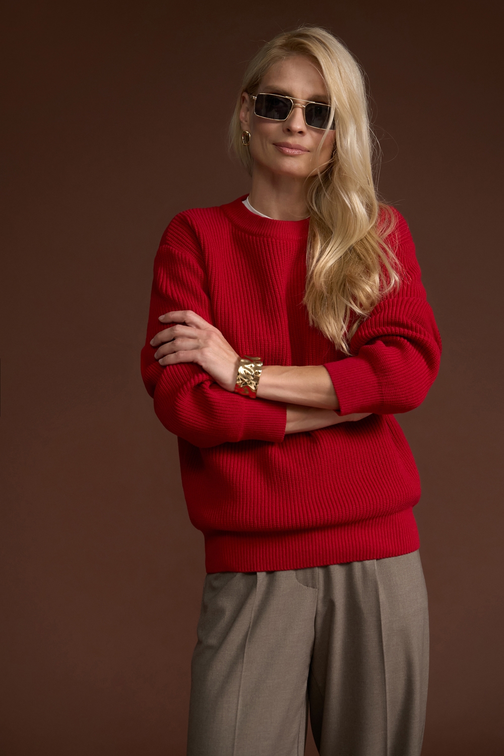 Елегантний джемпер виконанний у традиційному плетенні середньої щільності із пряжі, що містить бавовну та бамбук. Виріб м'який, еластичний, приємний до тіла, гарно тримає форму.