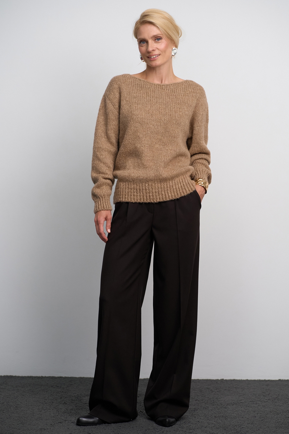 Стильний вкорочений джемпер виготовлений із преміальної вовняної пряжі з додаванням мохеру — м’який і приємний до тіла. Модель виконана стабільною гладкою в’язкою та доповнена еластичною в’язкою-резинкою на манжетах і по низу. Актуальна горловина у формі «човника», спущена лінія плеча.