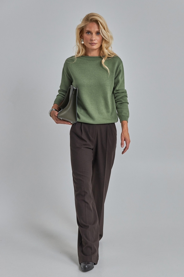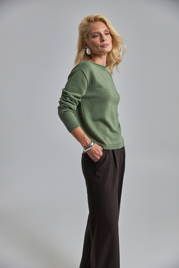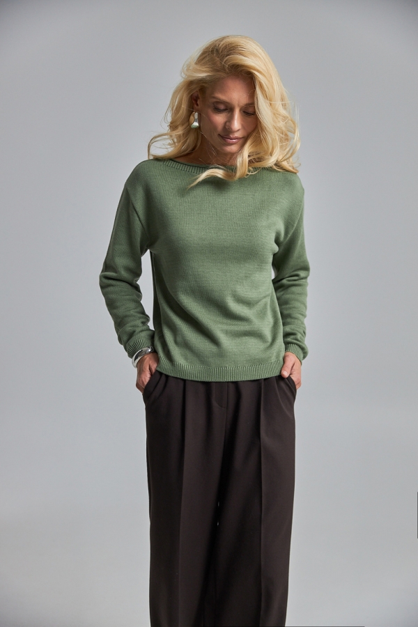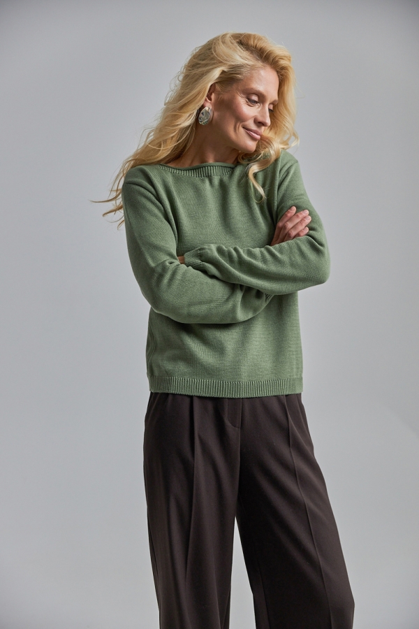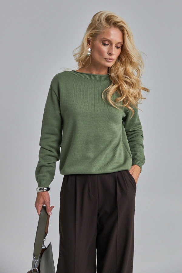 Лаконічний джемпер із акцентною горловиною "човник". Виконаний із бавовняної пряжі гладкої, стабільної в'язкою. Вільний силует, опущена лінія плеча додають комфорту. На рукавах та по низу виробу фіксуюча резинка.