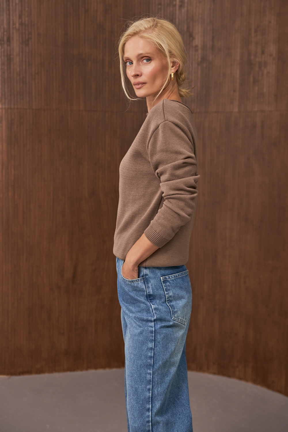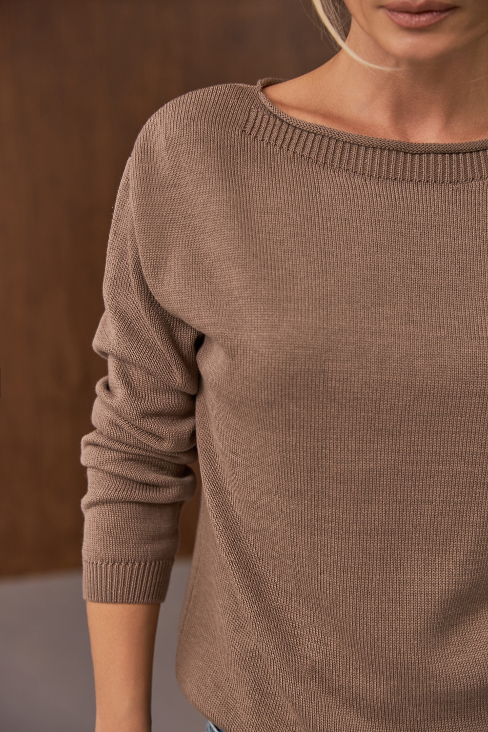 Лаконічний джемпер із акцентною горловиною "човник". Виконаний із бавовняної пряжі гладкої, стабільної в'язкою. Вільний силует, опущена лінія плеча додають комфорту. На рукавах та по низу виробу фіксуюча резинка.