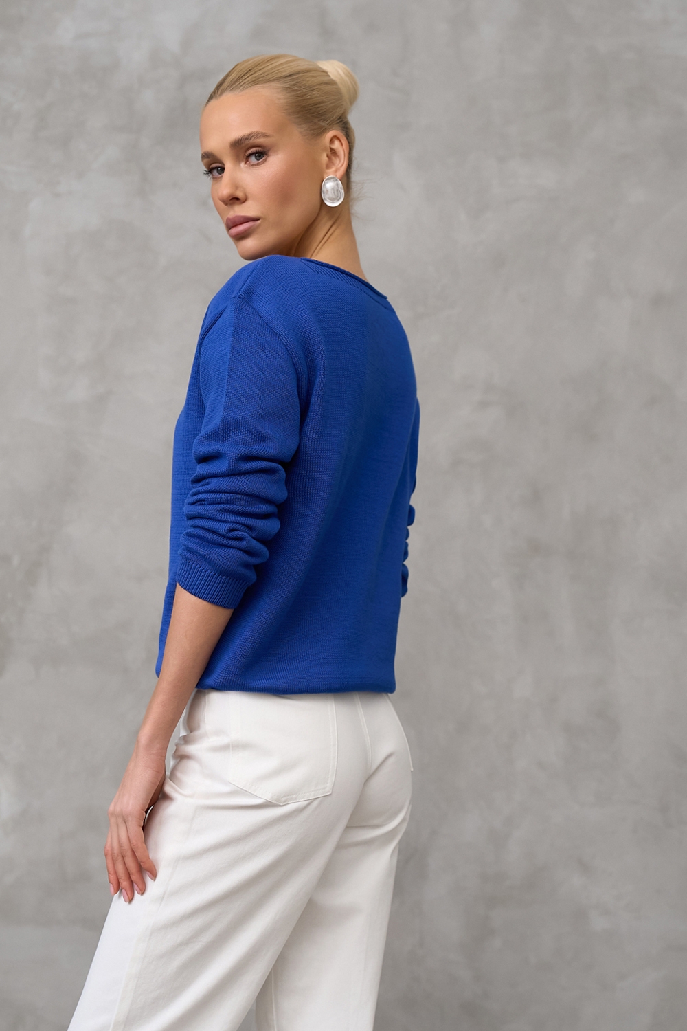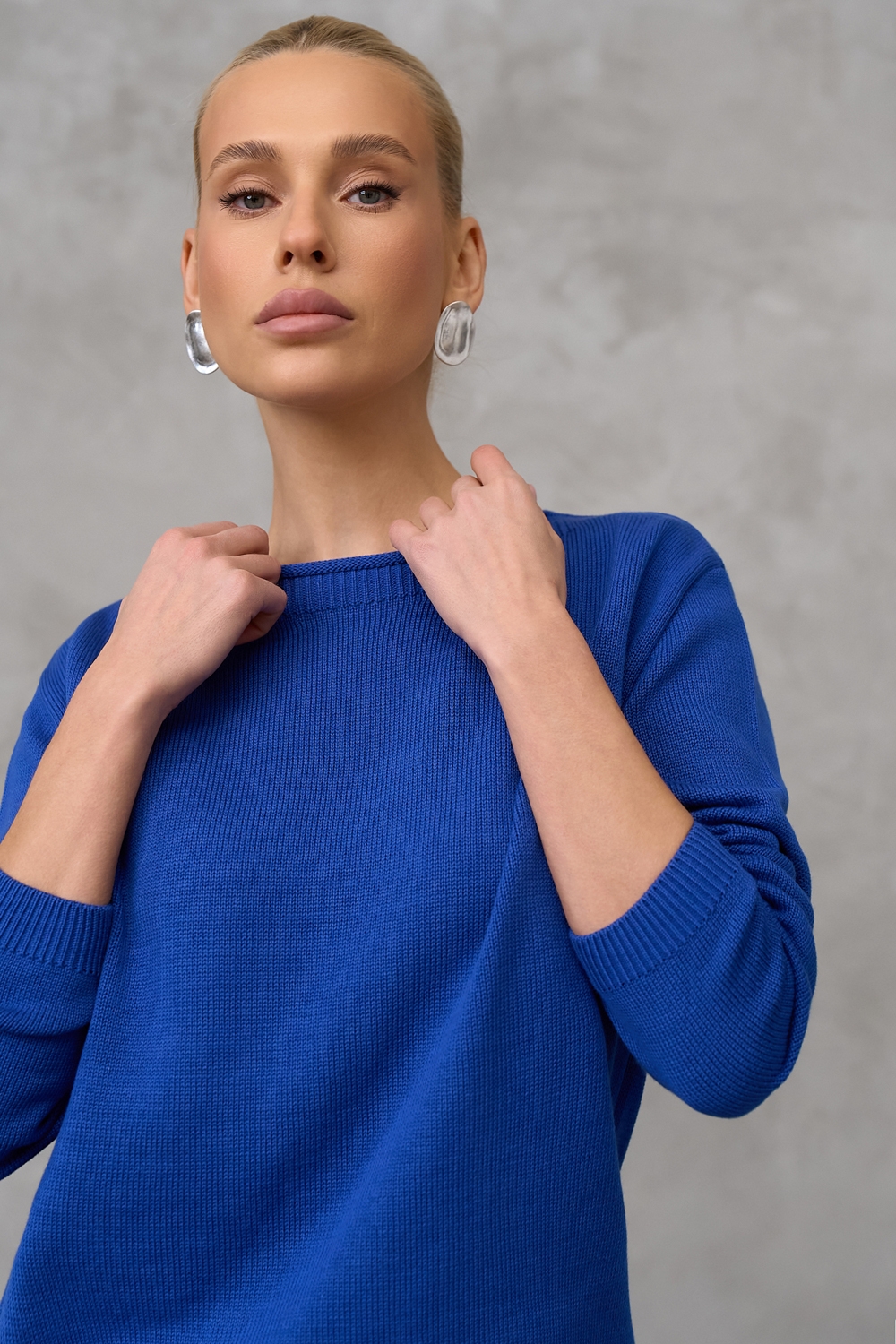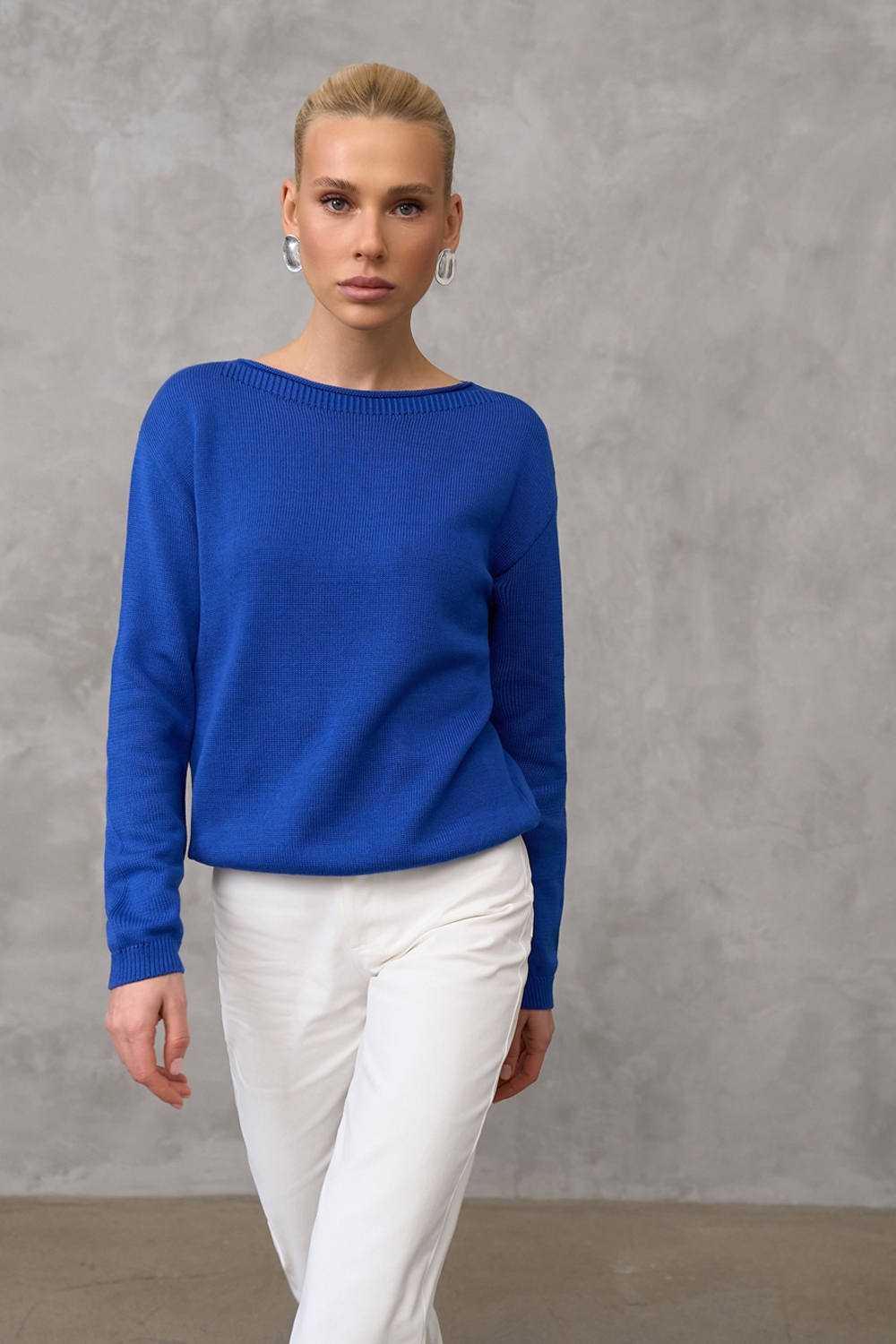 Лаконічний джемпер із акцентною горловиною "човник". Виконаний із бавовняної пряжі гладкої, стабільної в'язкою. Вільний силует, опущена лінія плеча додають комфорту. На рукавах та по низу виробу фіксуюча резинка.