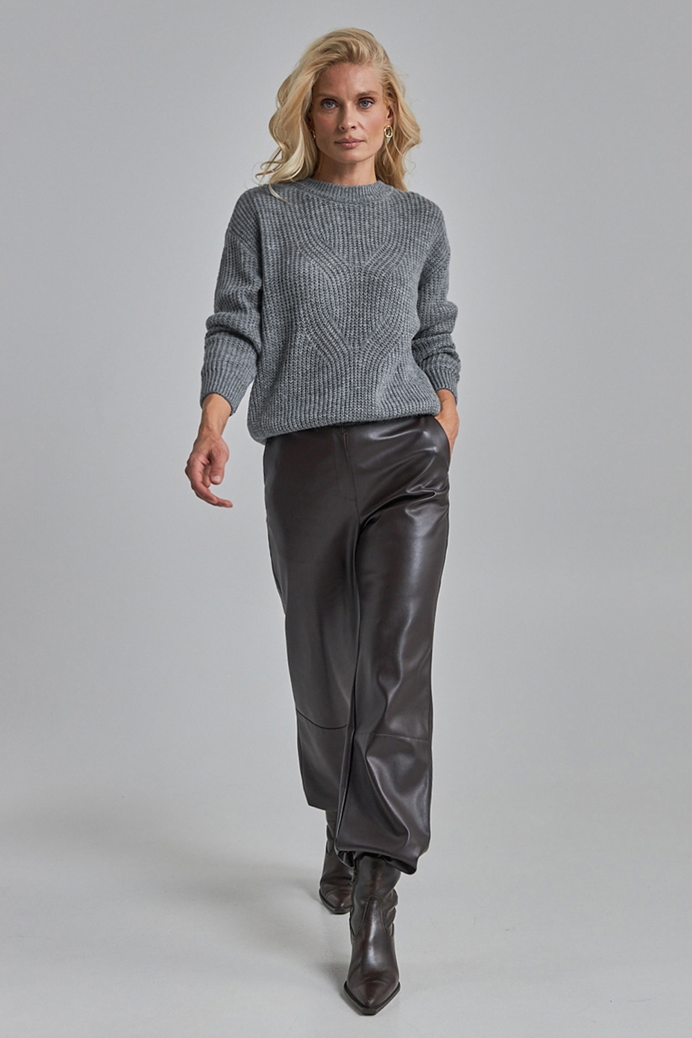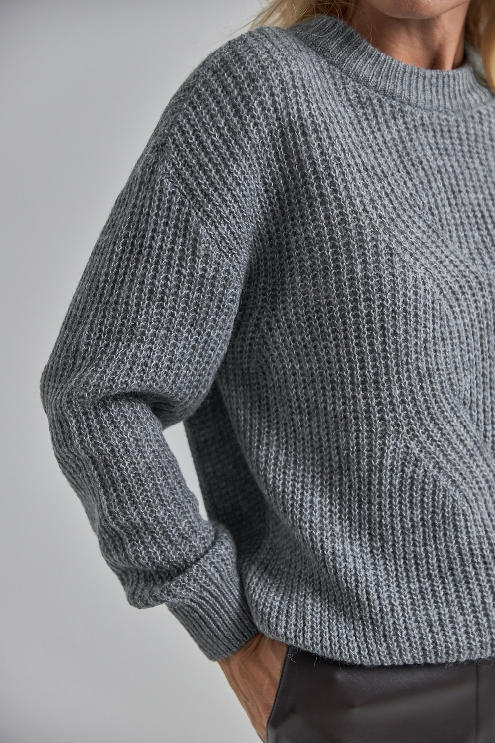 М'який джемпер виконаний із пряжі з високим вмістом вовни. Виріб виконаний фактурною, напівпрозорою в'язкою. Опущена лінія плеча додає розслабленості. Низ джемпера, рукави та горловина оформлені в'язкою резинкою.