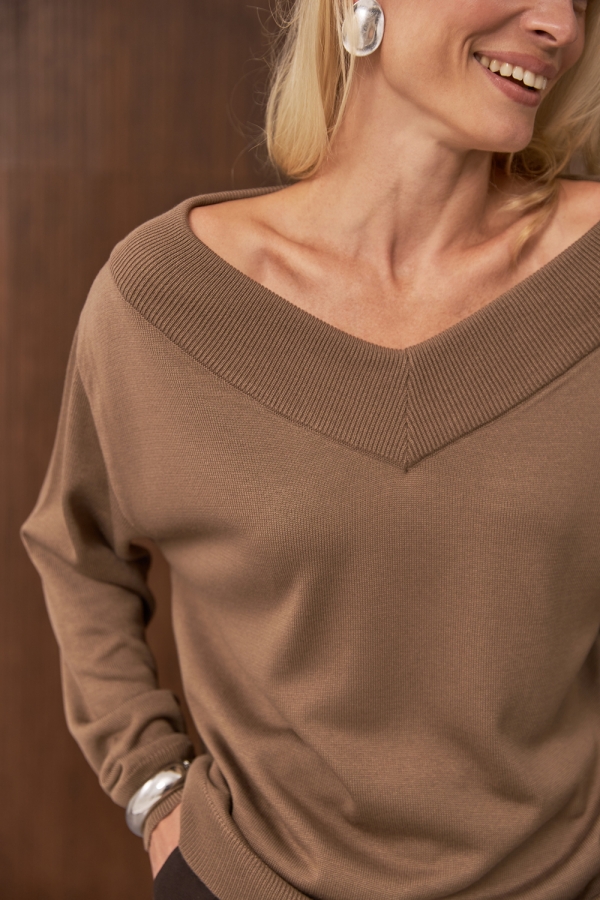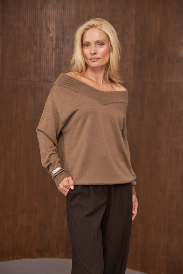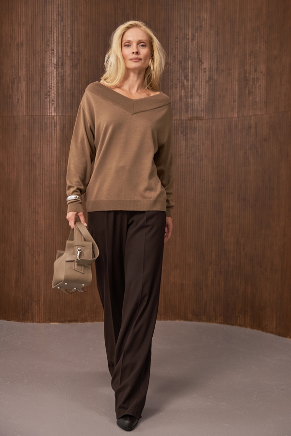 Легкий джемпер вільного крою з тонкої, шовковистої віскозної пряжі. Модель має стильний V-подібний виріз горловини, оздоблений широким манжетом.