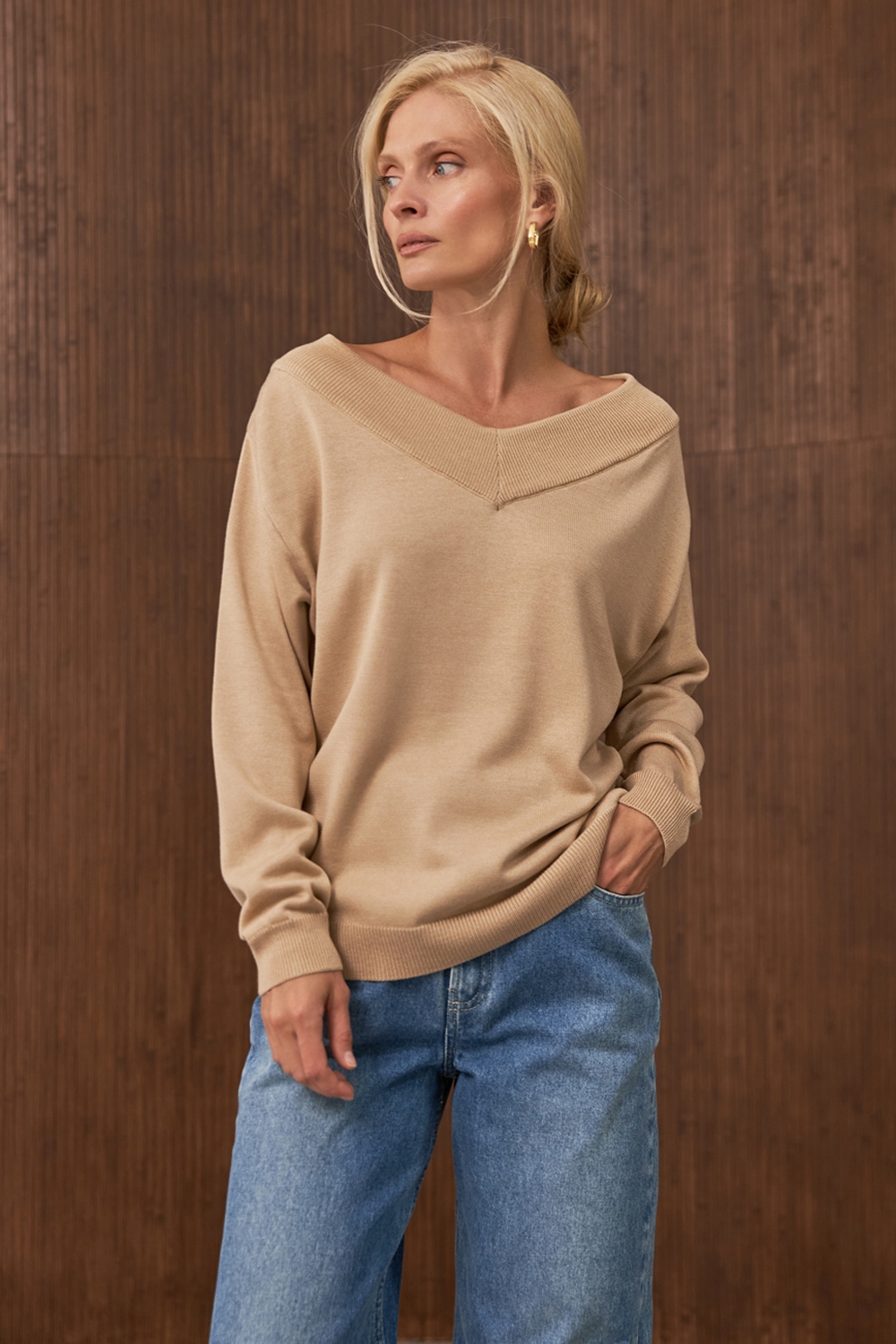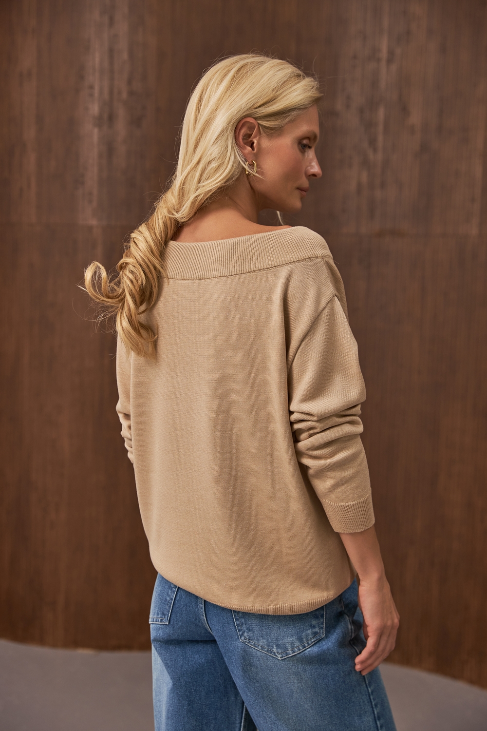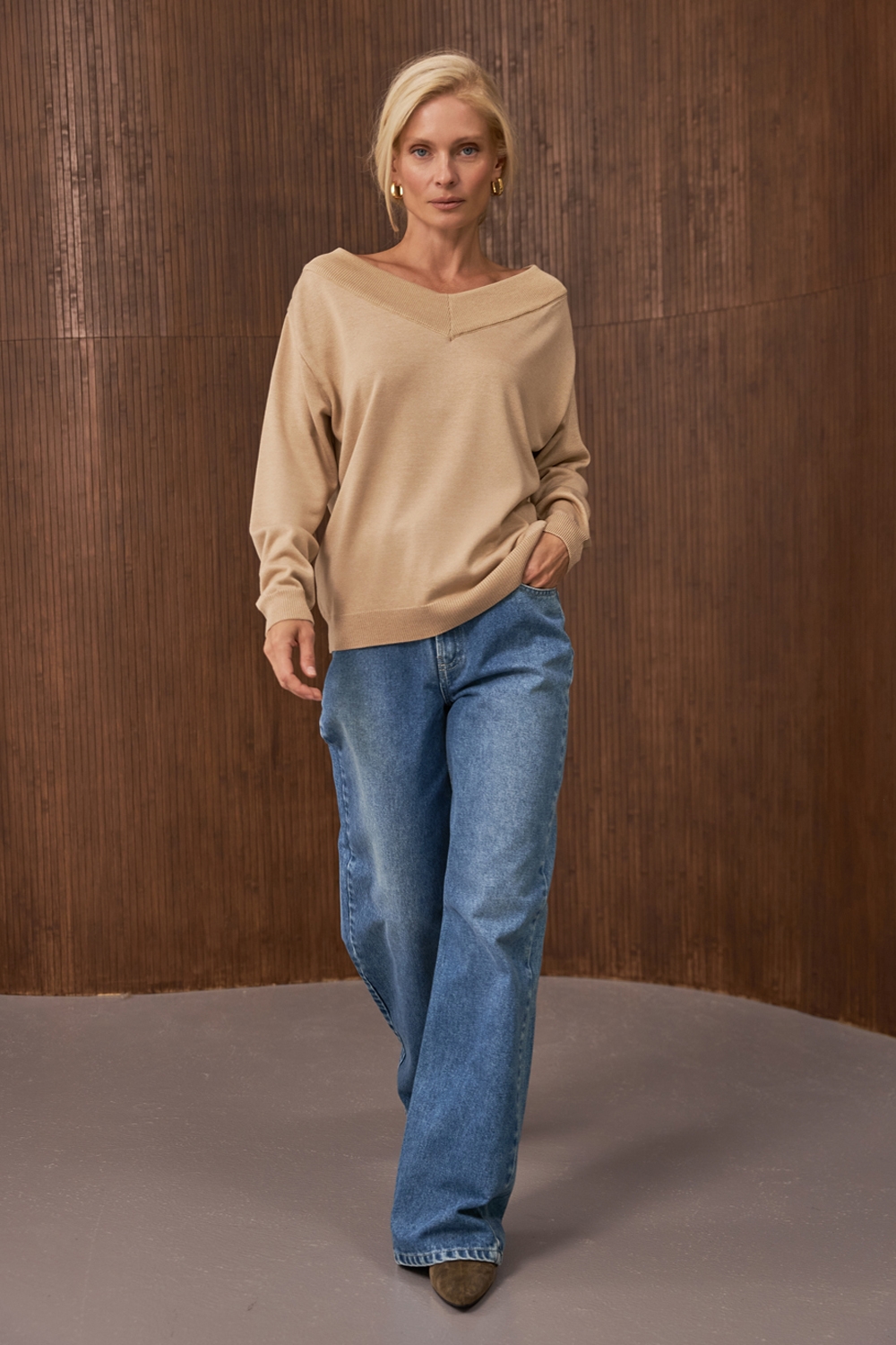 Легкий джемпер вільного крою з тонкої, шовковистої віскозної пряжі. Модель має стильний V-подібний виріз горловини, оздоблений широким манжетом.
