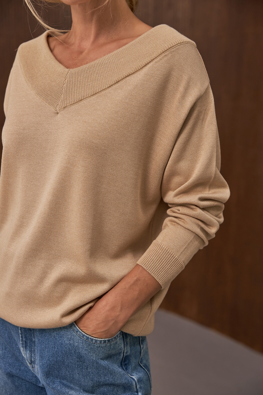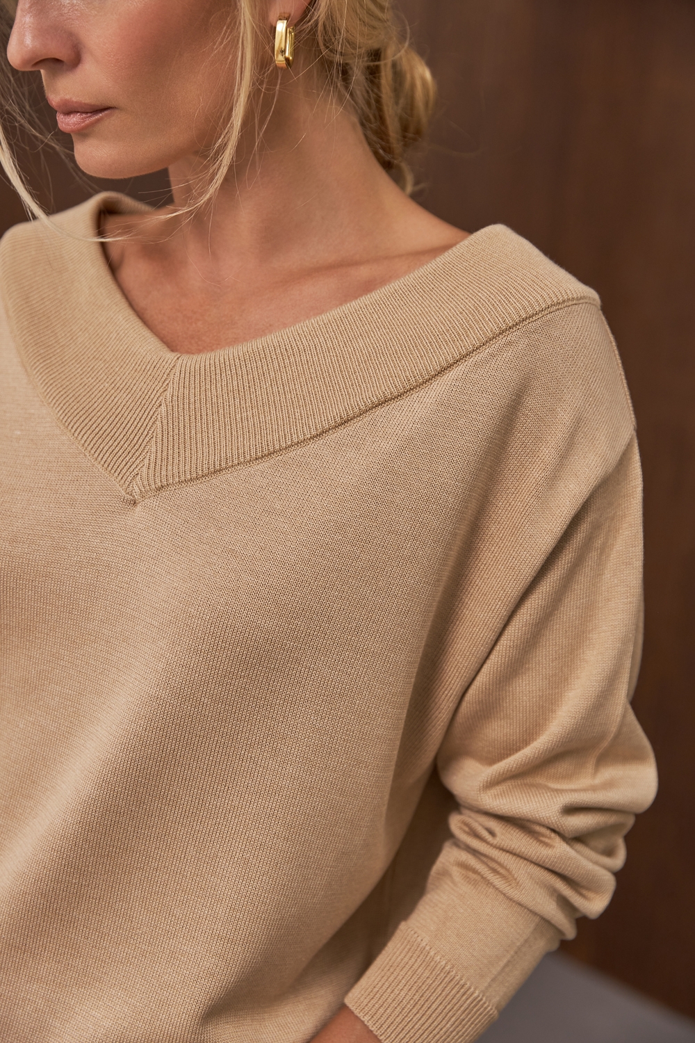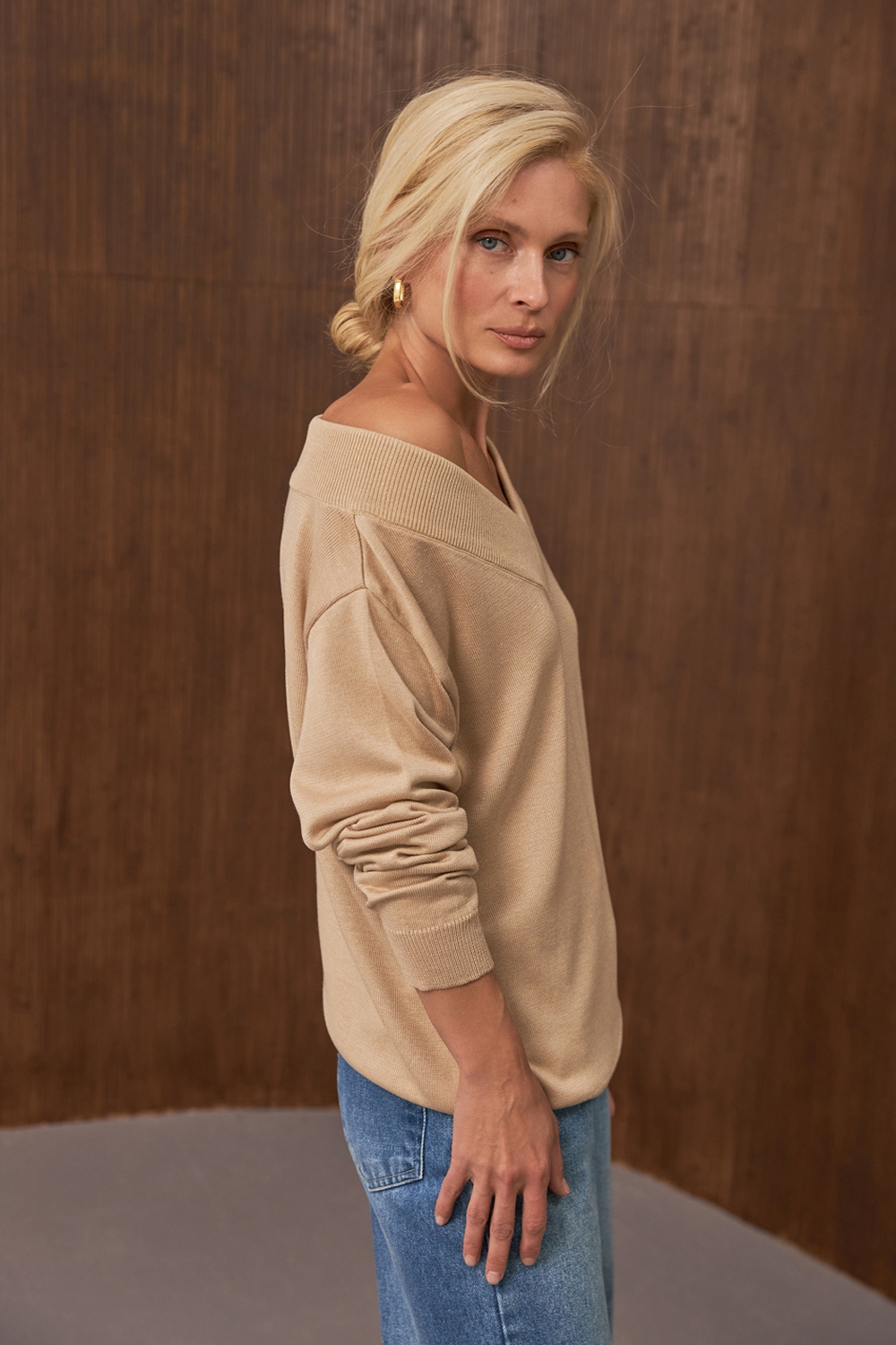Легкий джемпер вільного крою з тонкої, шовковистої віскозної пряжі. Модель має стильний V-подібний виріз горловини, оздоблений широким манжетом.