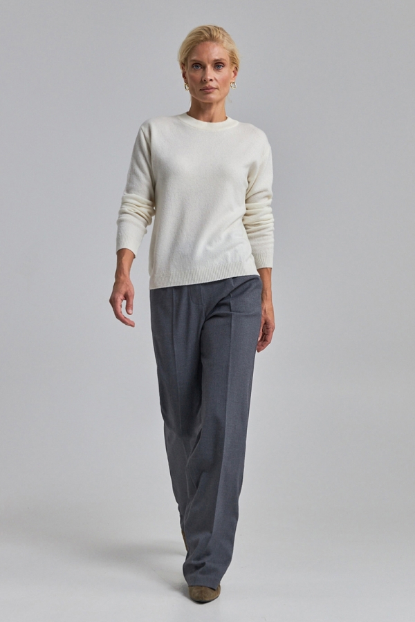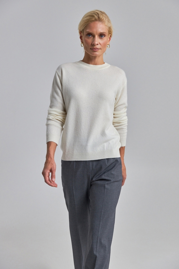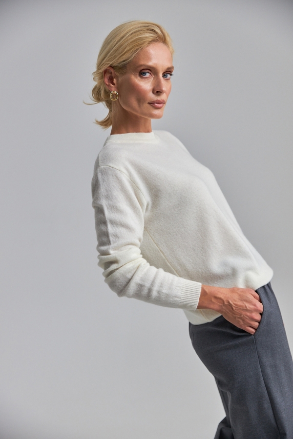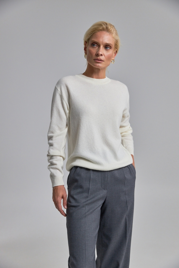 Джемпер виготовлений стабільним плетінням середньої щільності із вовниі ягняти із додаванням кашеміру. Надзвичайно м'який, невагомий та приємний до тіла. Вільний силует спущена лінія плеча додають розслабленості. По низу виробу та на рукавах фіксуюча манжет резинка.