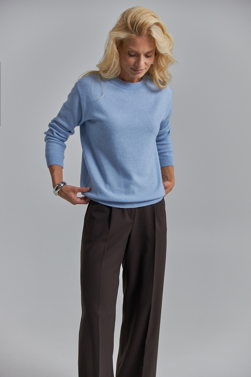 Джемпер виготовлений стабільним плетінням середньої щільності із вовниі ягняти із додаванням кашеміру. Надзвичайно м'який, невагомий та приємний до тіла. Вільний силует спущена лінія плеча додають розслабленості. По низу виробу та на рукавах фіксуюча манжет резинка.