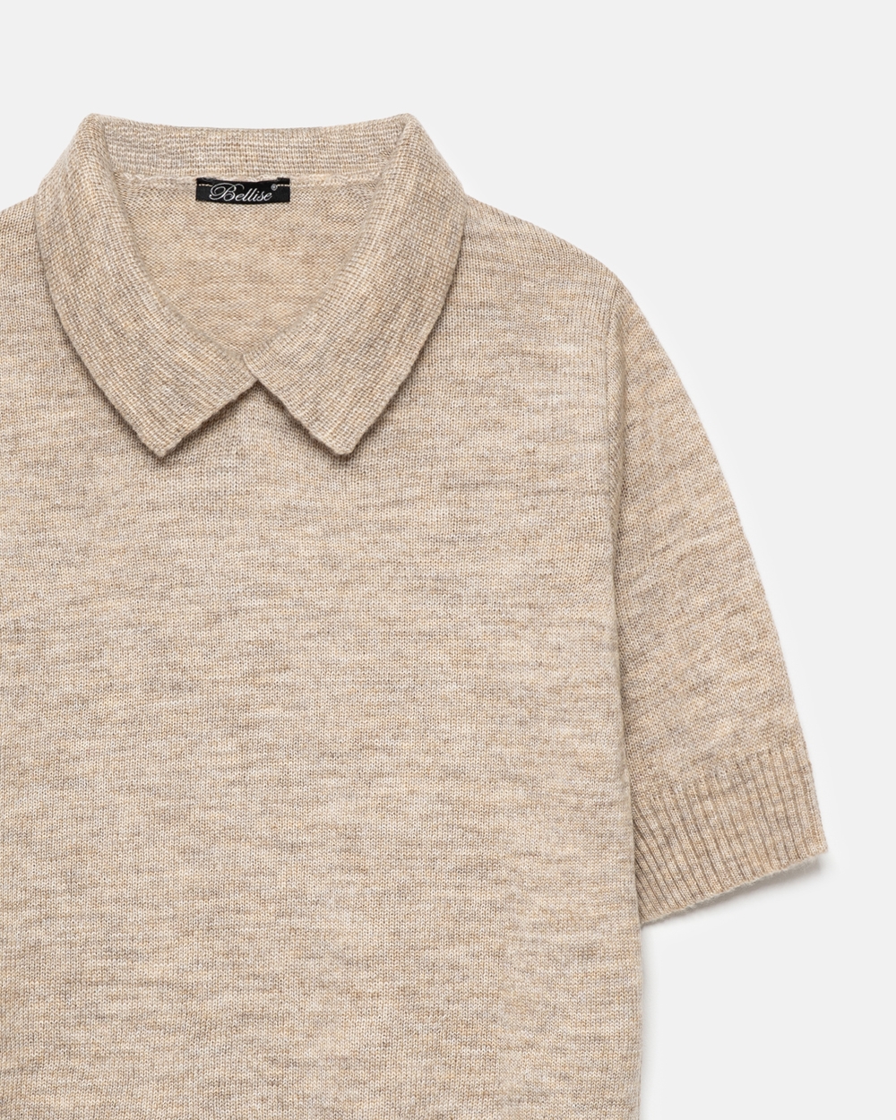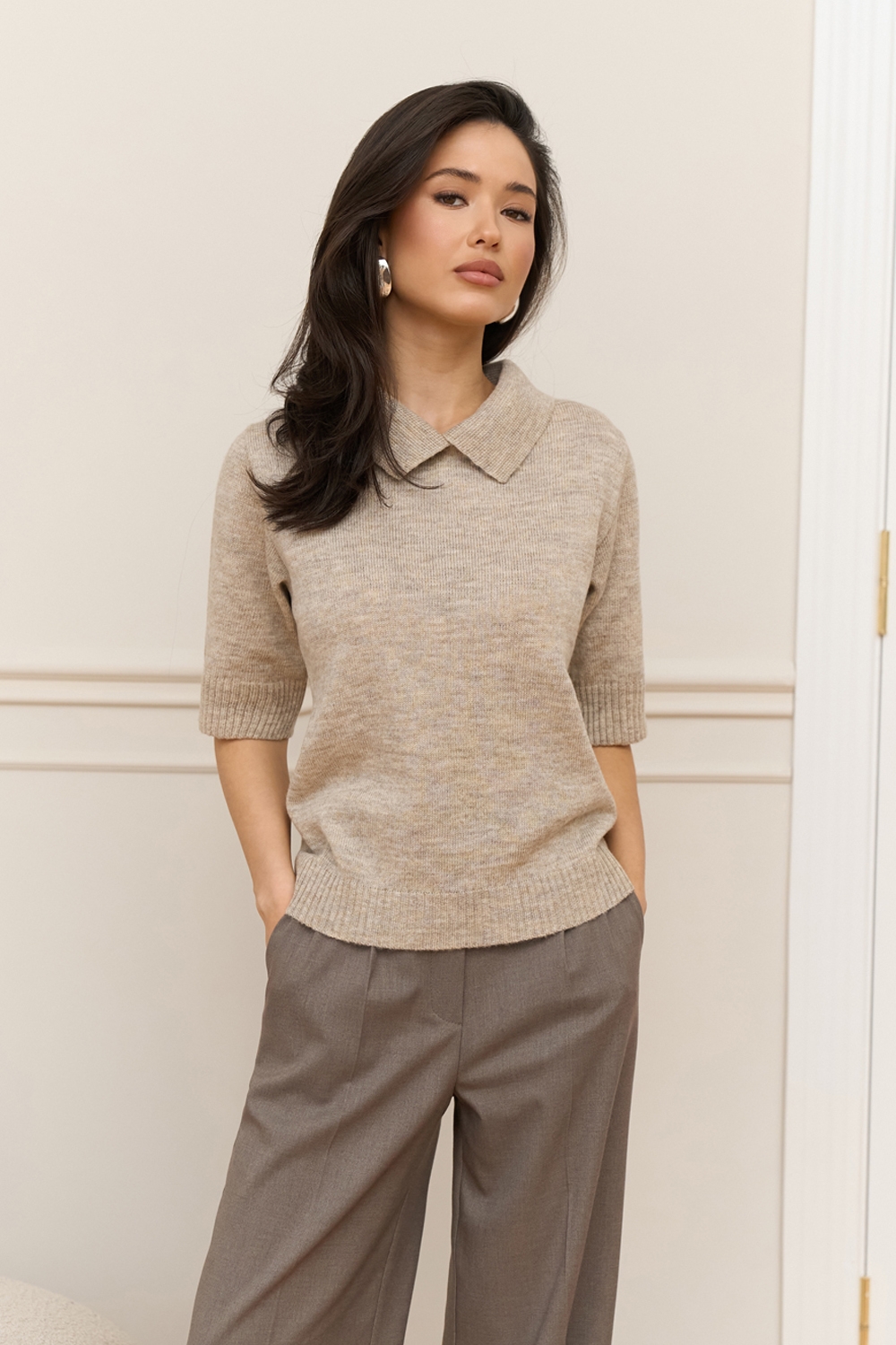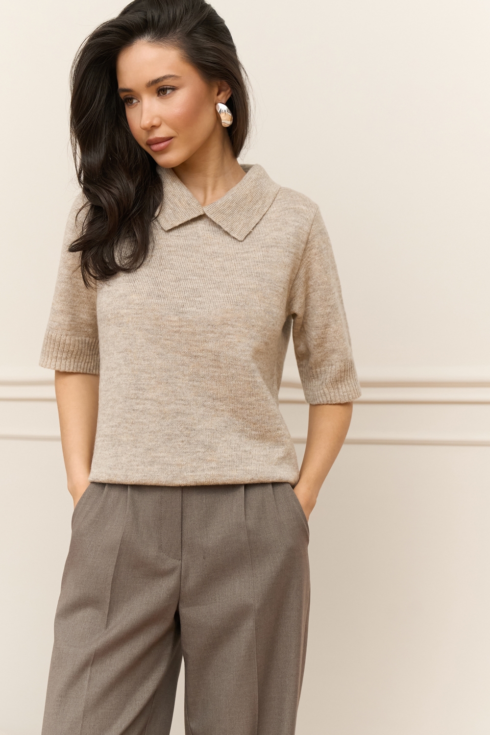 Стильний джемпер з преміальної пряжі бебі-альпаки та мериносової вовни. В’язка середньої щільності, приємна до тіла. Актуальний комірець поло та комфортний рукав до ліктя. По низу виробу фіксуюча резинка.