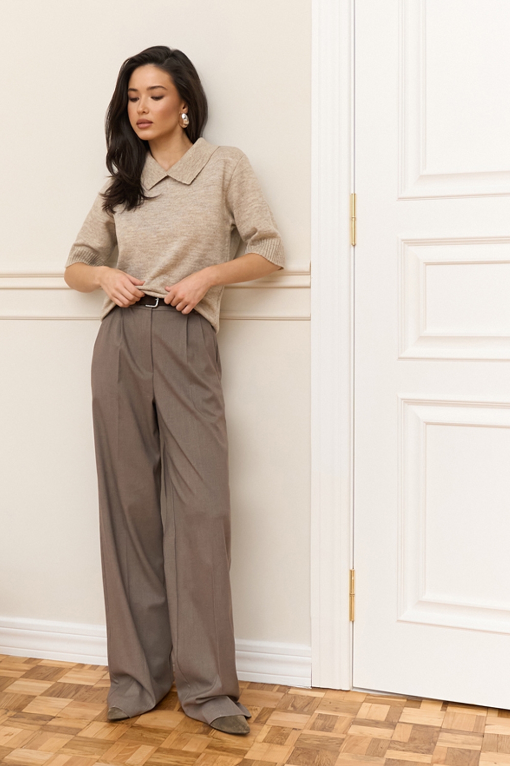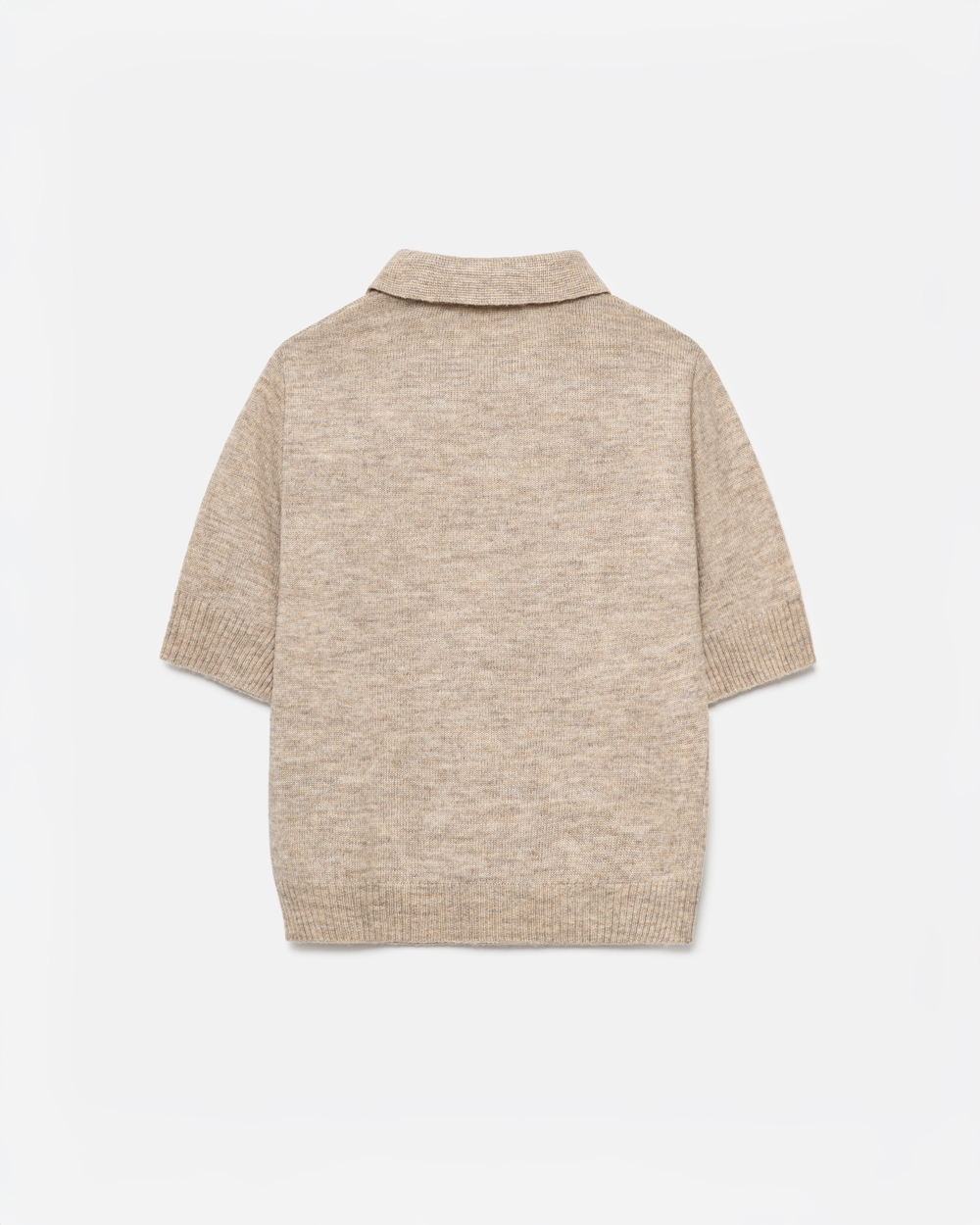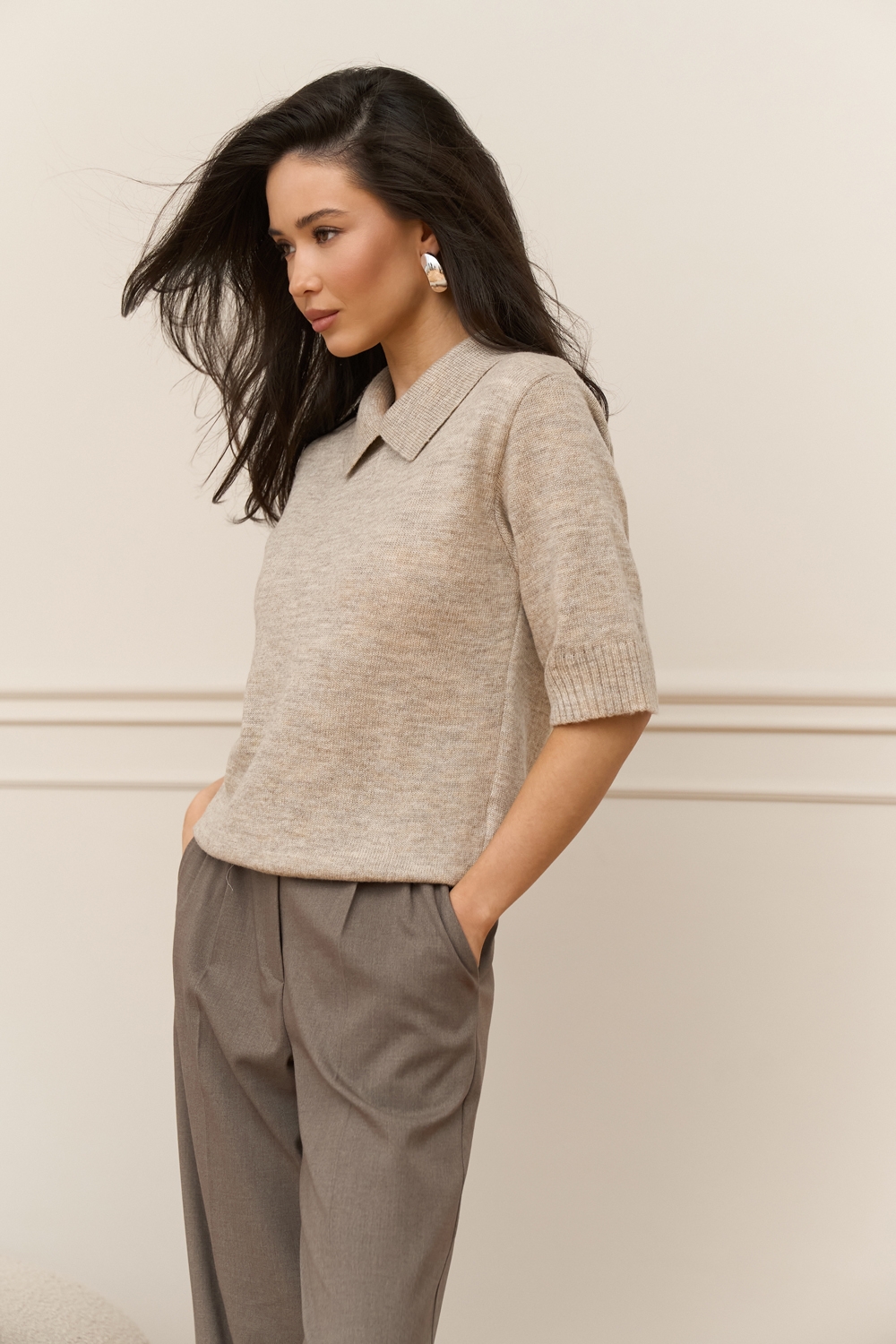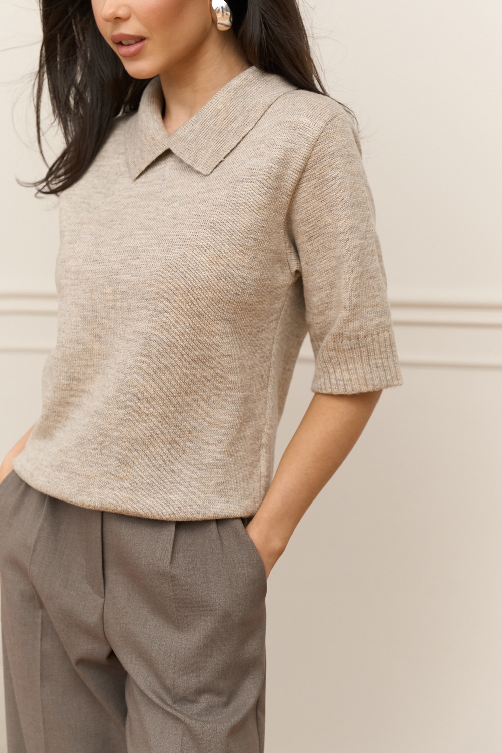 Стильний джемпер з преміальної пряжі бебі-альпаки та мериносової вовни. В’язка середньої щільності, приємна до тіла. Актуальний комірець поло та комфортний рукав до ліктя. По низу виробу фіксуюча резинка.
