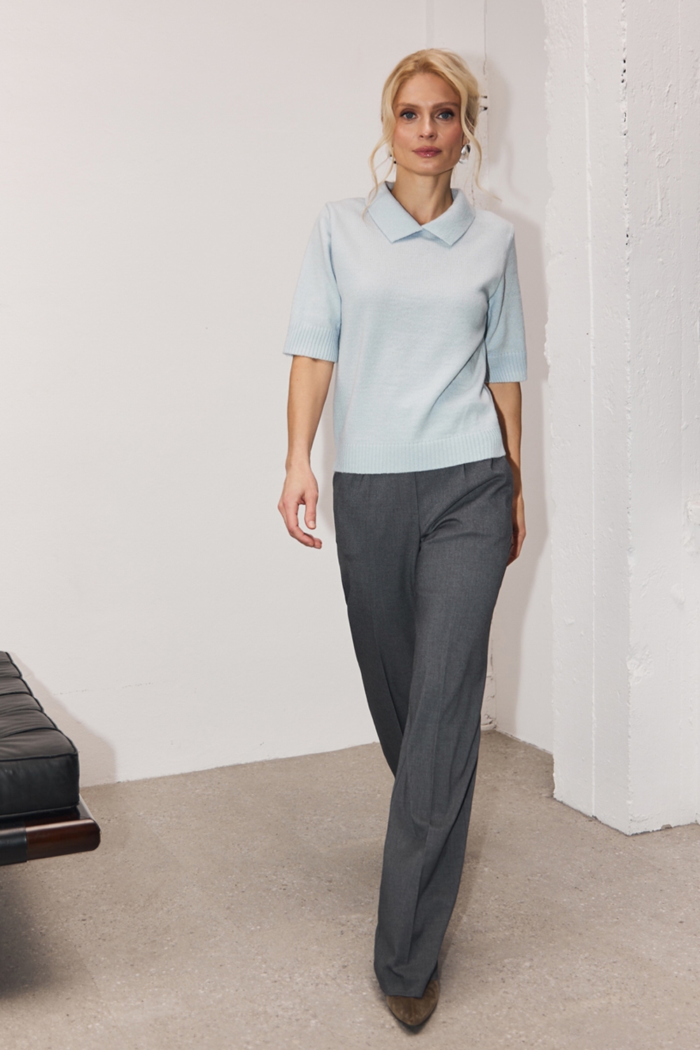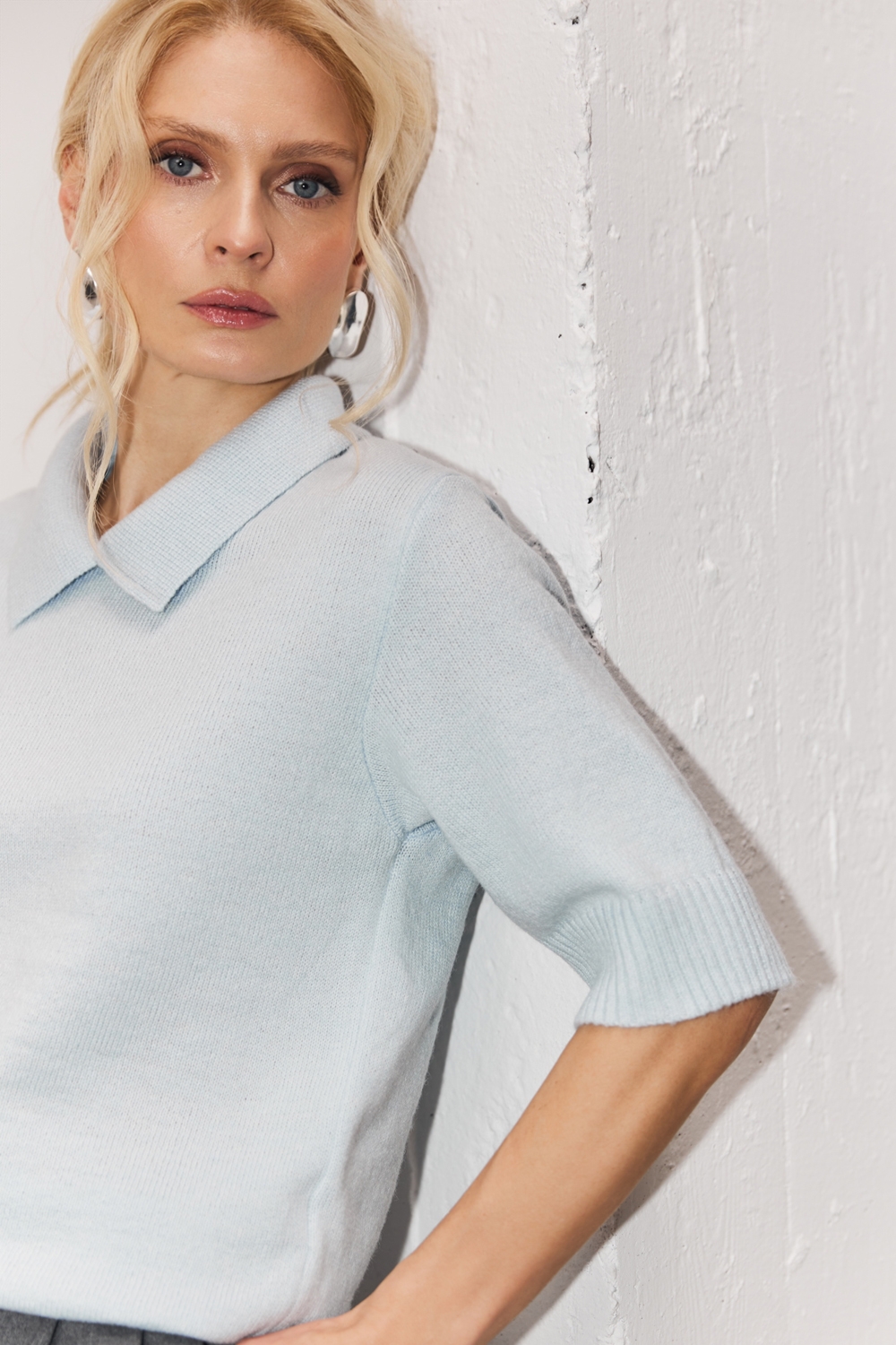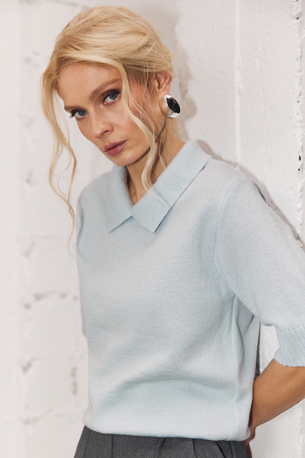 Стильний джемпер з преміальної пряжі бебі-альпаки та мериносової вовни. В’язка середньої щільності, приємна до тіла. Актуальний комірець поло та комфортний рукав до ліктя. По низу виробу фіксуюча резинка.