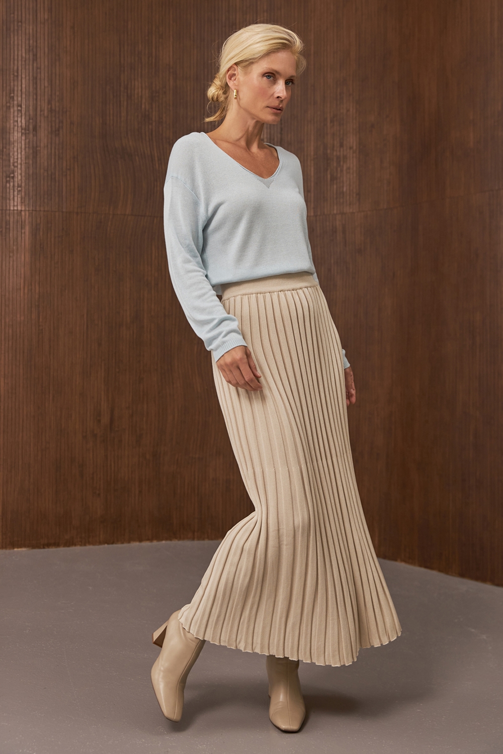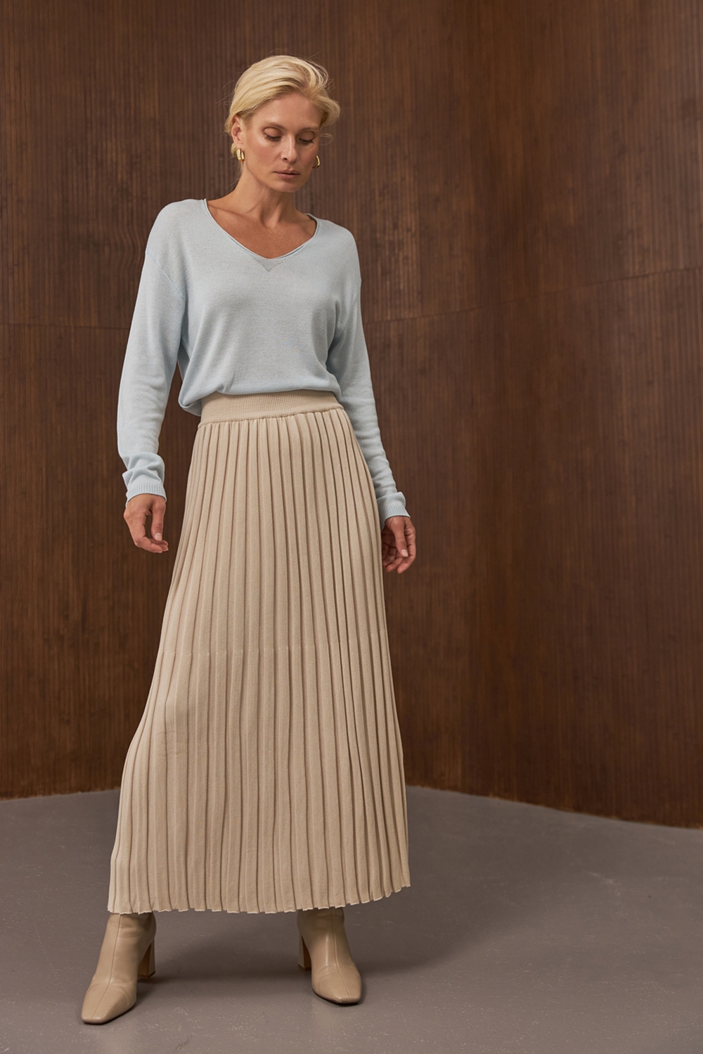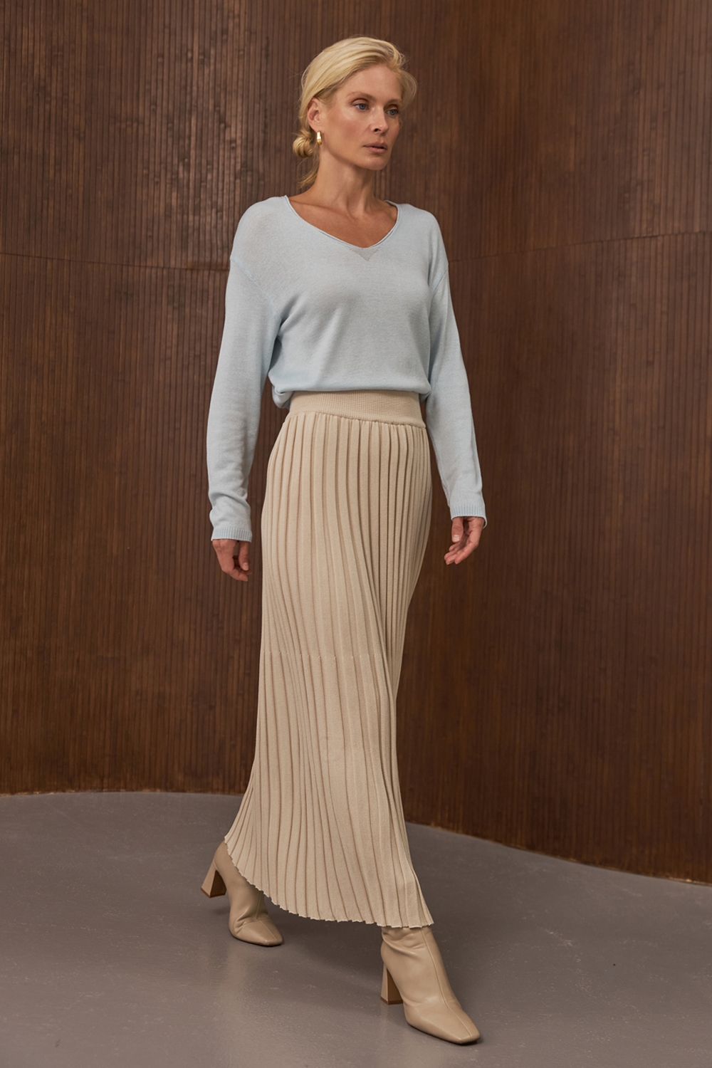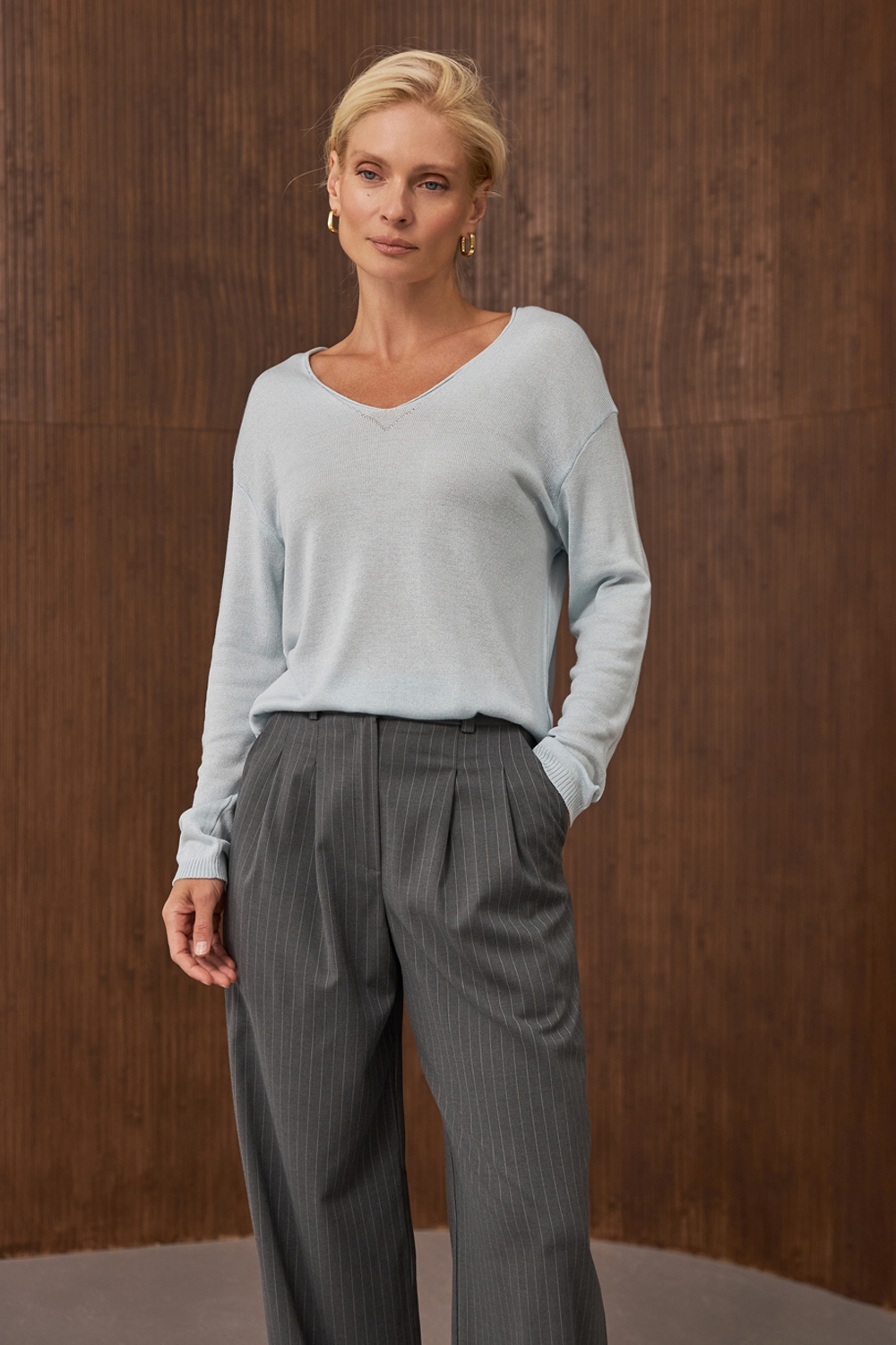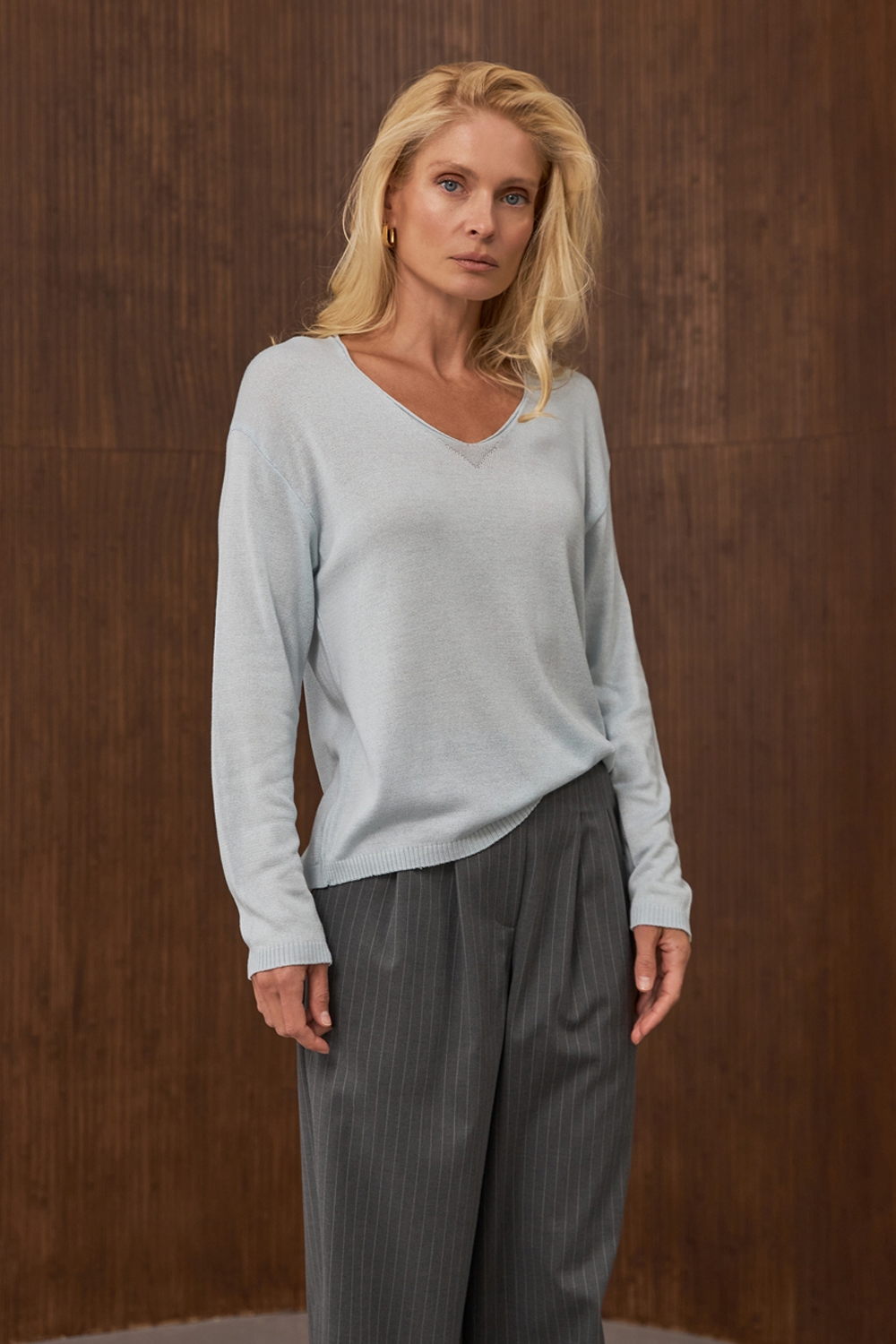 Легкий напівпрозорий джемпер виконаний із віскозної пряжі з додаванням бавовни. М’який і шовковистий на дотик. Зручний V-подібний виріз та спущена лінія плеча додають розслабленості.