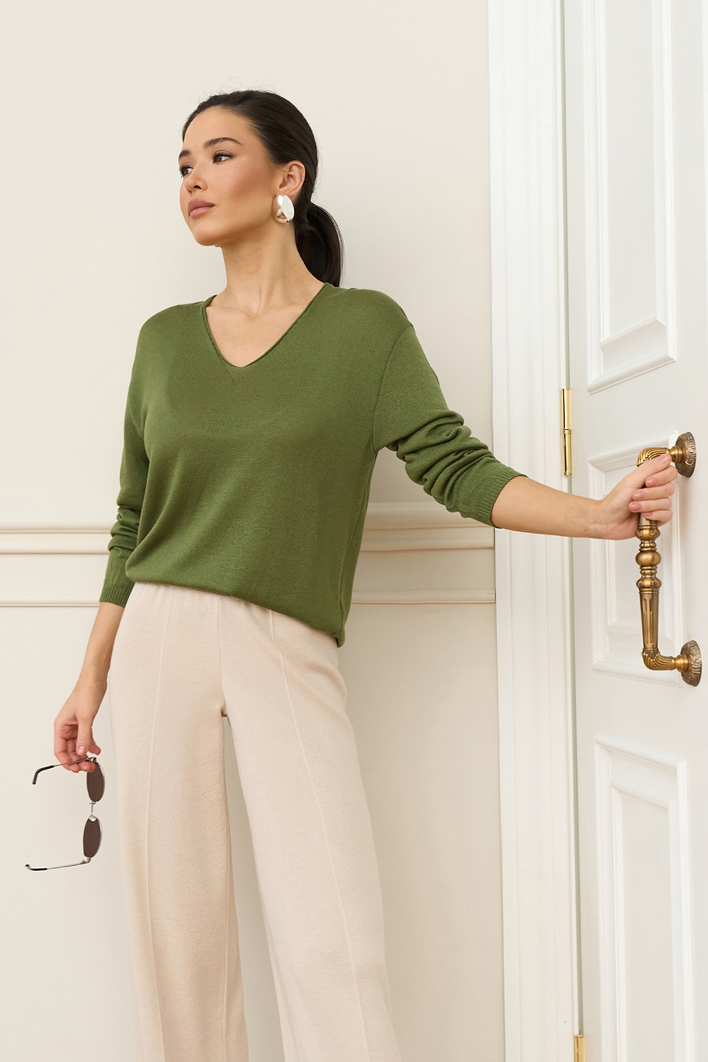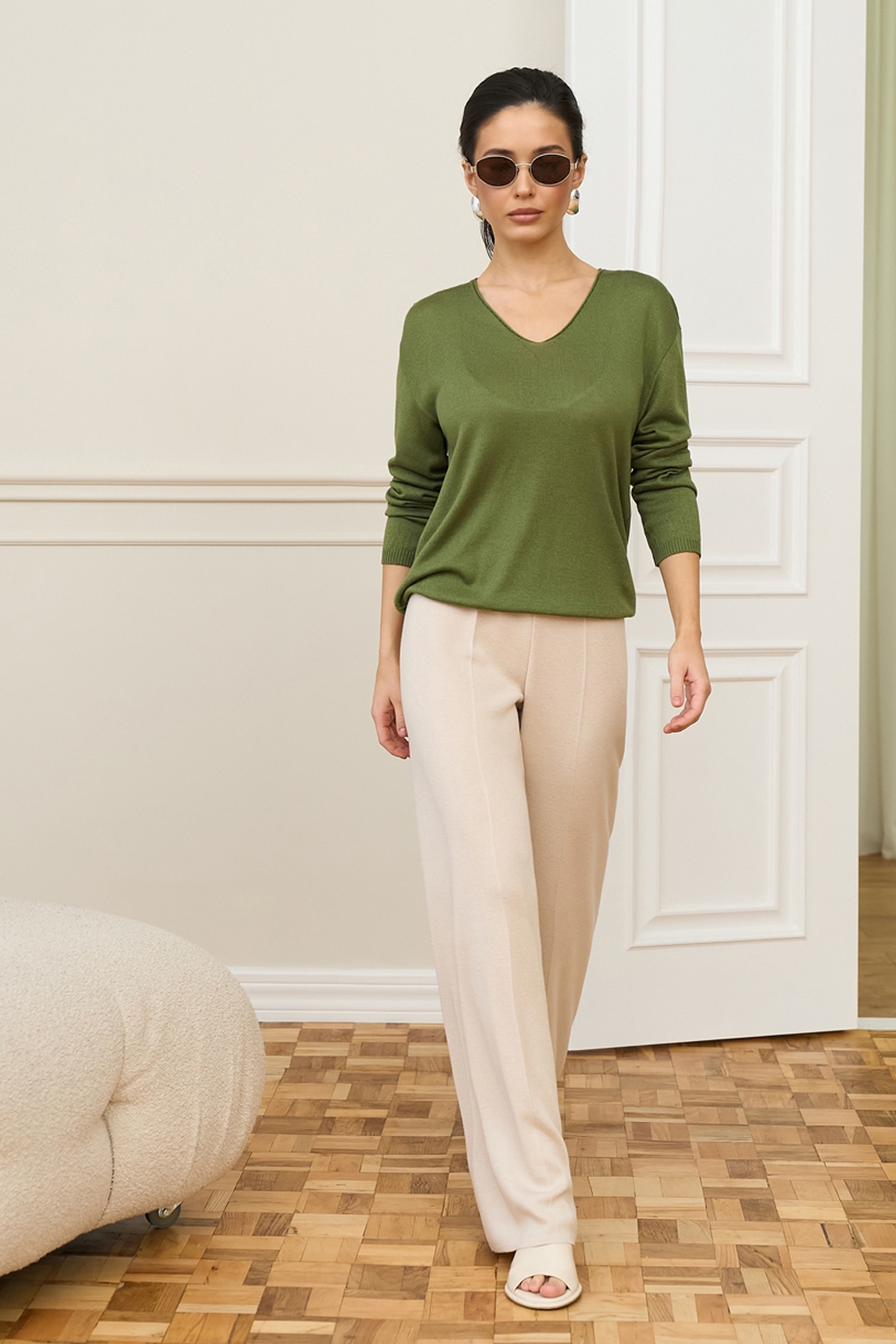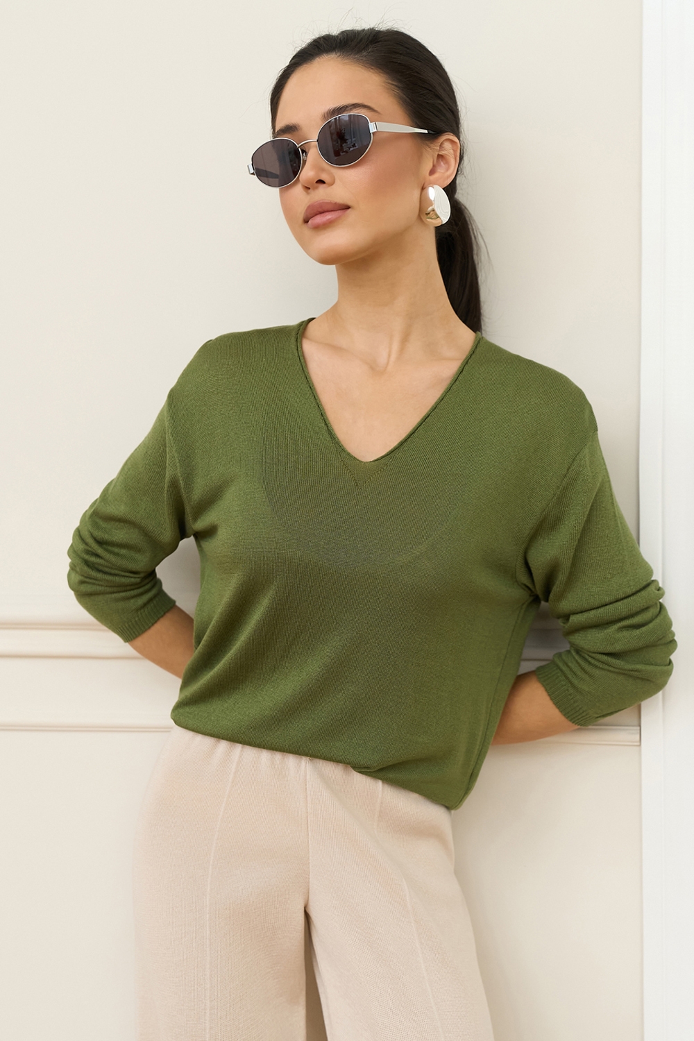 Легкий напівпрозорий джемпер виконаний із віскозної пряжі з додаванням бавовни. М’який і шовковистий на дотик. Зручний V-подібний виріз та спущена лінія плеча додають розслабленості.