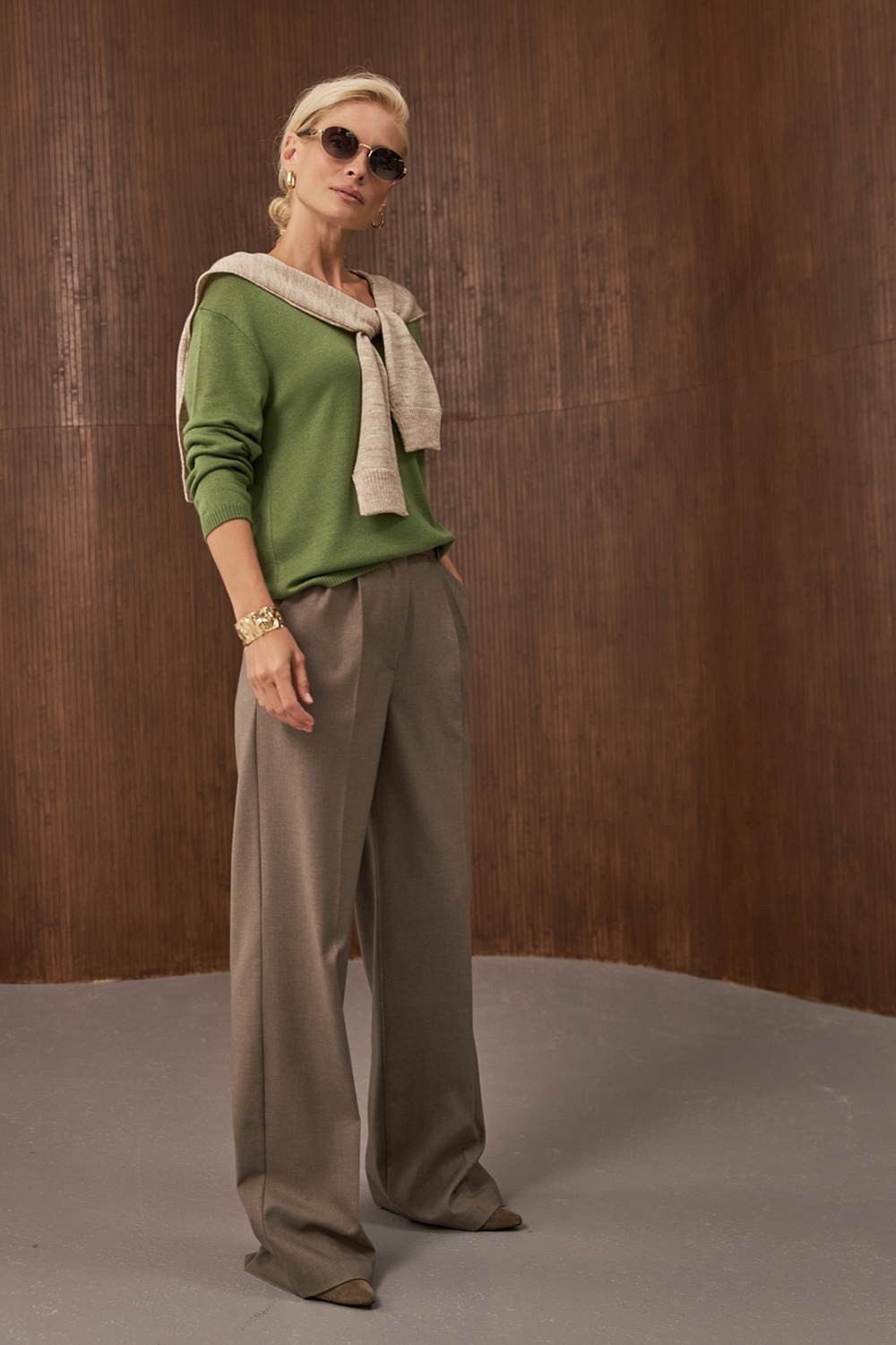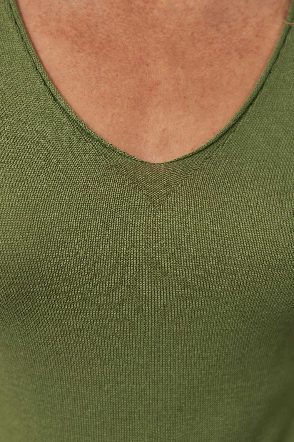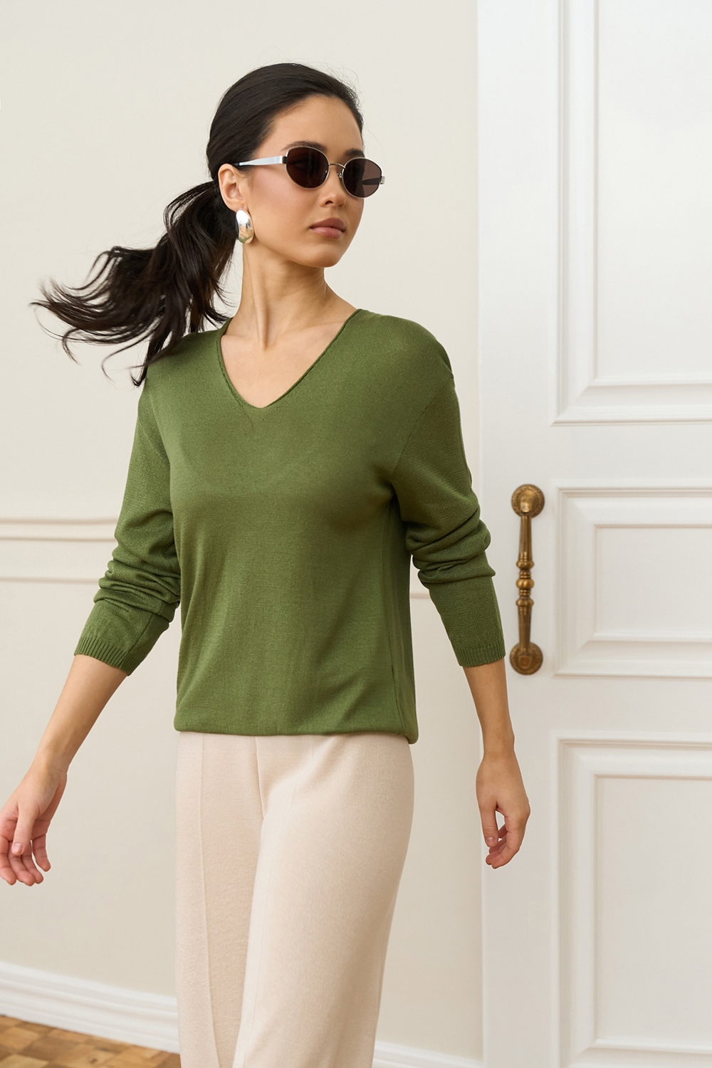 Легкий напівпрозорий джемпер виконаний із віскозної пряжі з додаванням бавовни. М’який і шовковистий на дотик. Зручний V-подібний виріз та спущена лінія плеча додають розслабленості.
