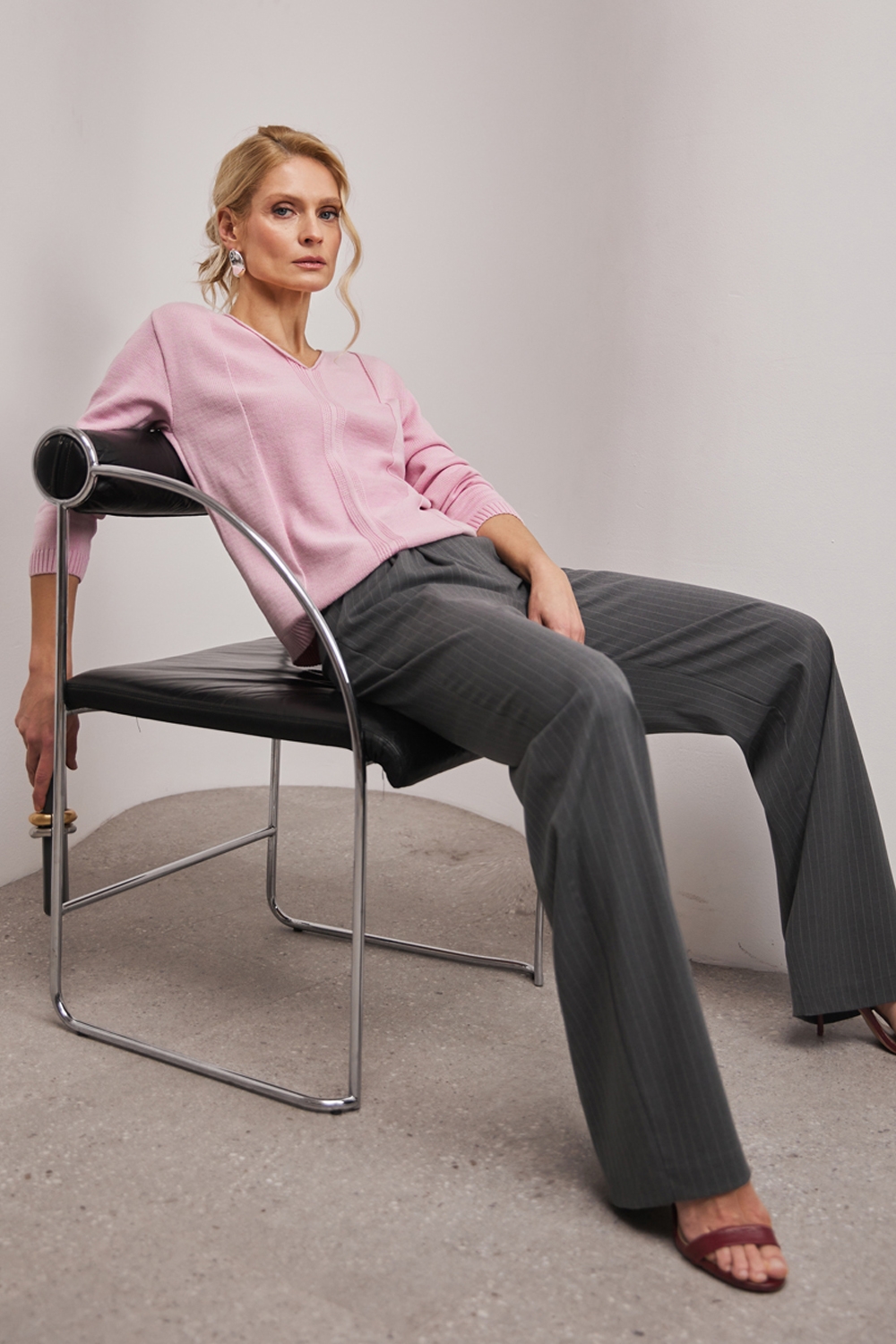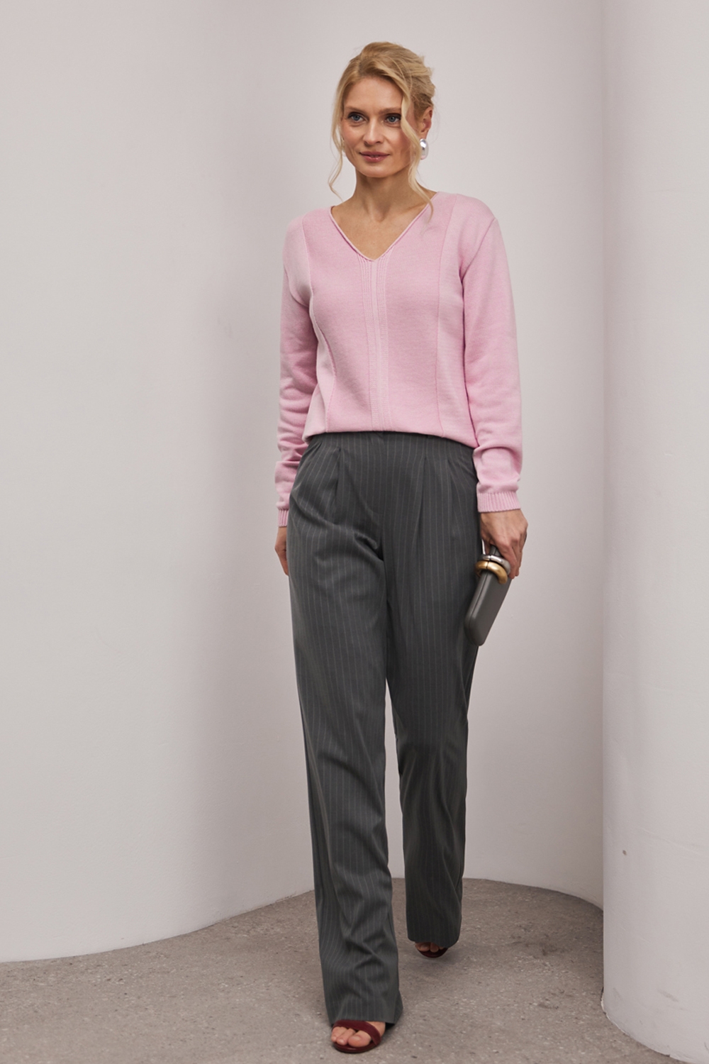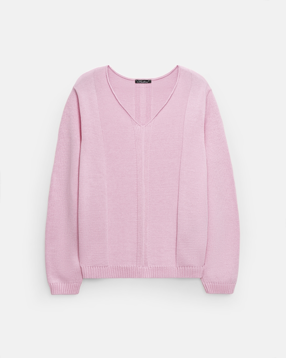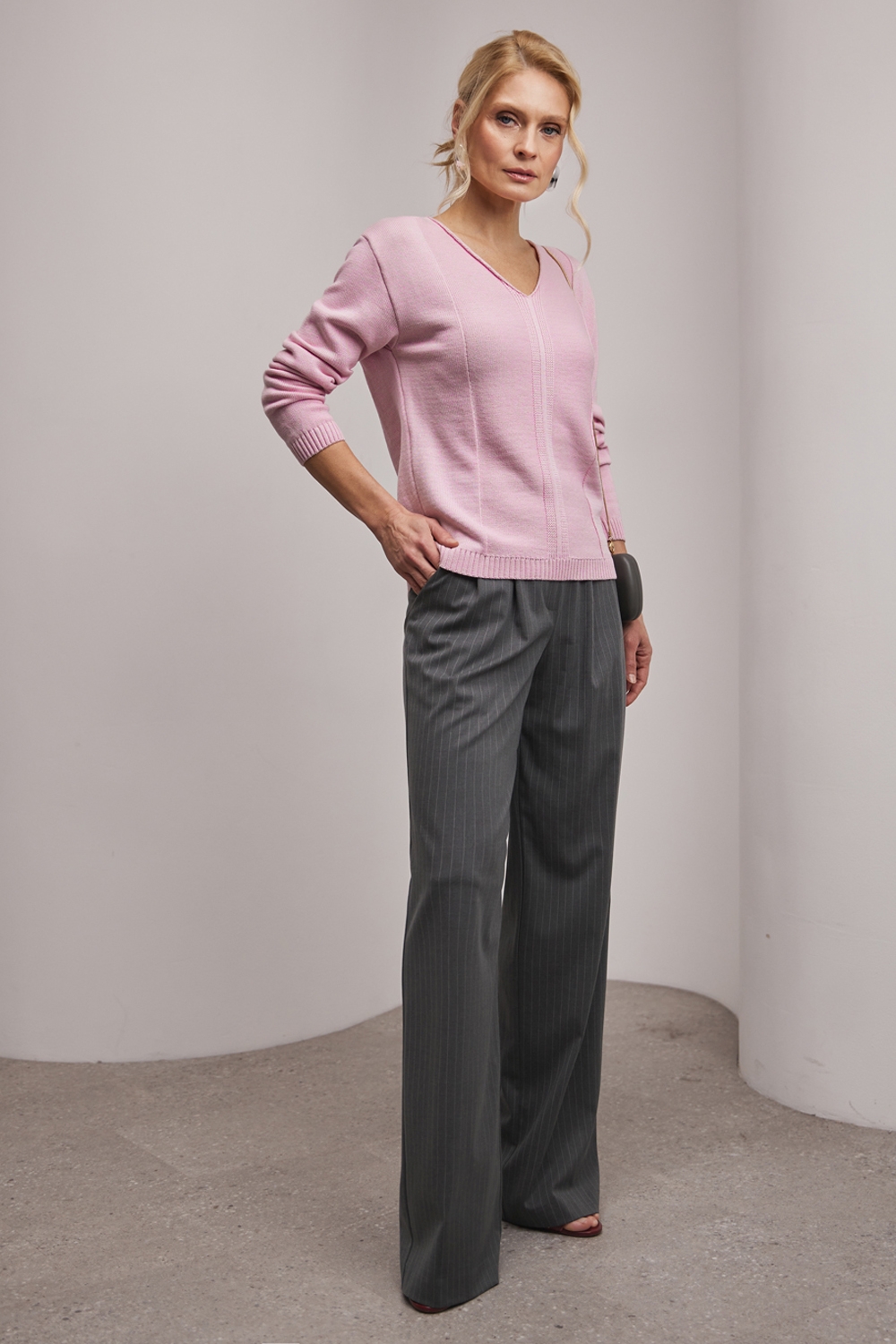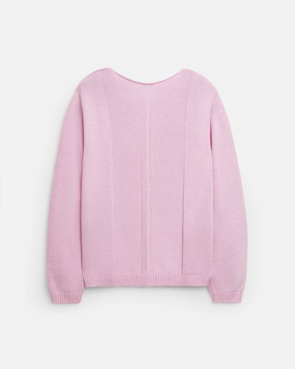 Джемпер із бавовняної пряжі, виконаний щільною гладкою в’язкою. Модель має елегантний V-подібний виріз, вільний силует та доповнена вертикальним візерунком спереду і ззаду.