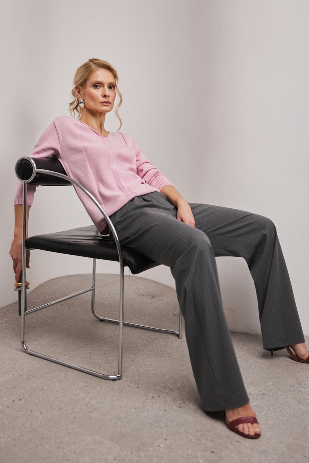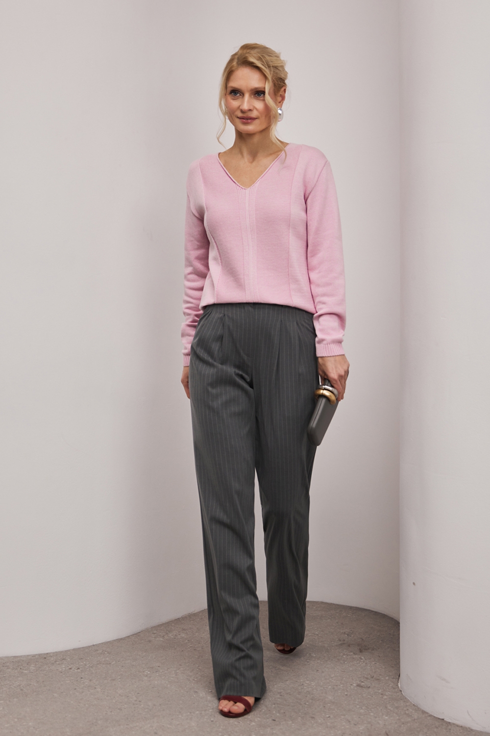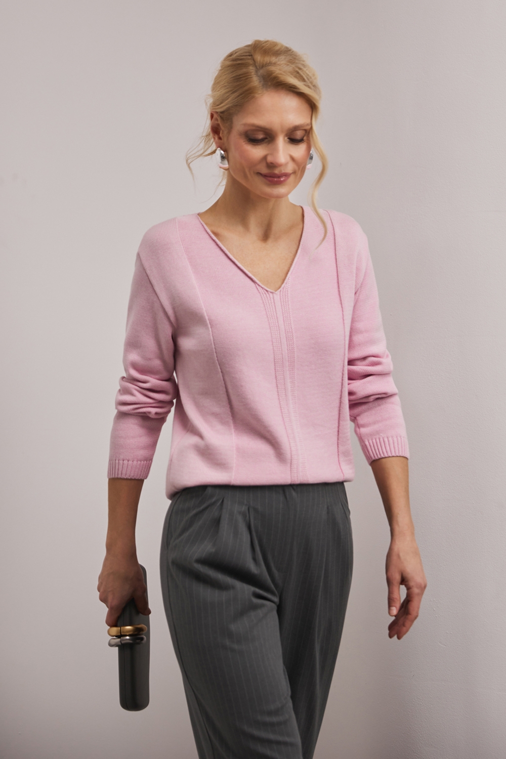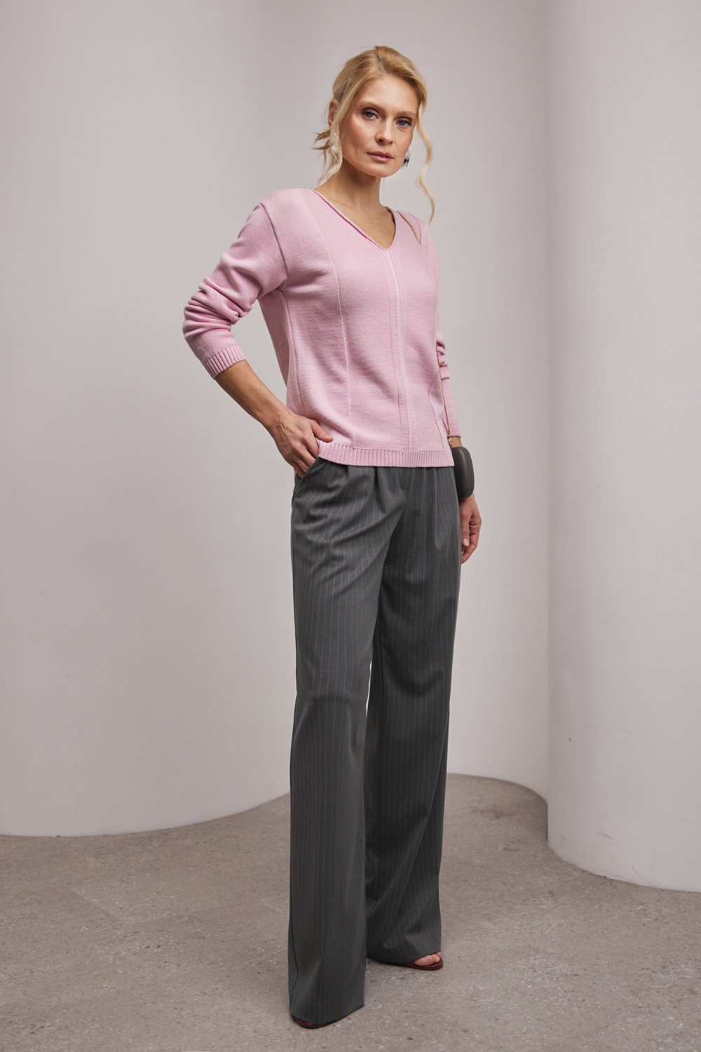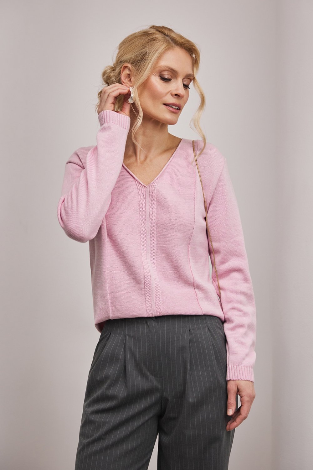 Джемпер із бавовняної пряжі, виконаний щільною гладкою в’язкою. Модель має елегантний V-подібний виріз, вільний силует та доповнена вертикальним візерунком спереду і ззаду.