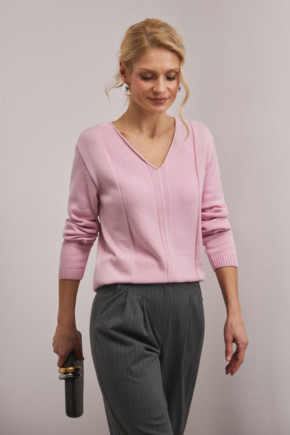 Джемпер із бавовняної пряжі, виконаний щільною гладкою в’язкою. Модель має елегантний V-подібний виріз, вільний силует та доповнена вертикальним візерунком спереду і ззаду.
