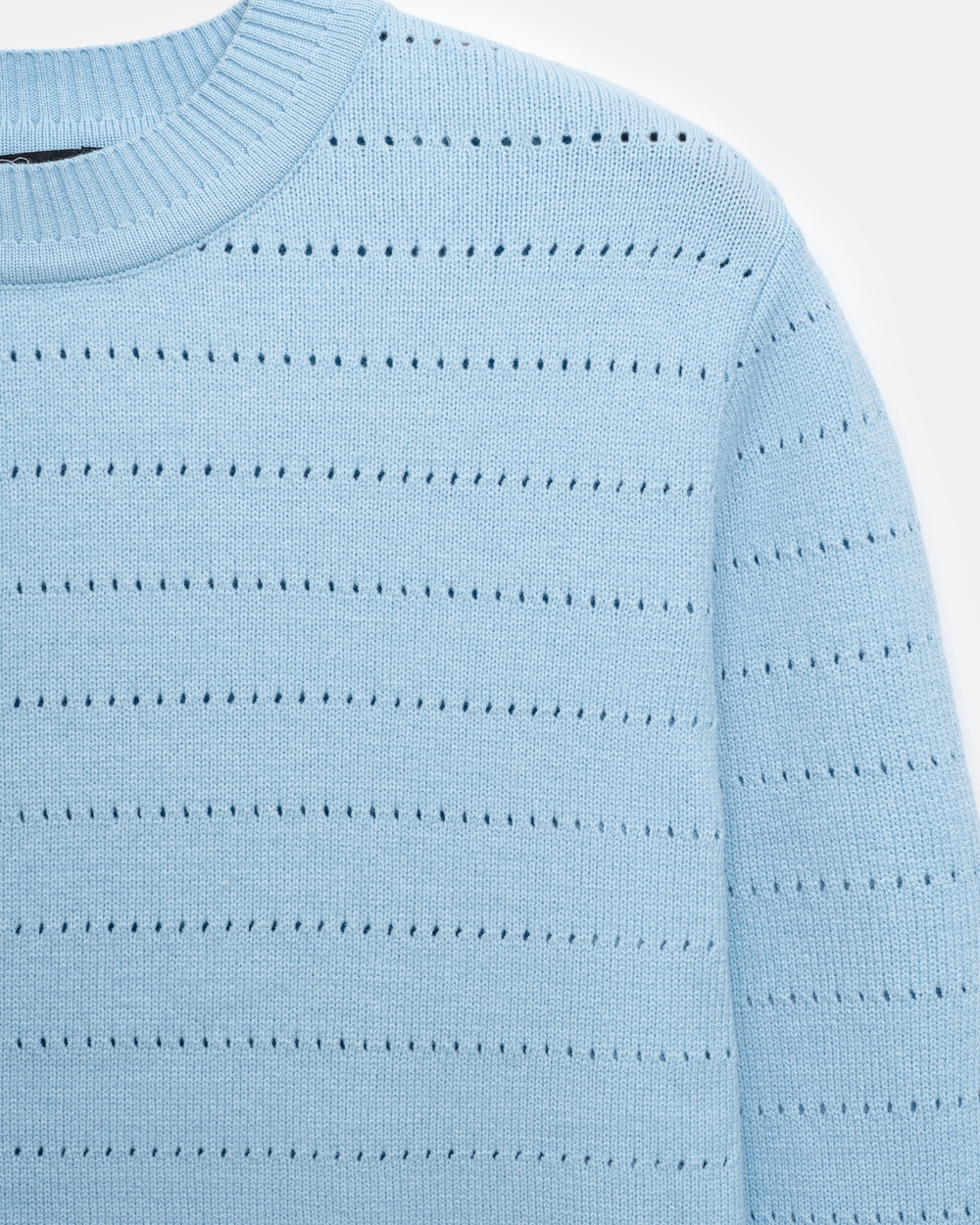 Актуальний джемпер з акцентними манжетами на рукавах і по низу виробу. Модель виконана в’язкою середньої щільності з бавовняної пряжі з додаванням бамбука, чудово тримає форму. Лаконічний візерунок додає витонченості.