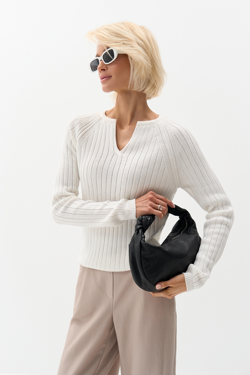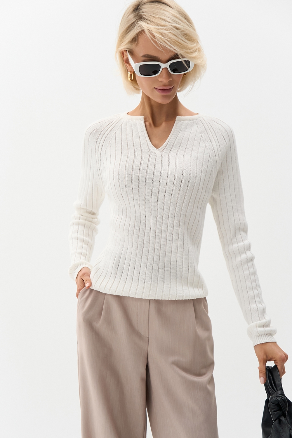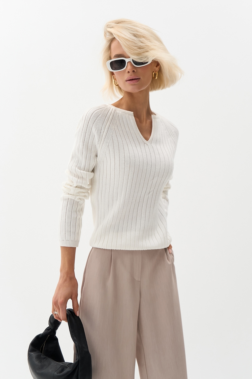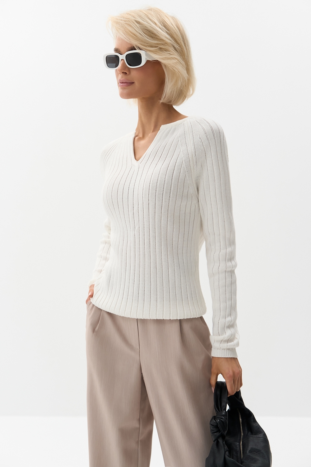 Актуальний джемпер з акцентним V-вирізом та фактурною вертикальною в’язкою у смужку. Модель виготовлена з бавовняної пряжі з додаванням віскози. М'який, еластичний, приємний до тіла.