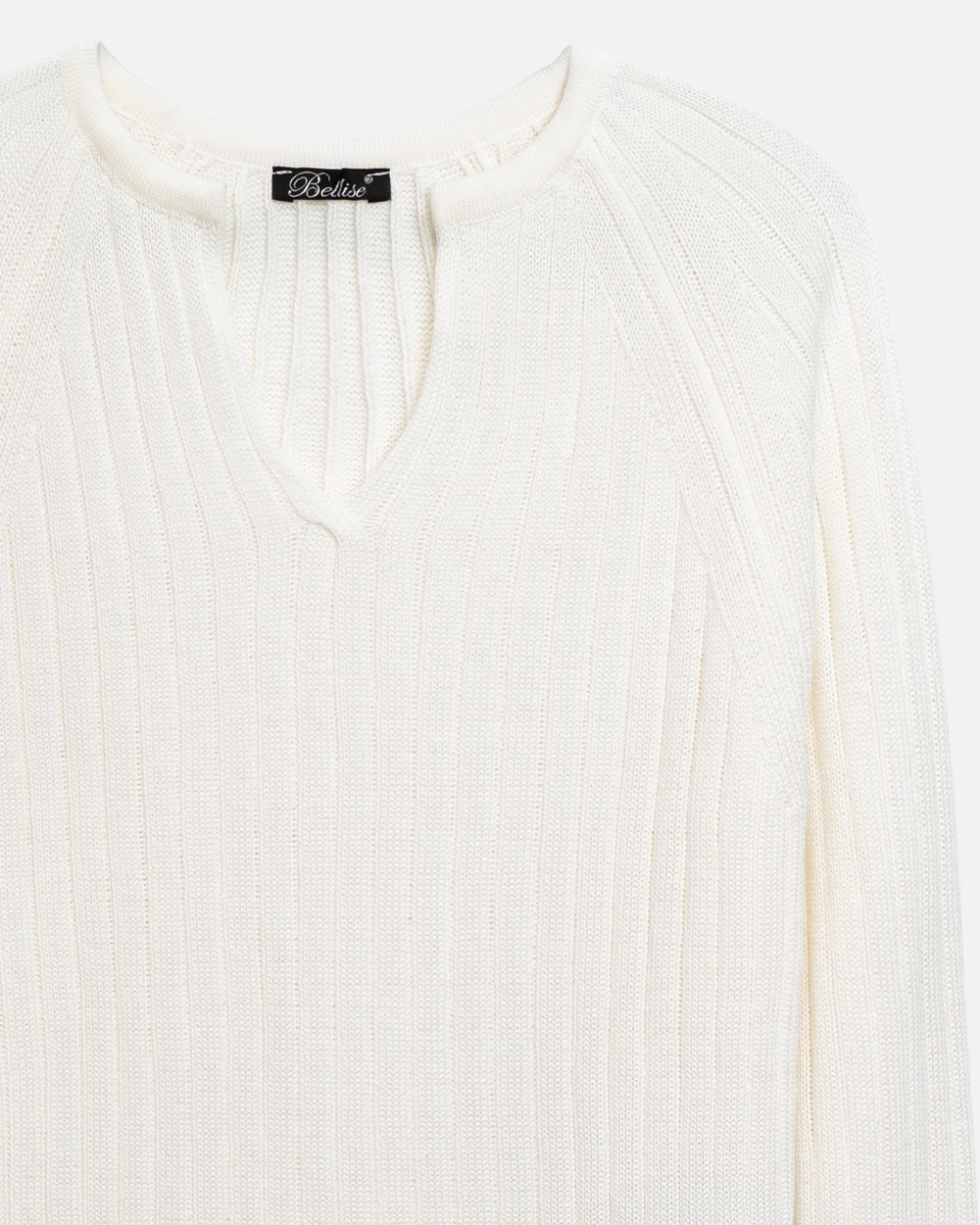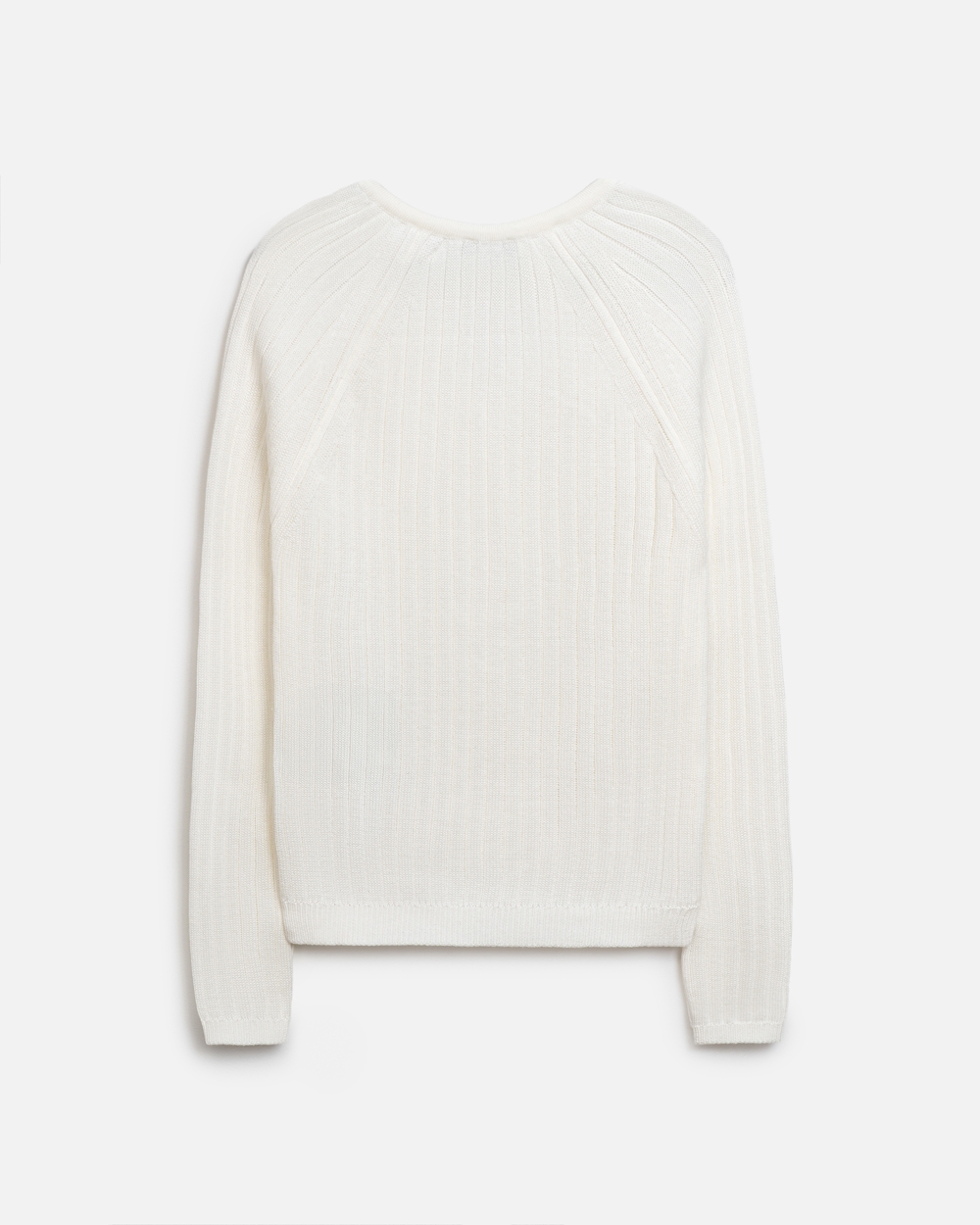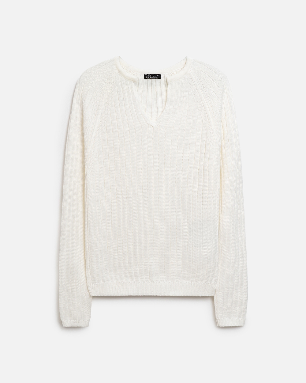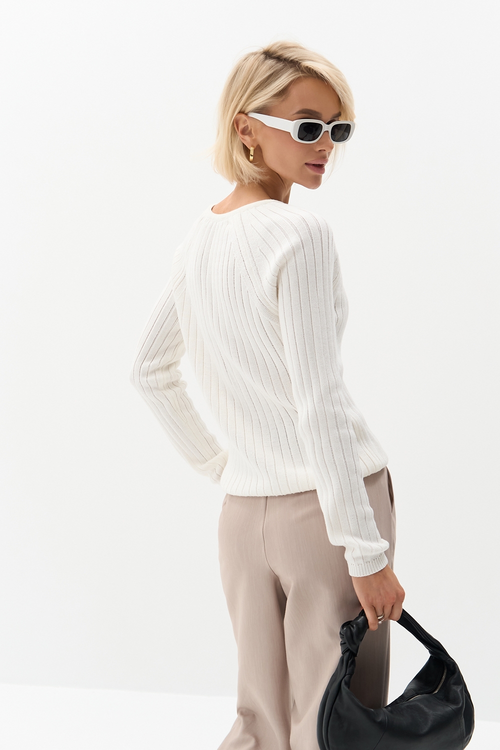 Актуальний джемпер з акцентним V-вирізом та фактурною вертикальною в’язкою у смужку. Модель виготовлена з бавовняної пряжі з додаванням віскози. М'який, еластичний, приємний до тіла.