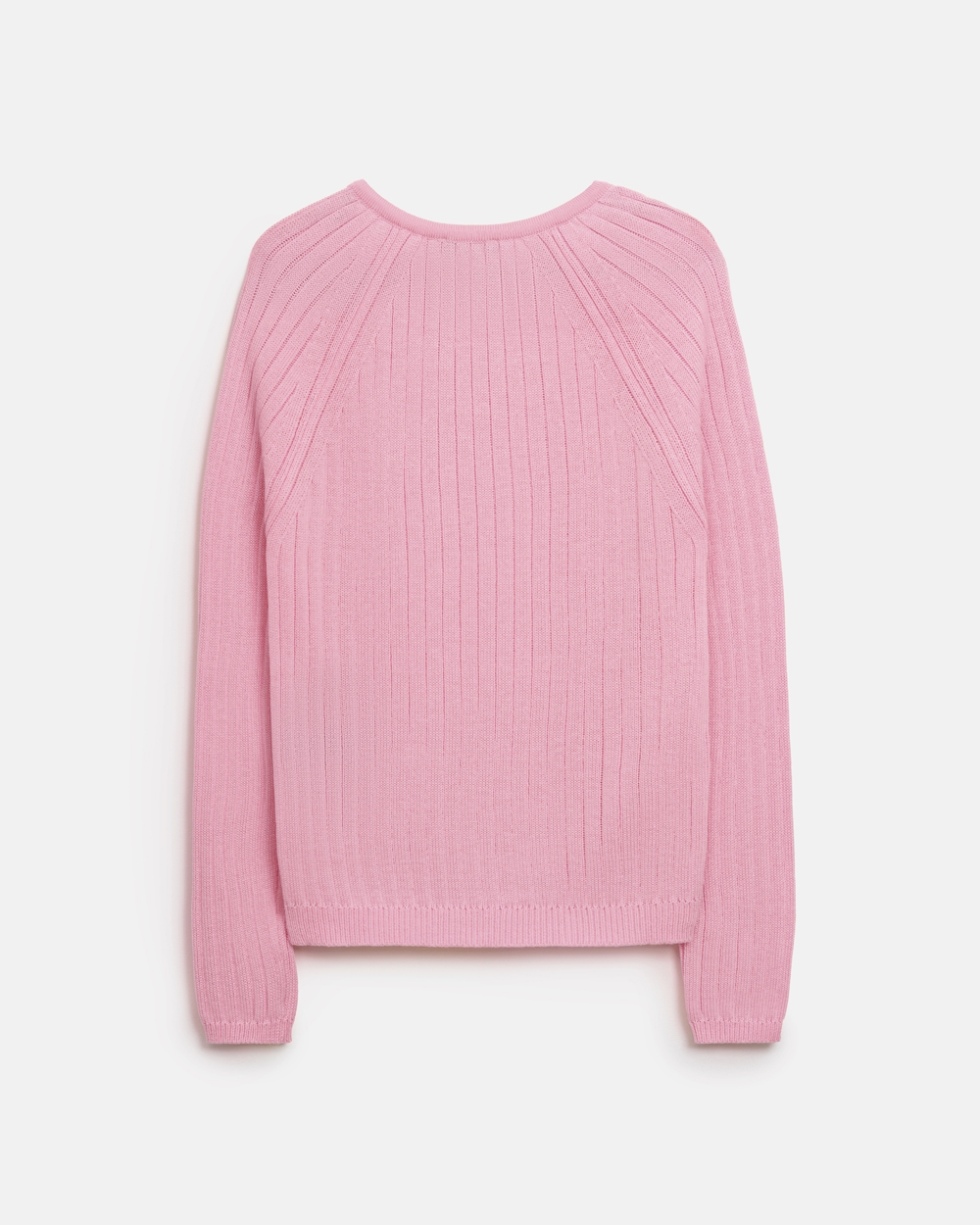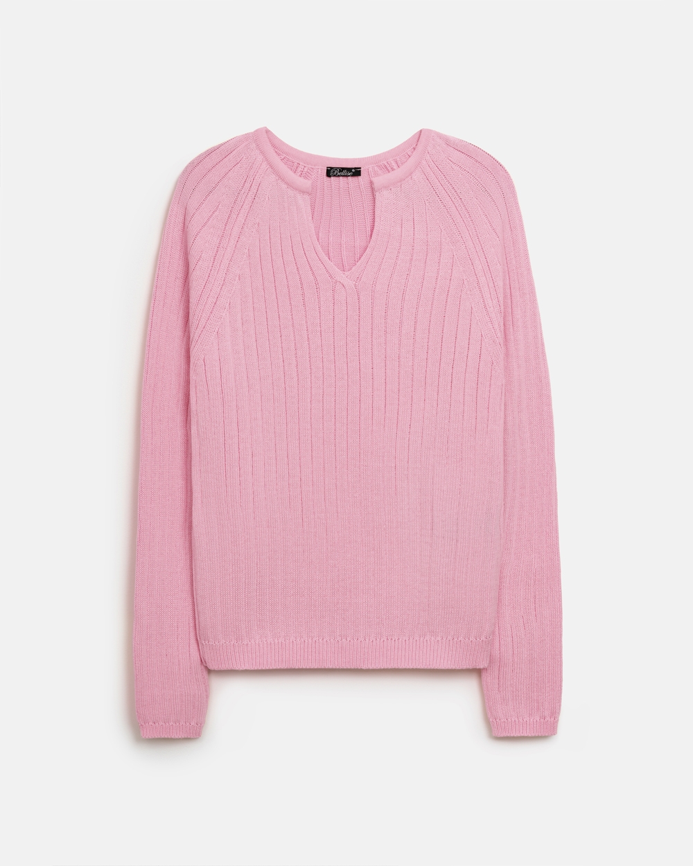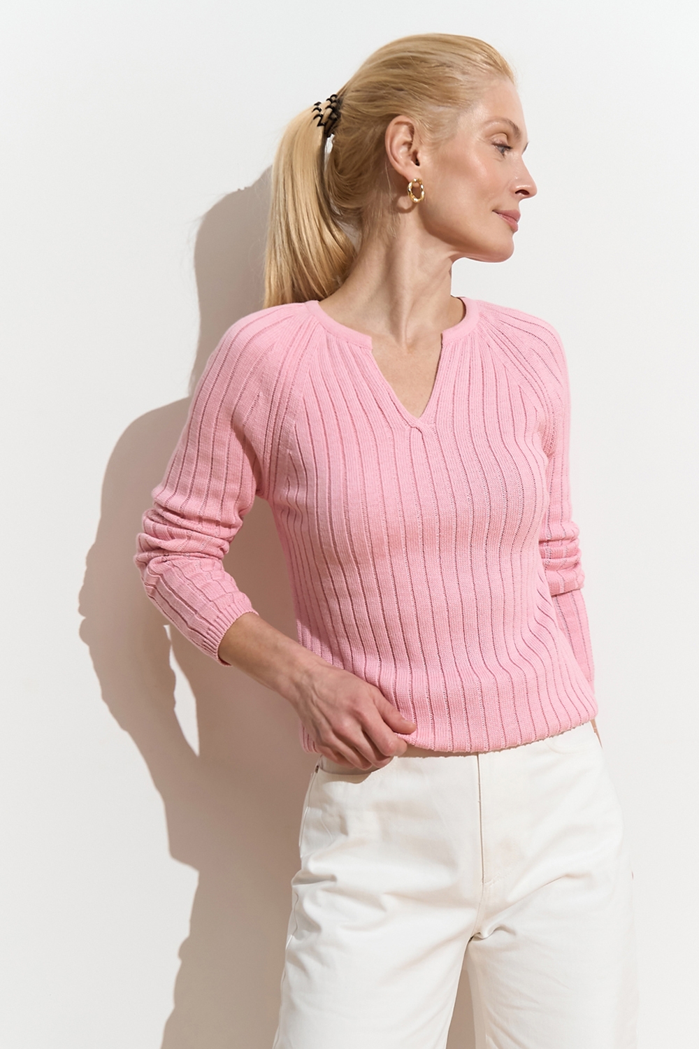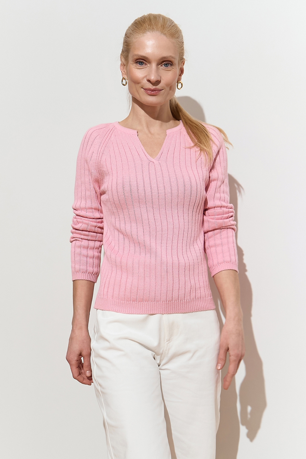 Актуальний джемпер з акцентним V-вирізом та фактурною вертикальною в’язкою у смужку. Модель виготовлена з бавовняної пряжі з додаванням віскози. М'який, еластичний, приємний до тіла.