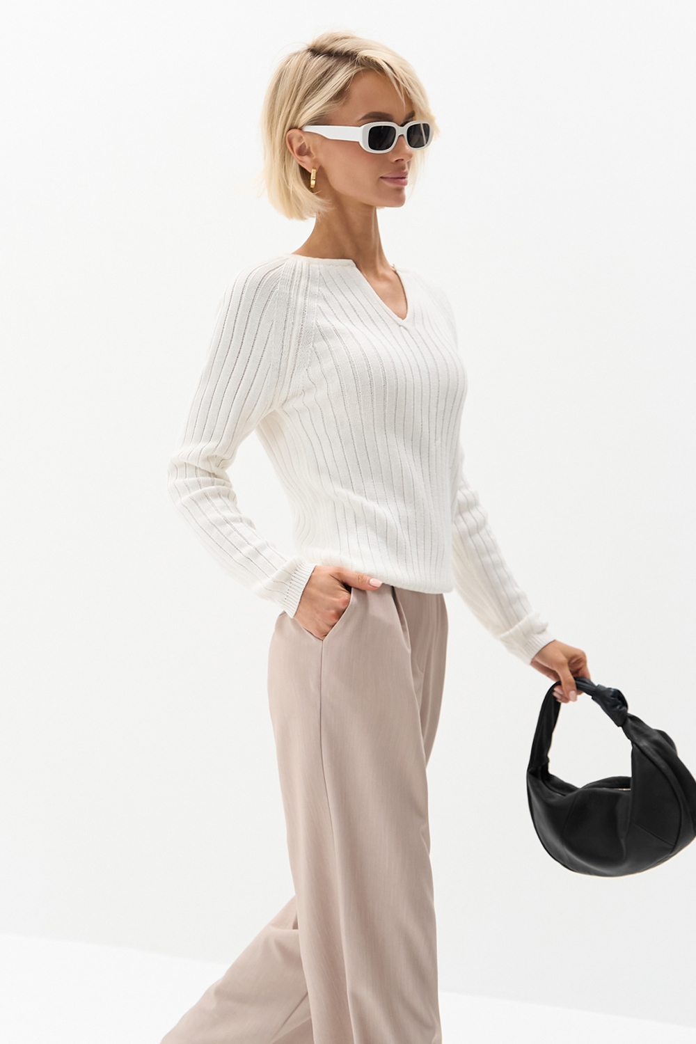 Актуальний джемпер з акцентним V-вирізом та фактурною вертикальною в’язкою у смужку. Модель виготовлена з бавовняної пряжі з додаванням віскози. М'який, еластичний, приємний до тіла.