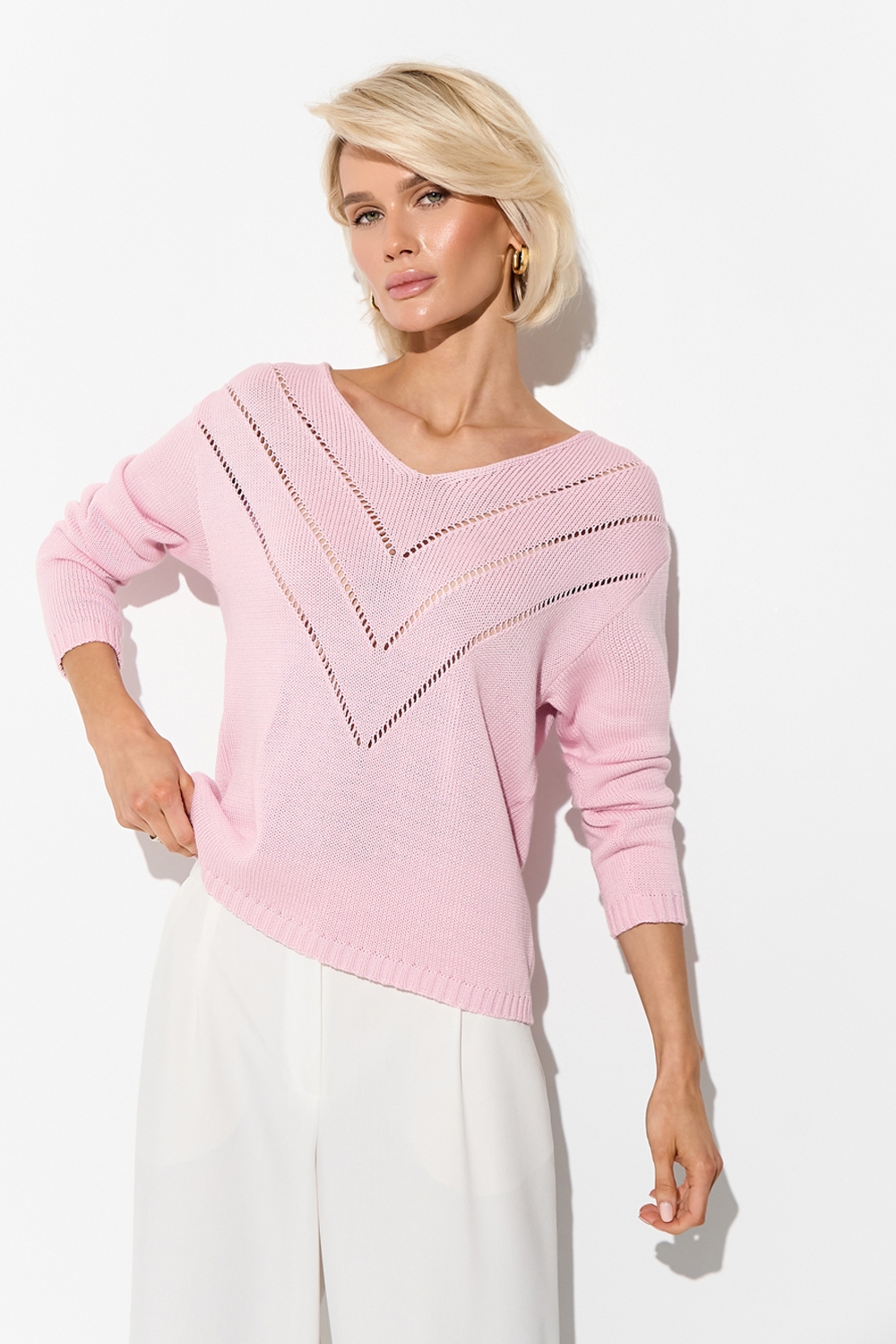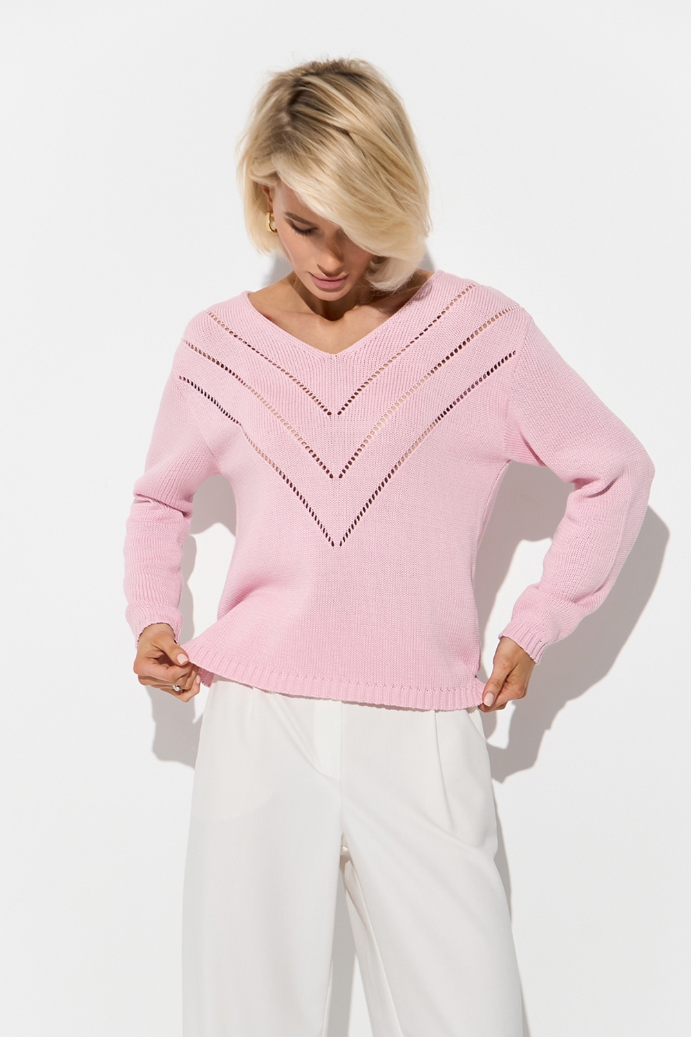 Лаконічний джемпер з акуратним візерунком спереду. Модель виготовлена з бавовняної пряжі з додаванням віскози щільним плетінням. Джемпер вільного силуету зі спущеною лінією плеча.