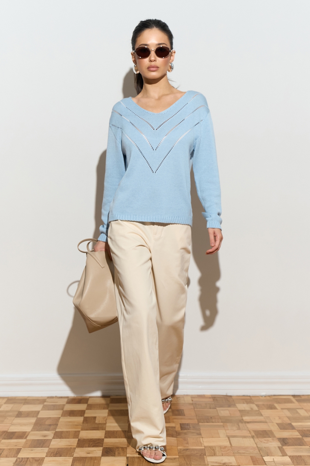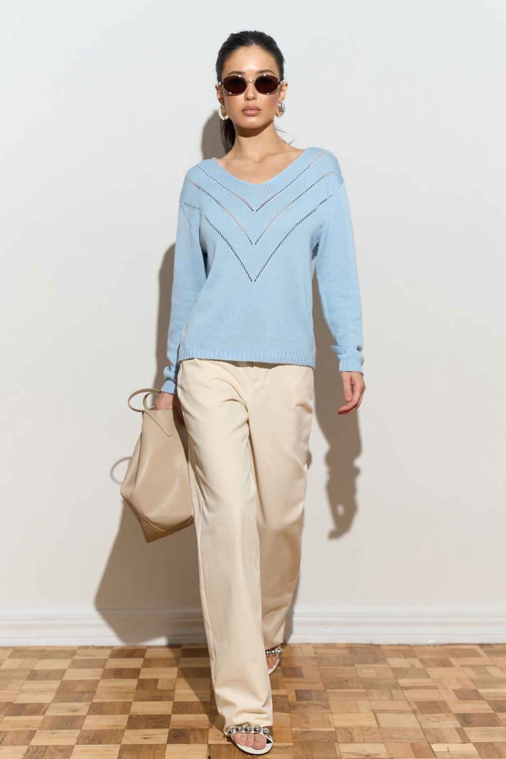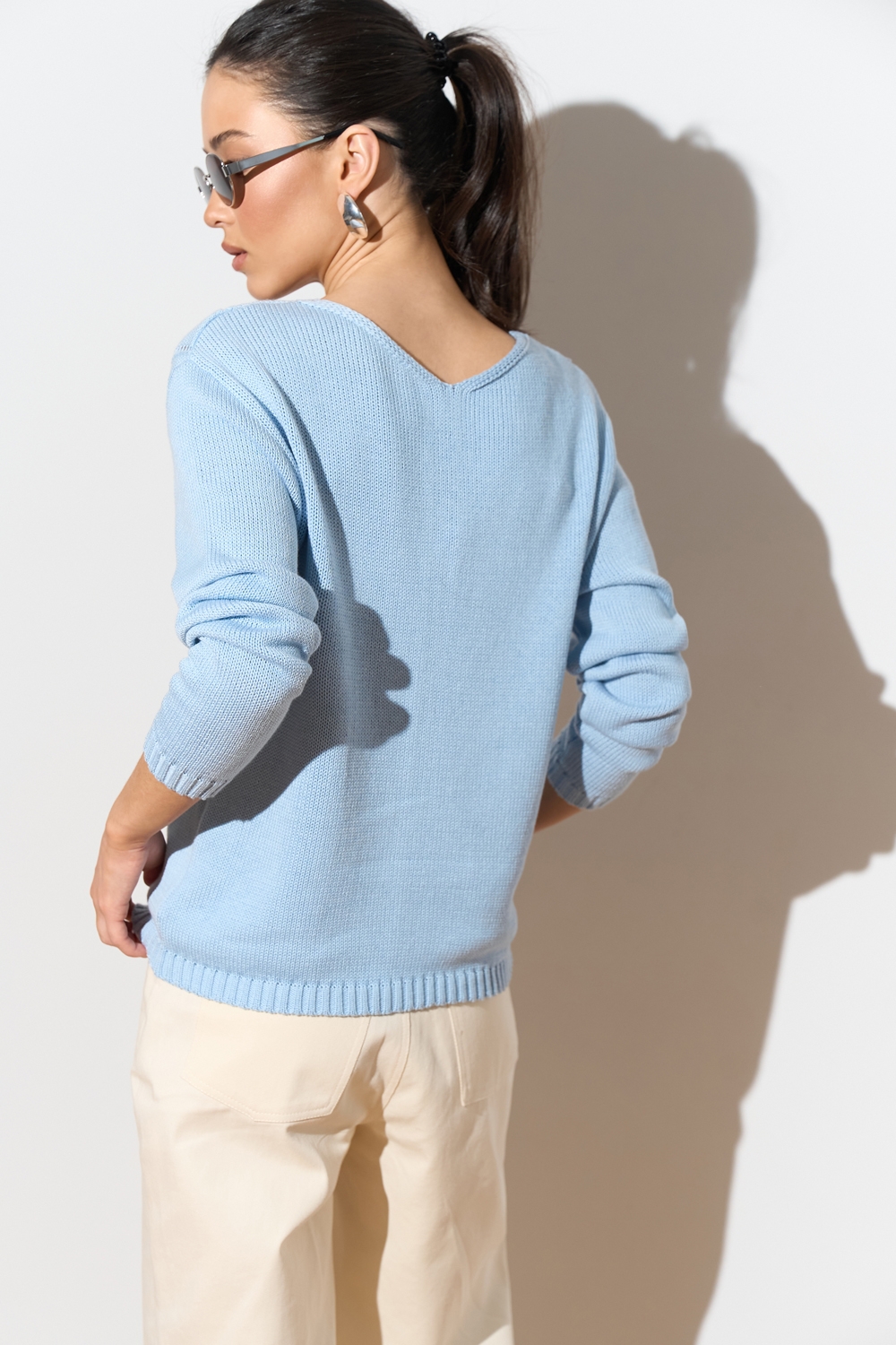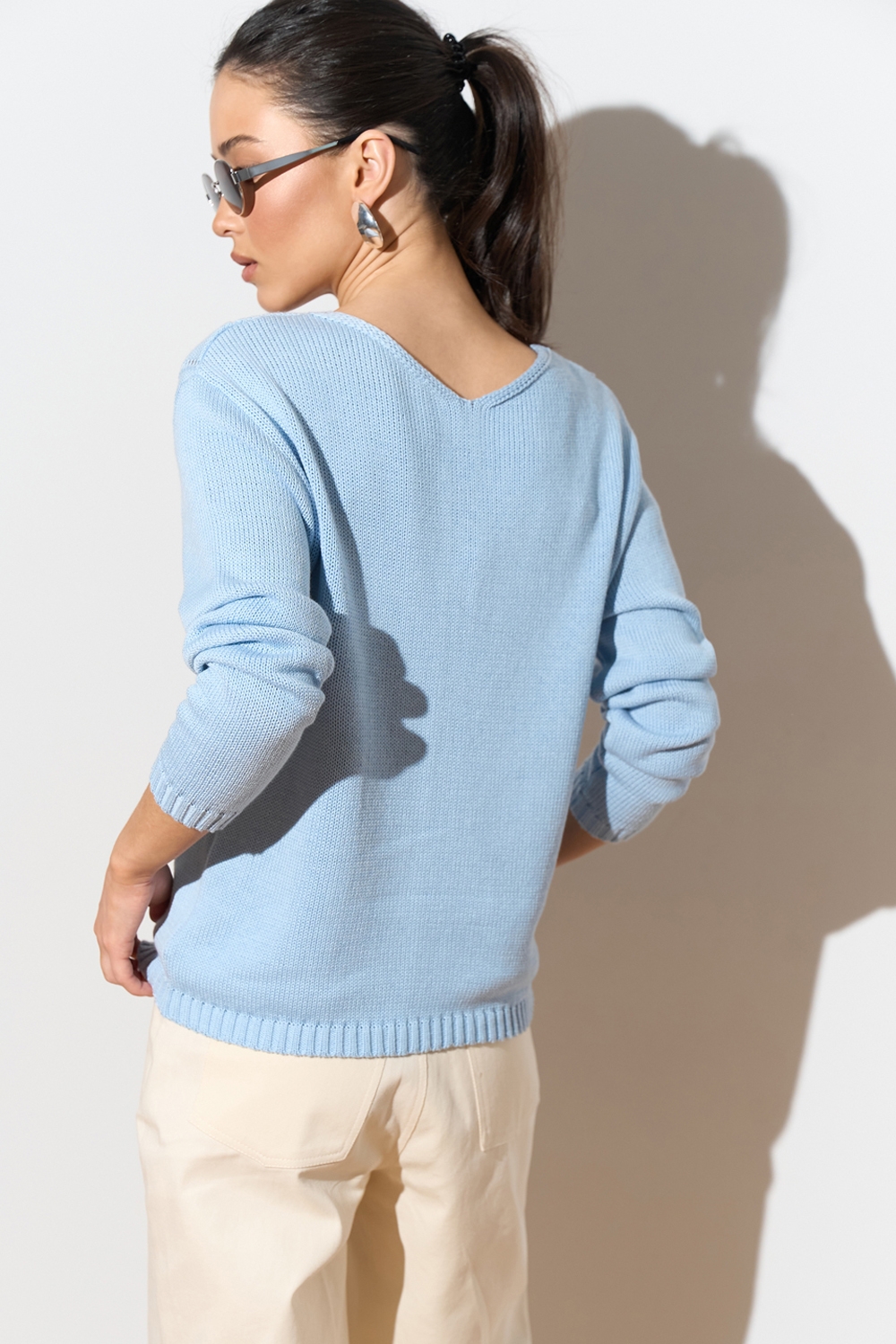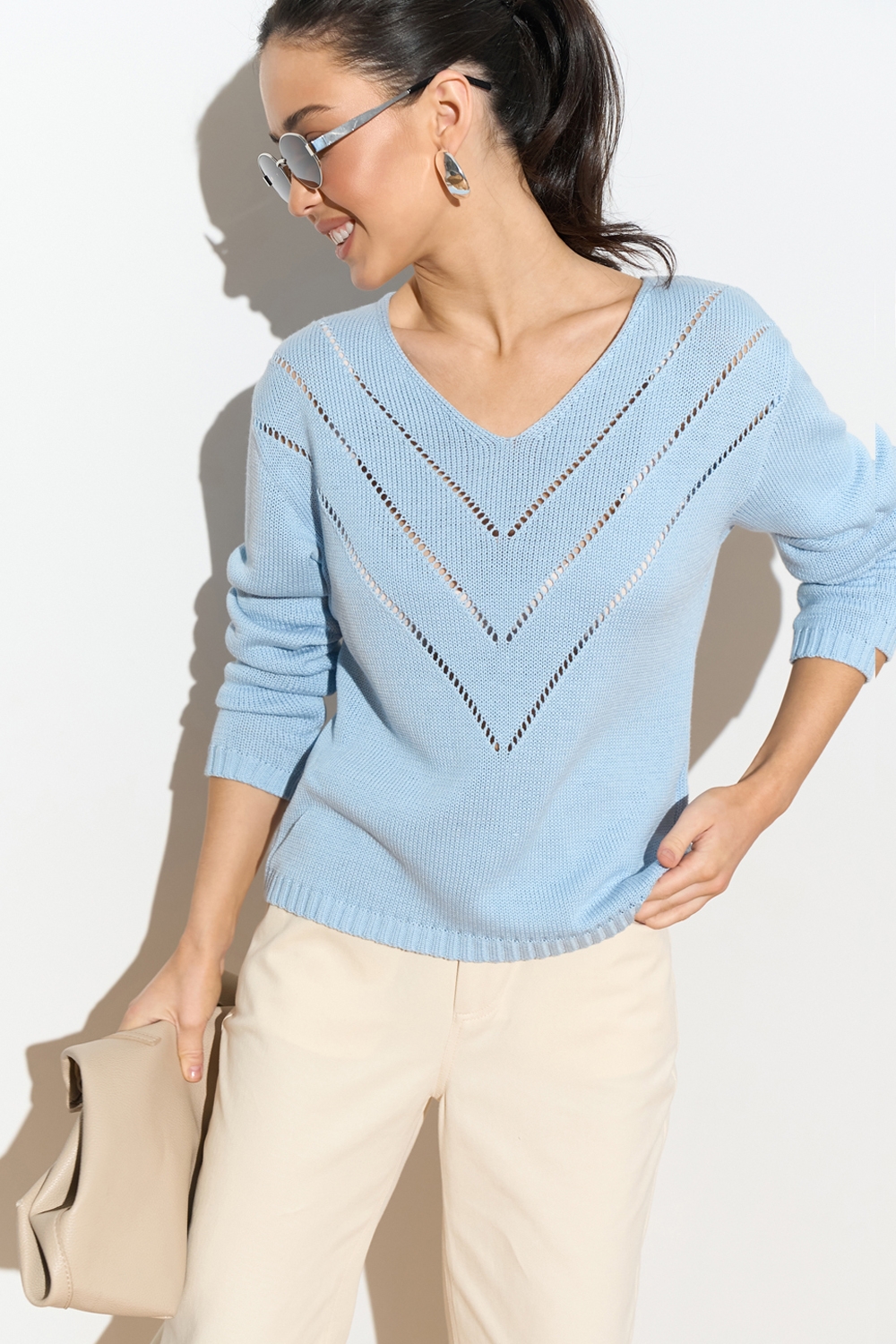 Лаконічний джемпер з акуратним візерунком спереду. Модель виготовлена з бавовняної пряжі з додаванням віскози щільним плетінням. Джемпер вільного силуету зі спущеною лінією плеча.