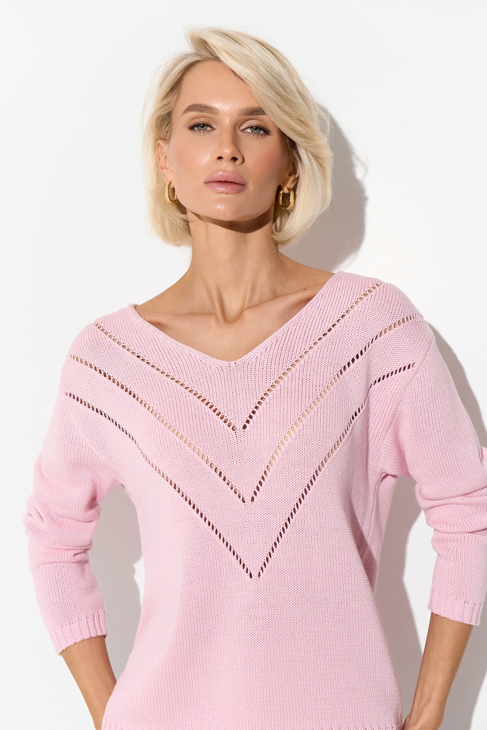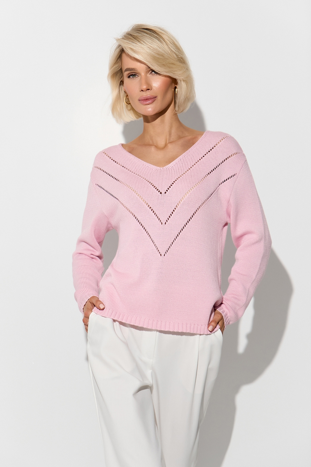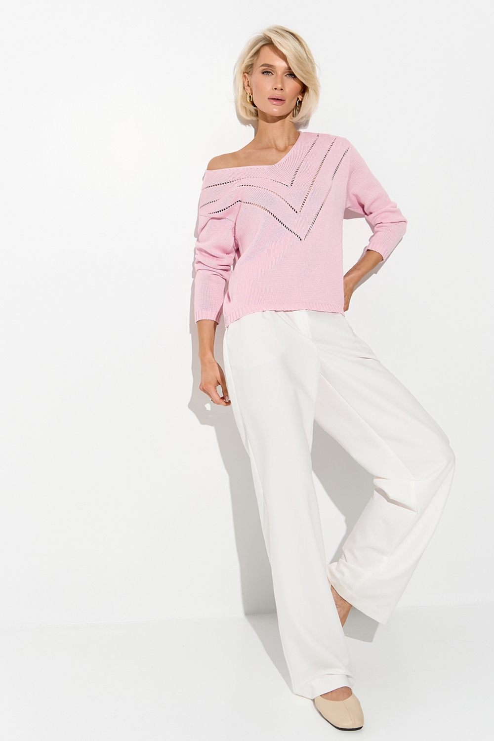 Лаконічний джемпер з акуратним візерунком спереду. Модель виготовлена з бавовняної пряжі з додаванням віскози щільним плетінням. Джемпер вільного силуету зі спущеною лінією плеча.
