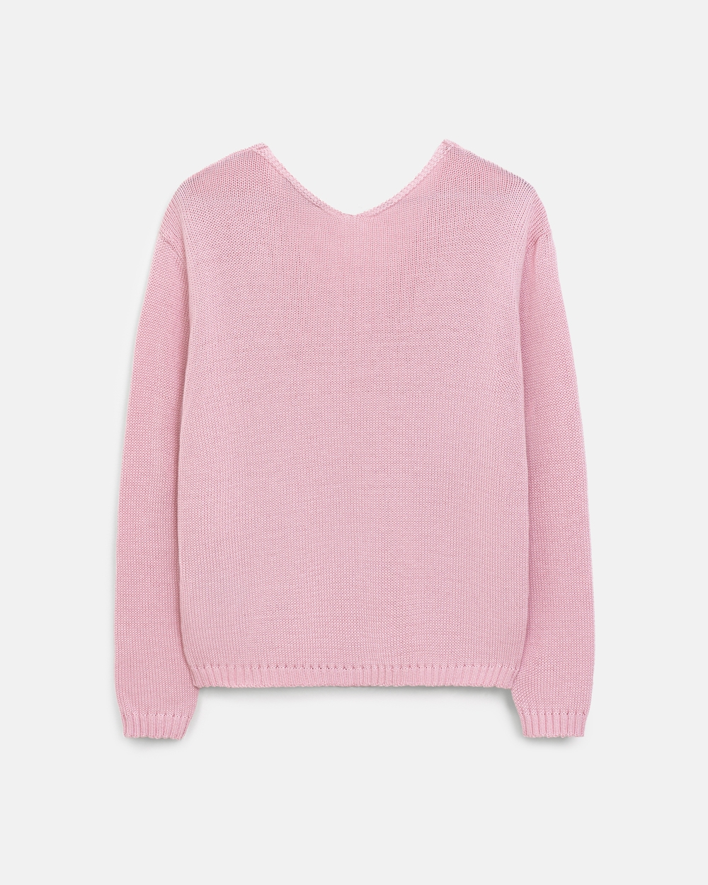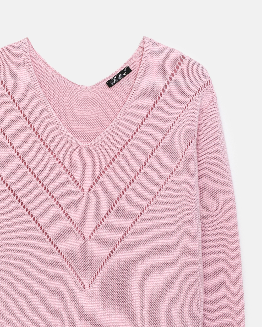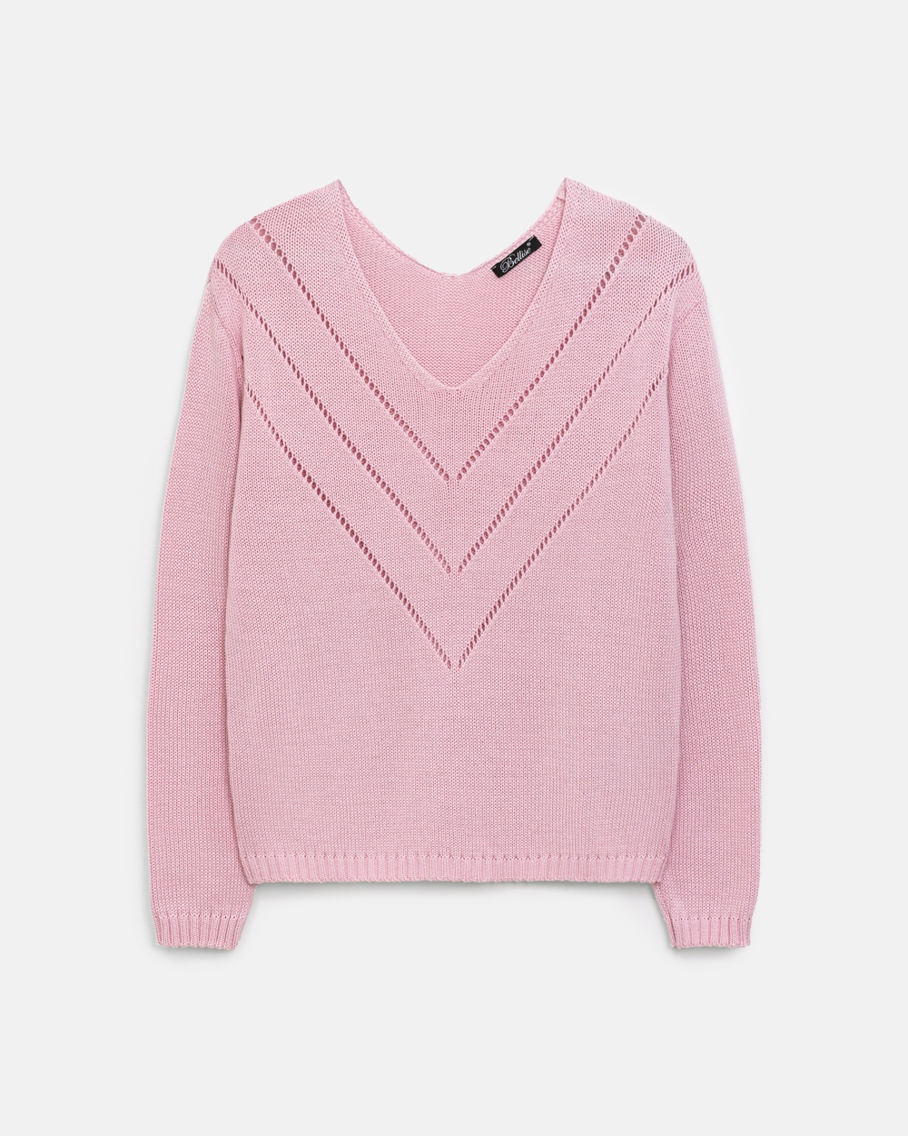 Лаконічний джемпер з акуратним візерунком спереду. Модель виготовлена з бавовняної пряжі з додаванням віскози щільним плетінням. Джемпер вільного силуету зі спущеною лінією плеча.