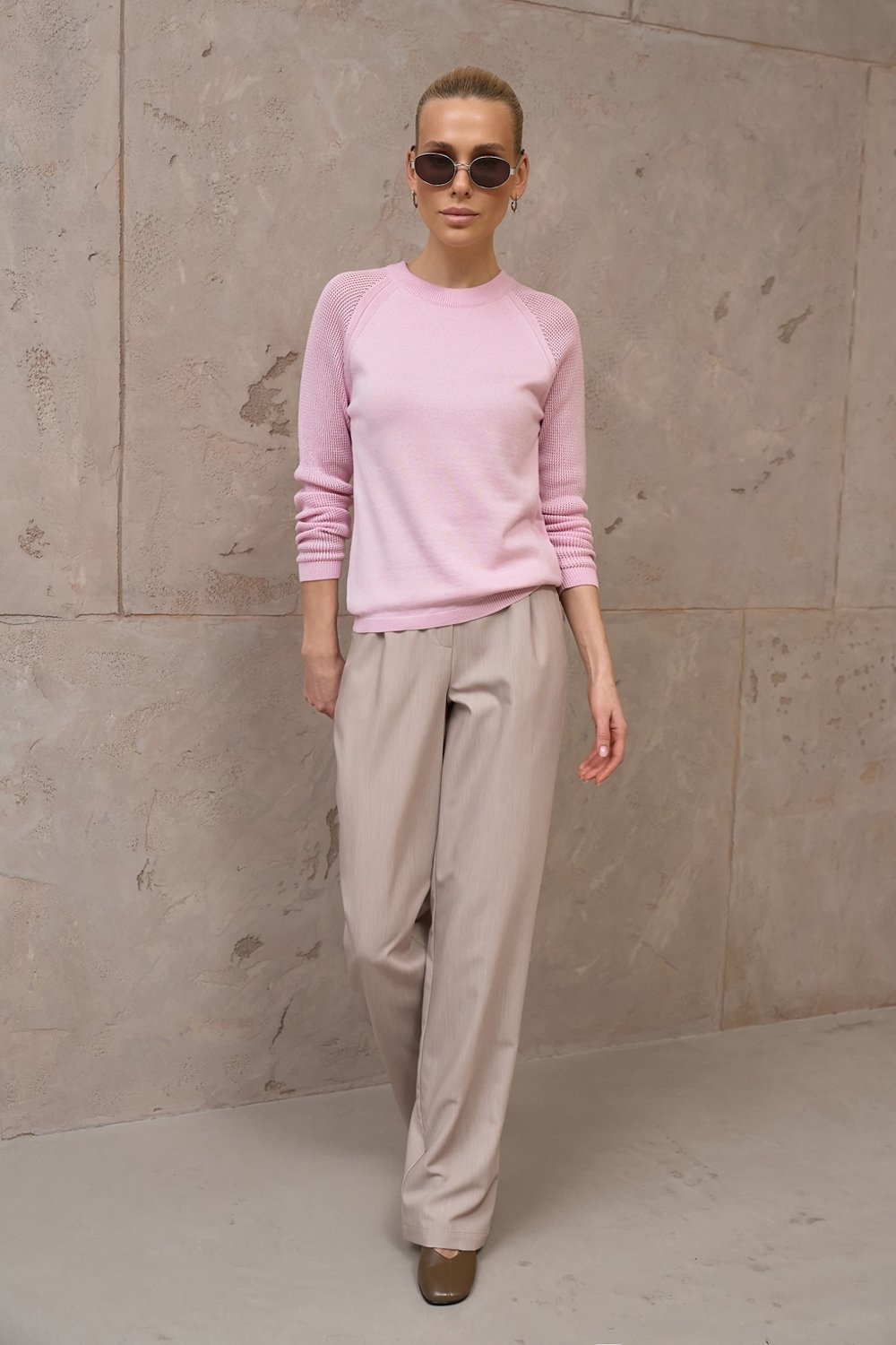 Витончений джемпер з акцентними ажурними рукавами. Модель виготовлена з бавовняної пряжі з додаванням віскози. Перед та спинка джемпера виконані в'язкою середньої щільності. Зручний рукав реглан.